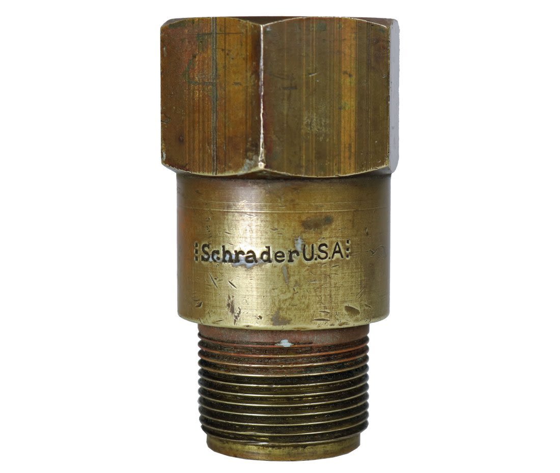 This is a World War 2 era Mark V divers non-return valve. This part was made by Schrader and is stamped with their name and USA. The valve is in original condition and is a period correct component for any World War II Mark V diving helmet. This part threads onto the air elbow, making your helmet that much more complete.