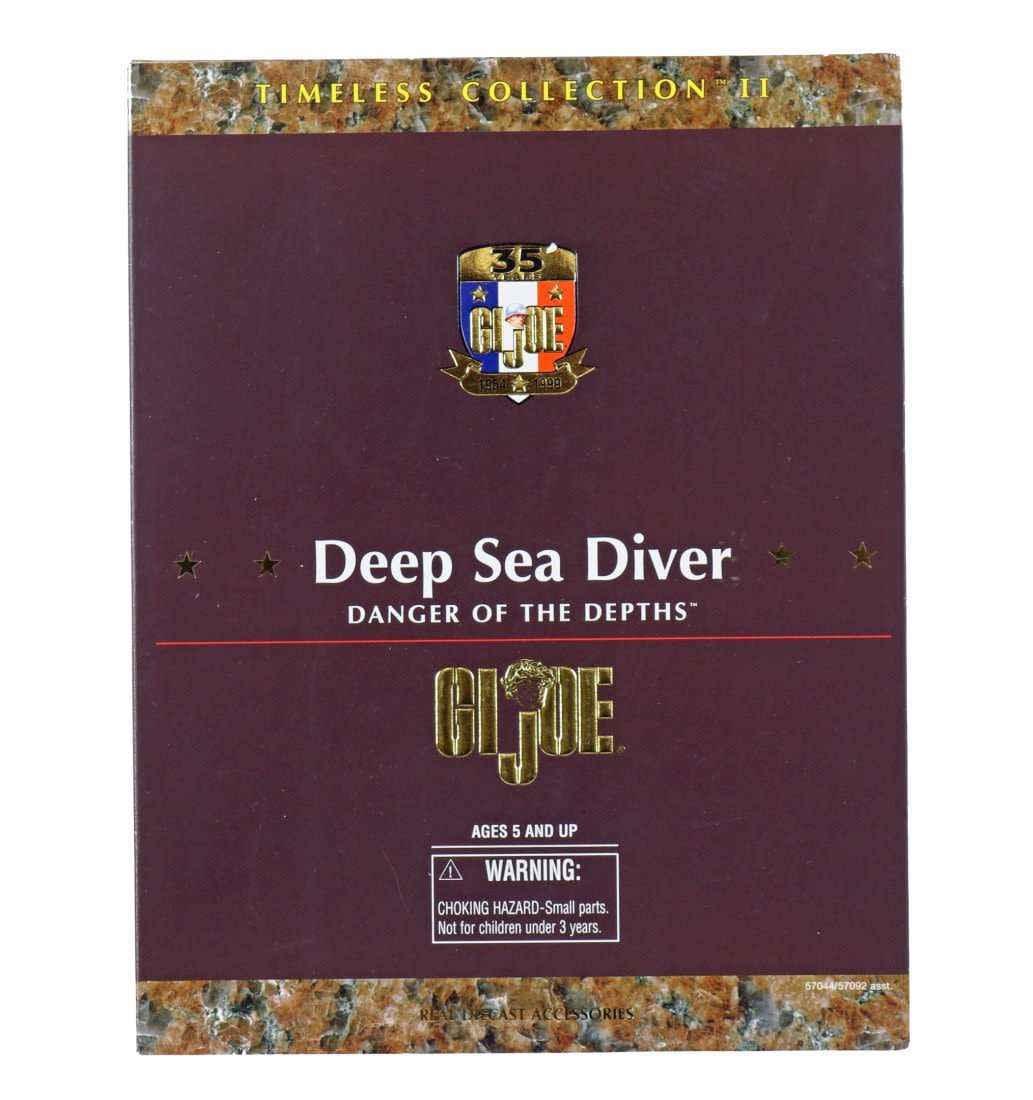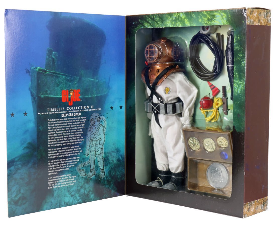 Highly detailed G.I. Joe Deep Sea Diver action figure! Brand new in box, this larger sized Mark V style diver was produced as part of the G.I. Joe Timeless Collection II. These action figures and very detailed accessories were made to be reminiscent of the original action figures from the 1960s and 1970s. Box is 13.5 by 10.5 inches in size, the diver is approximately 11 inches tall. Even in the box, this is a wonderful display piece in like new condition!