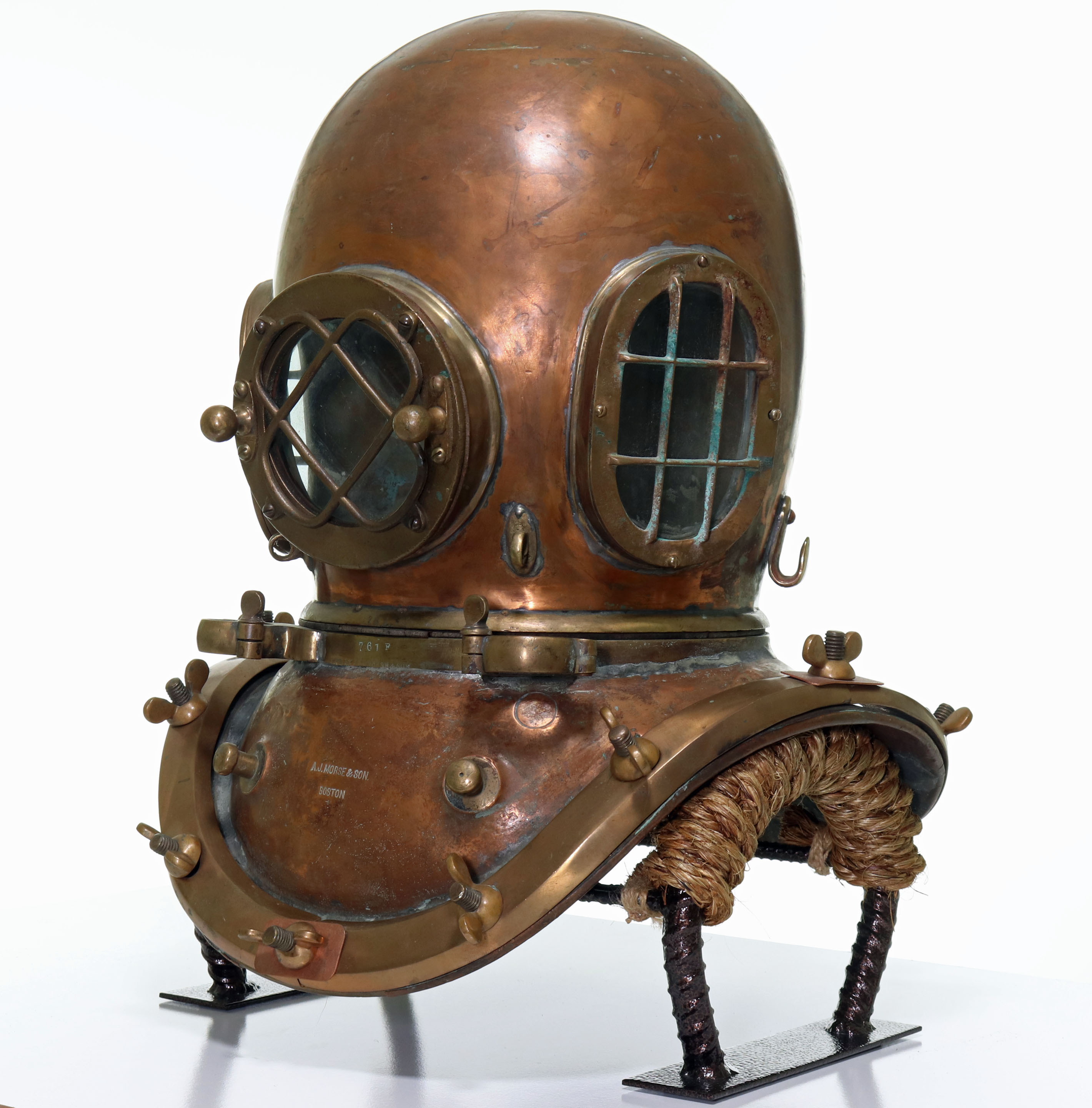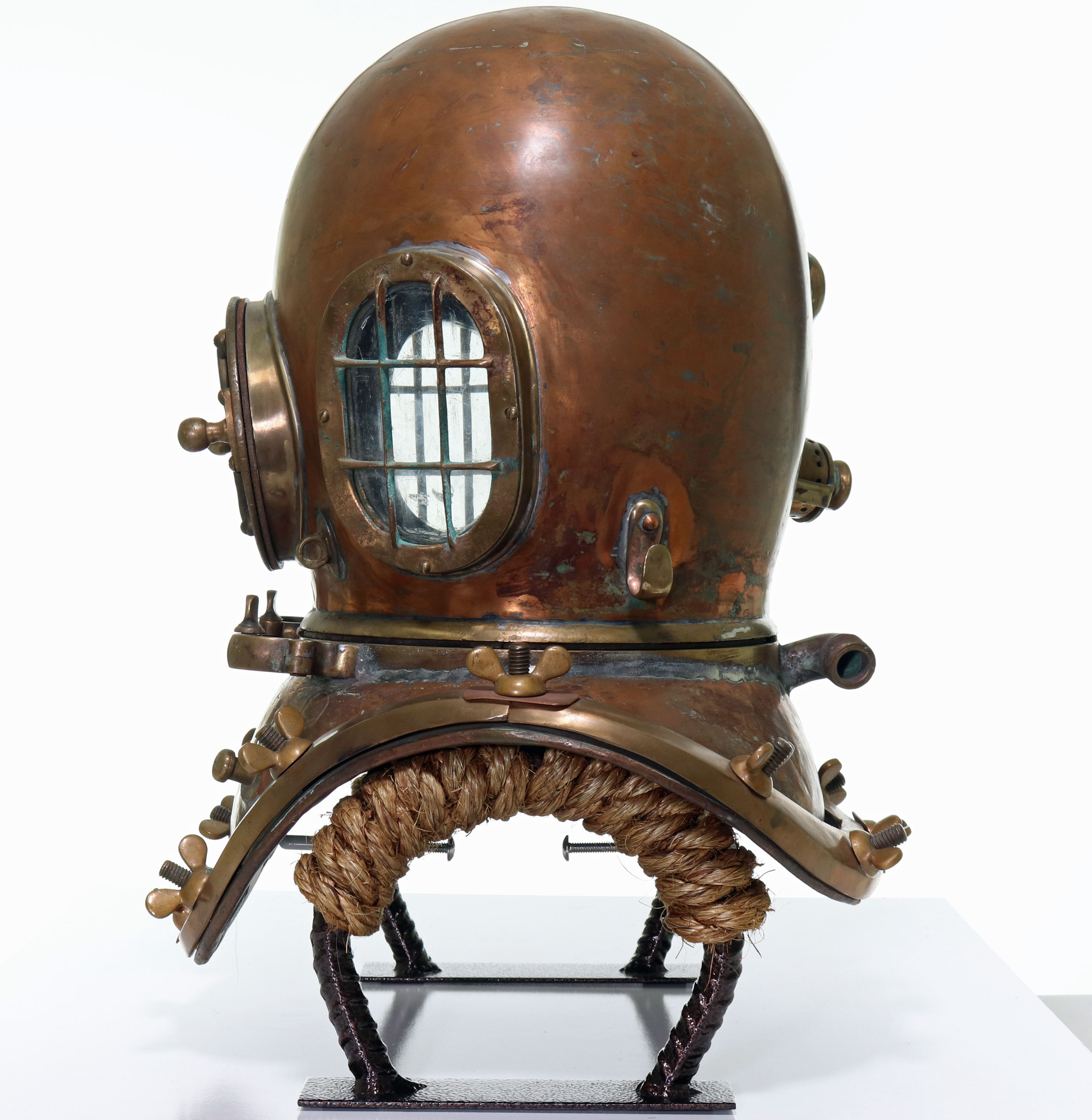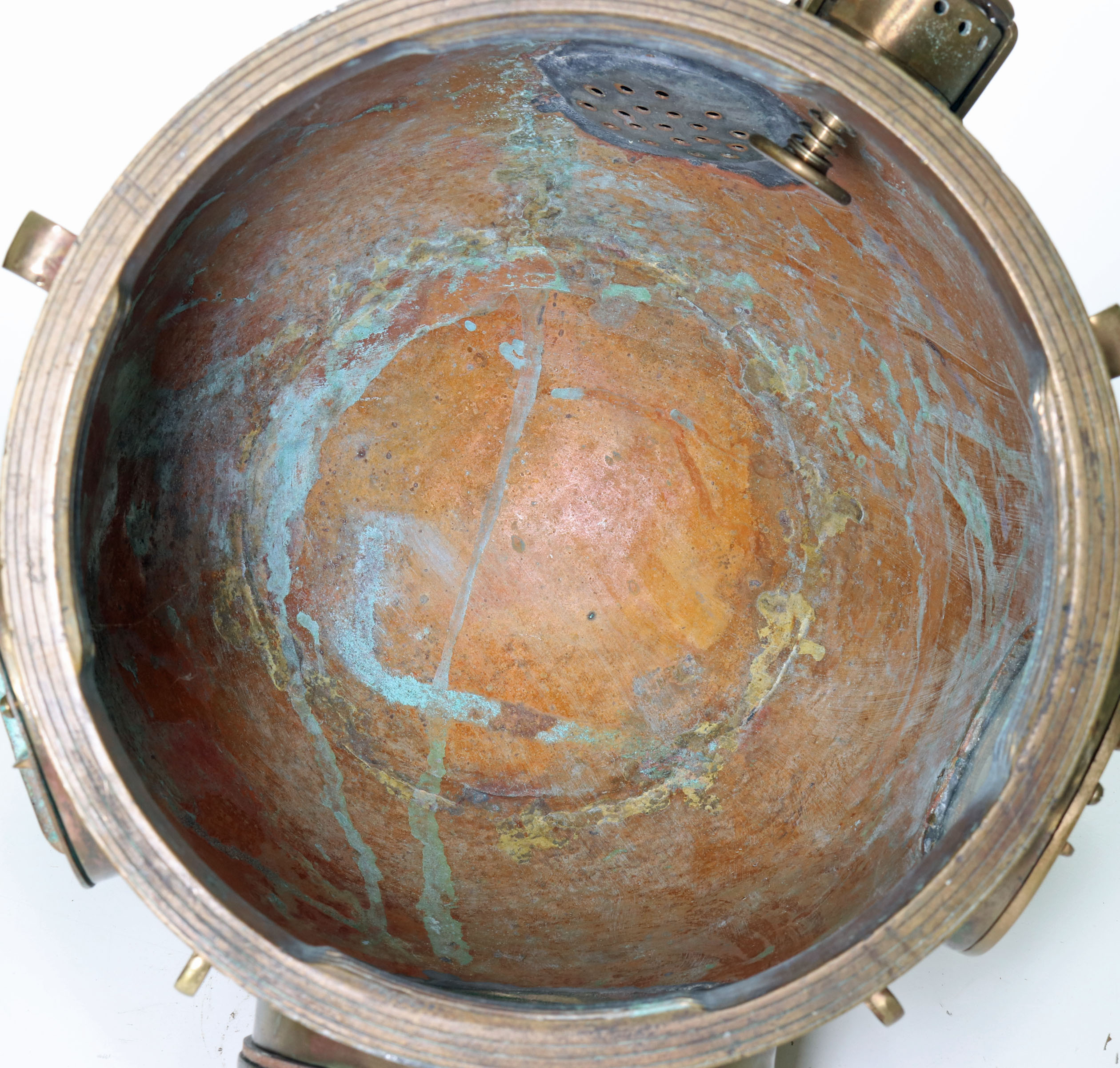 This helmet is in very nice condition and appears to have been professionally worked on, likely by Morse many years ago. The four brails and twelve wing nuts are contemporary. The internal neck ring air vent appears to have received some work as well. Overall, the work was done well, resulting in the preservation of this very impressive 19th-century American diving helmet!