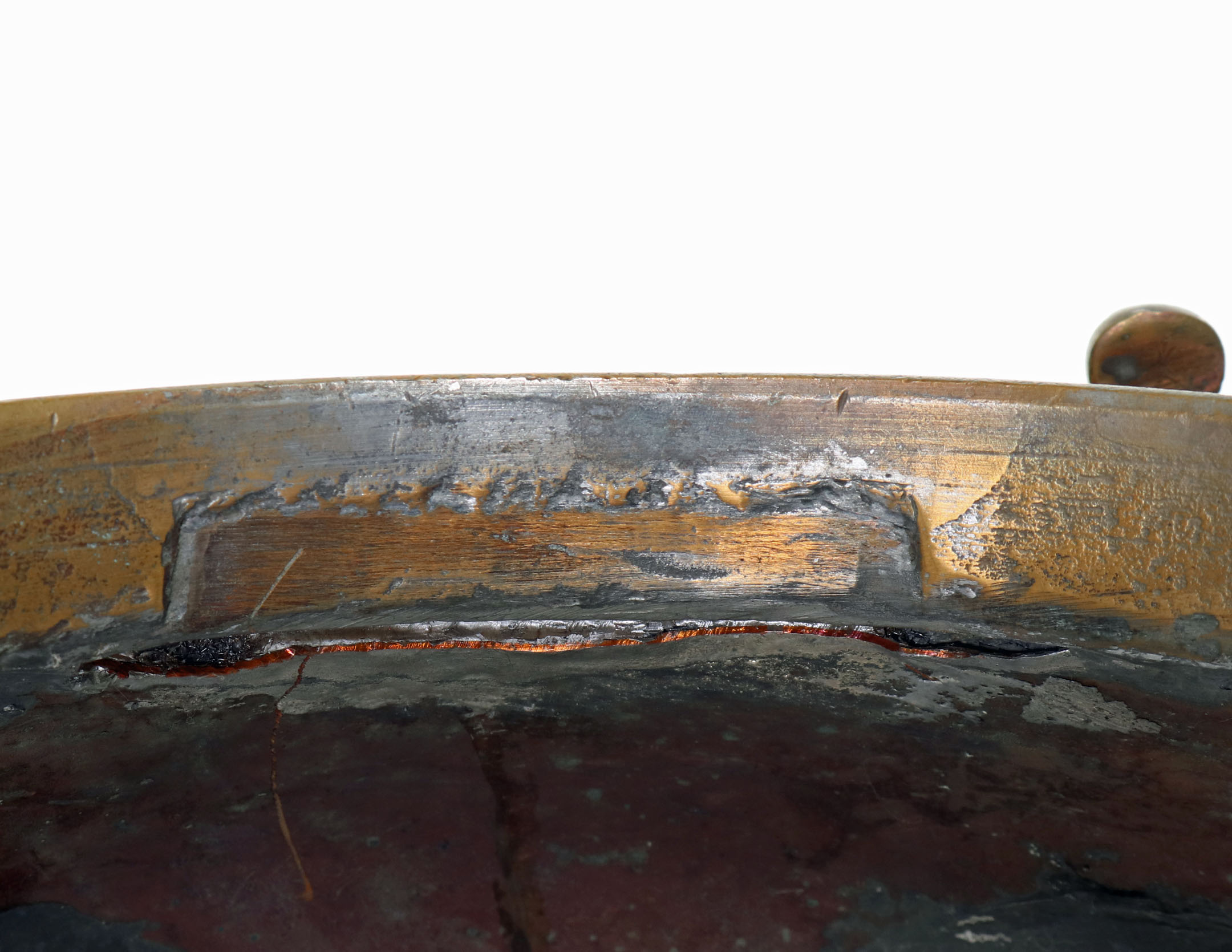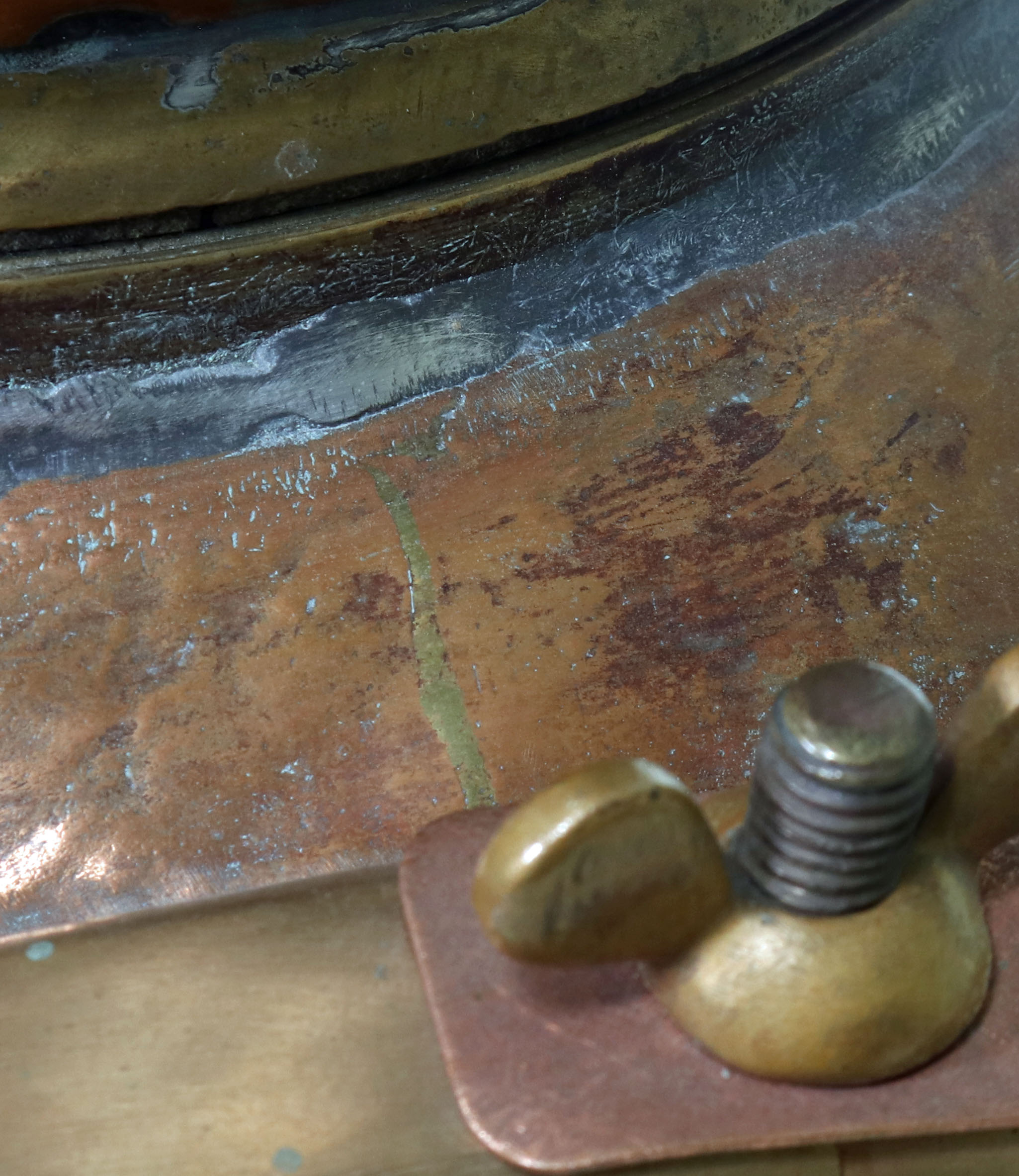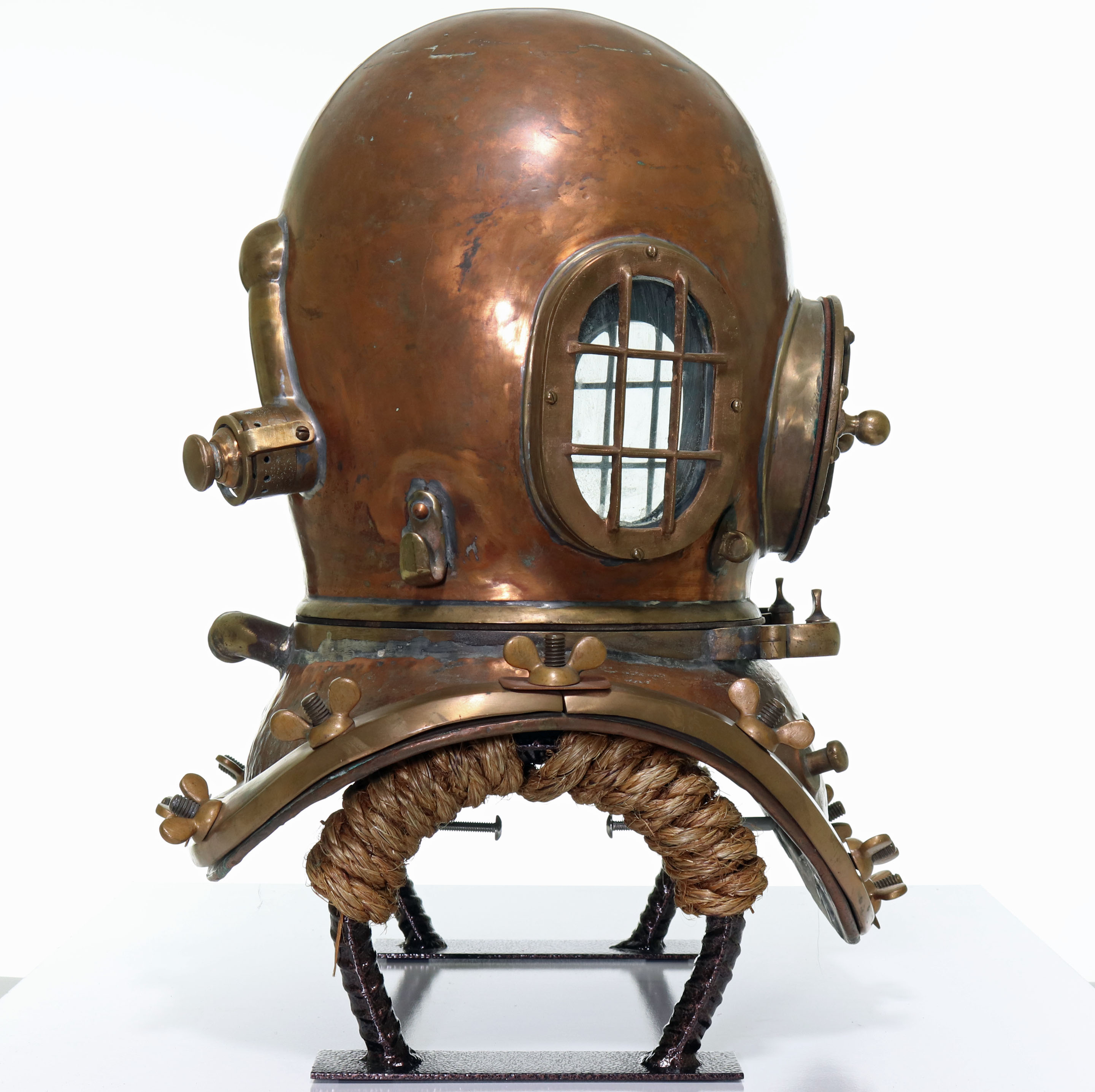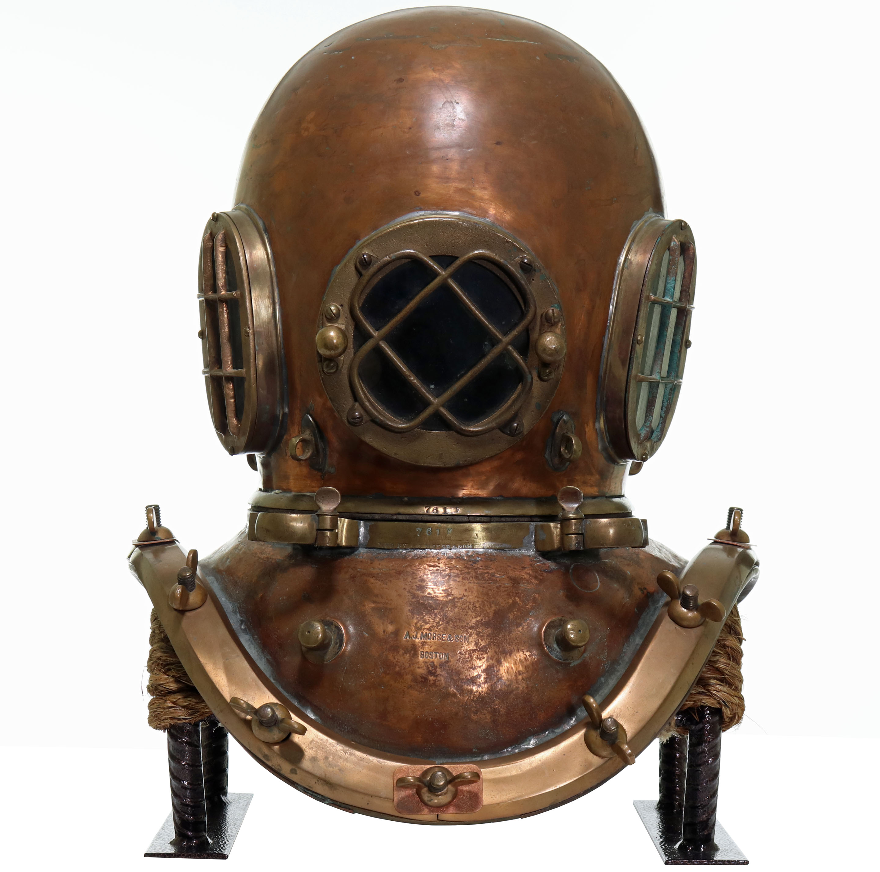This helmet is in very nice condition and appears to have been professionally worked on, likely by Morse many years ago. The four brails and twelve wing nuts are contemporary. The internal neck ring air vent appears to have received some work as well. Overall, the work was done well, resulting in the preservation of this very impressive 19th-century American diving helmet!