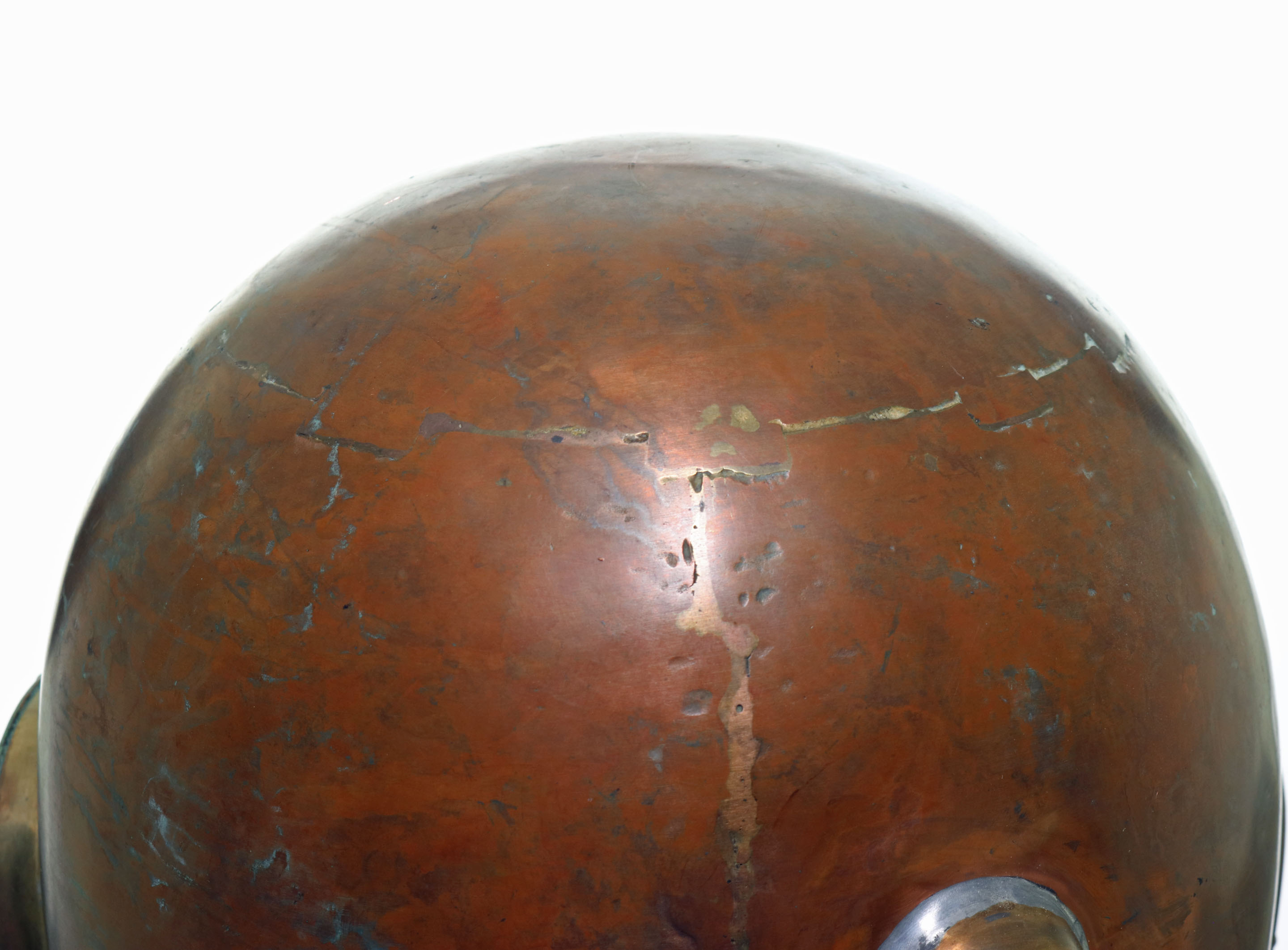 This helmet’s neck ring is non-recessed. The helmet’s breastplate and bonnet do feature the classic “castling” construction method. The bonnet, especially at the top and along the center back, clearly shows this method of assembling the copper in separate pieces.