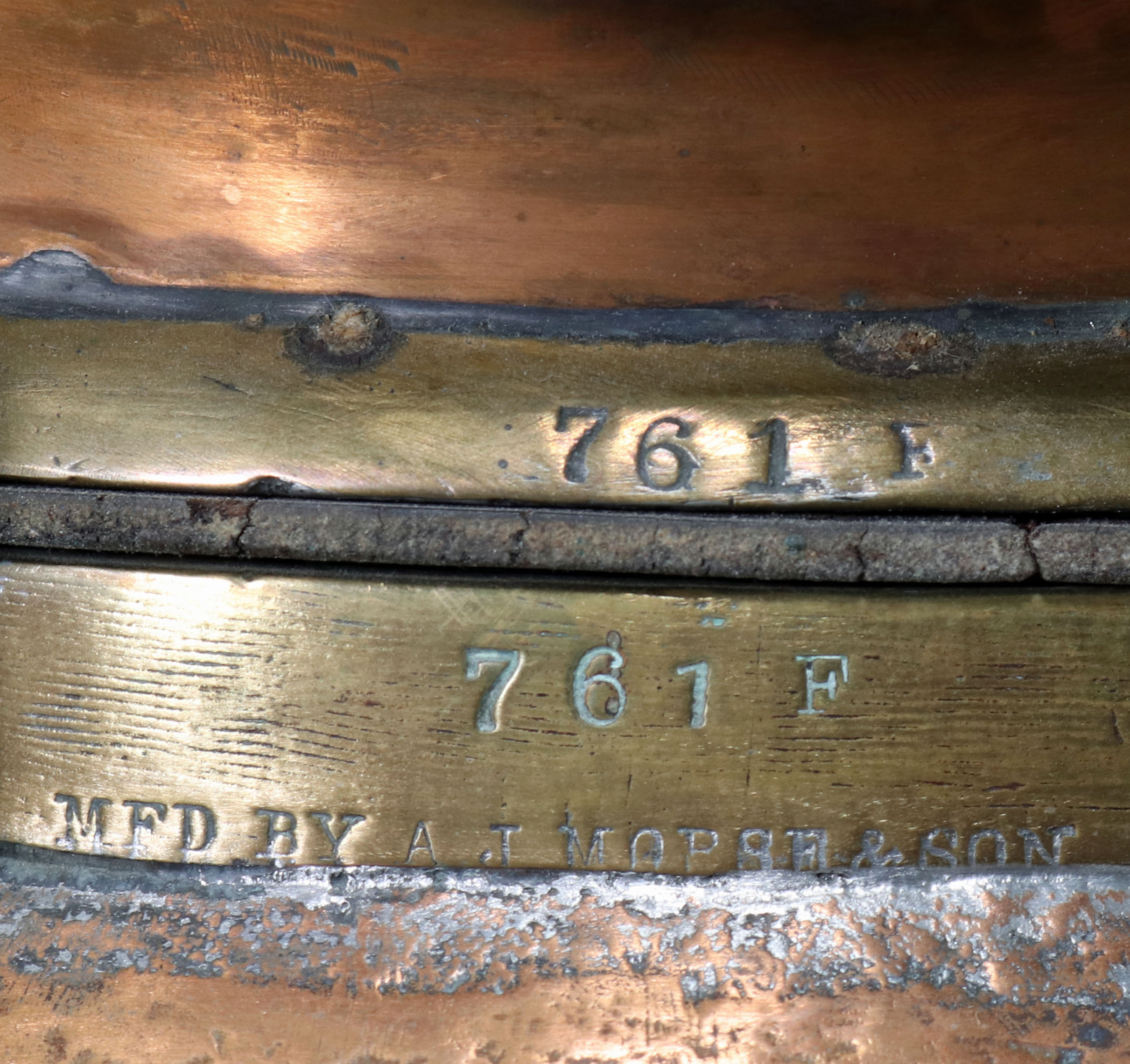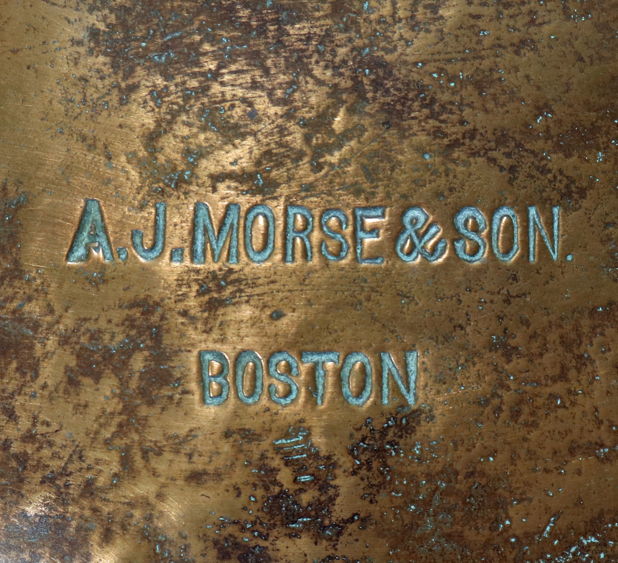 During the 19th Century, Morse generally did not use cast ID plates, but would simply stamp their name into the copper breastplate. This helmet is stamped A.J. Morse & Son Boston. The breastplate neck ring is also stamped MFD BY AJ MORSE & SON.
