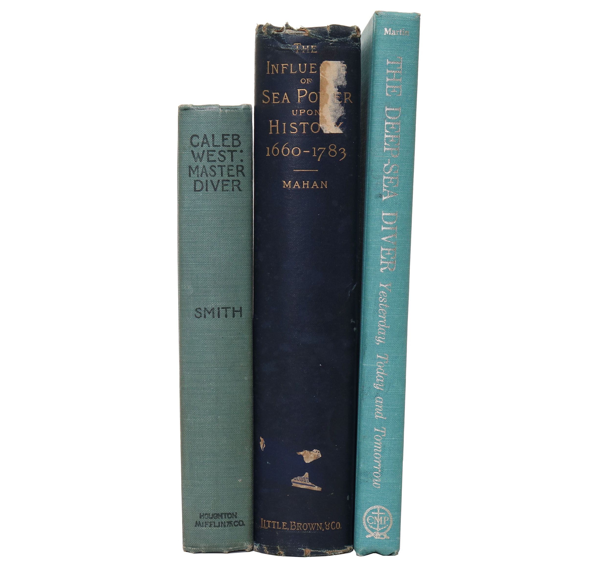 Grouping of three books, all hardcover. The first is Caleb West Master Diver by F. Hopkinson Smith 1906 378 pages overall excellent condition, second book is The Deep-Sea Diver Yesterday, Today and Tomorrow by Robert Martin 1978 213 pages in overall excellent condition. The third book is titled The Influence of Sea Power Upon History 1660-1783 by Captain A.T. Mahan, US Navy, 1895, Tenth Edition, 557 pages, well-worn with Asian stamps and writing on the inside cover.