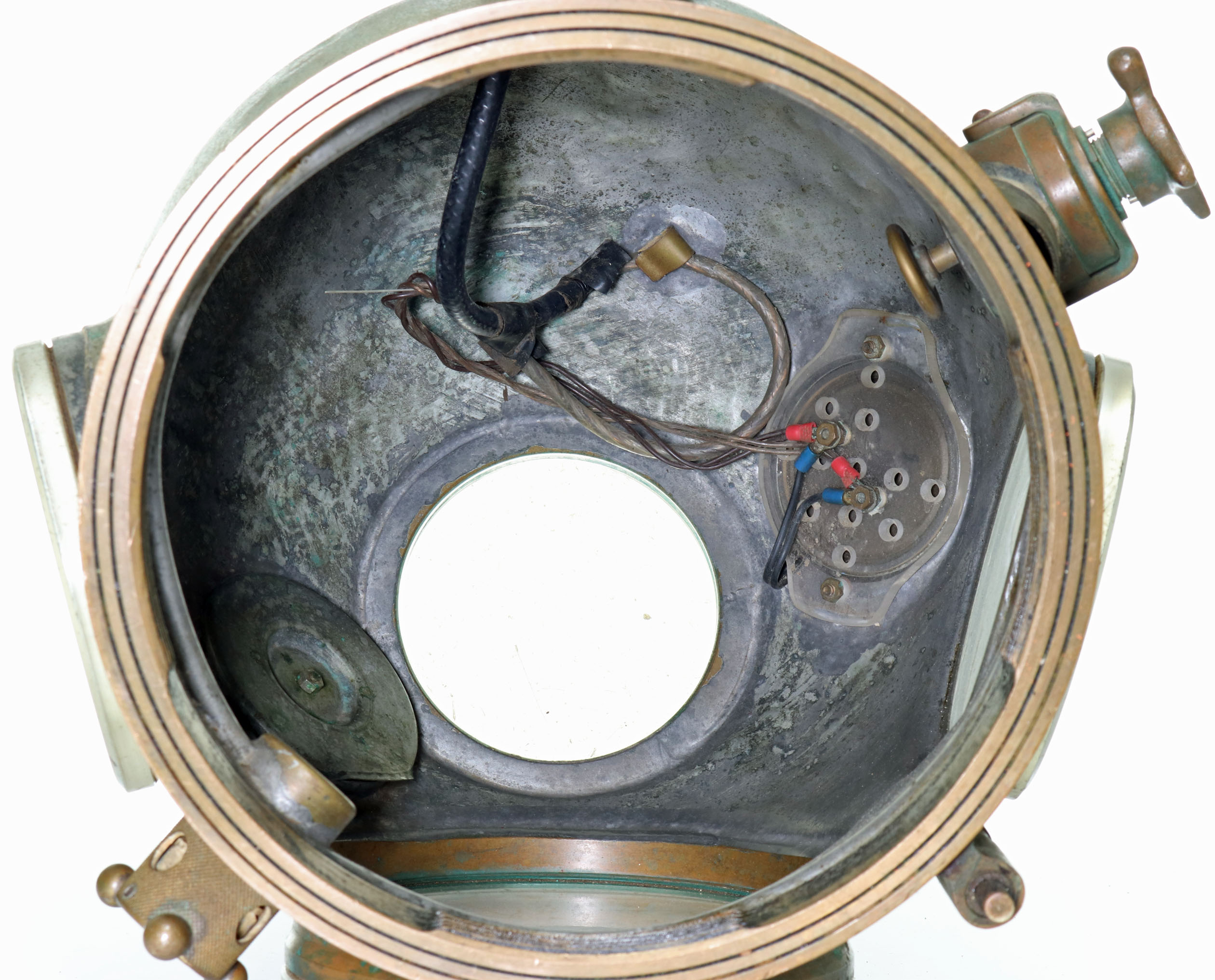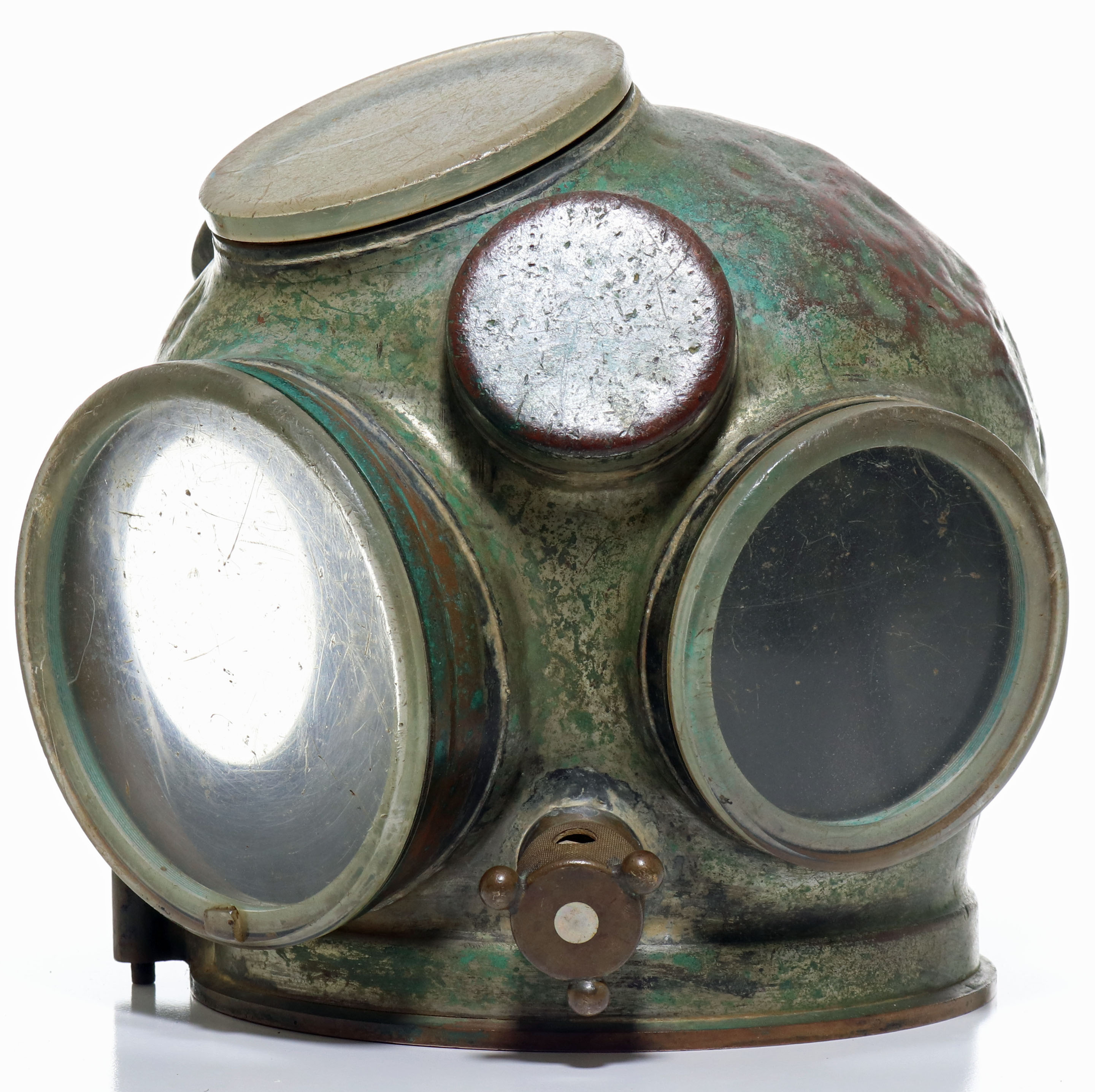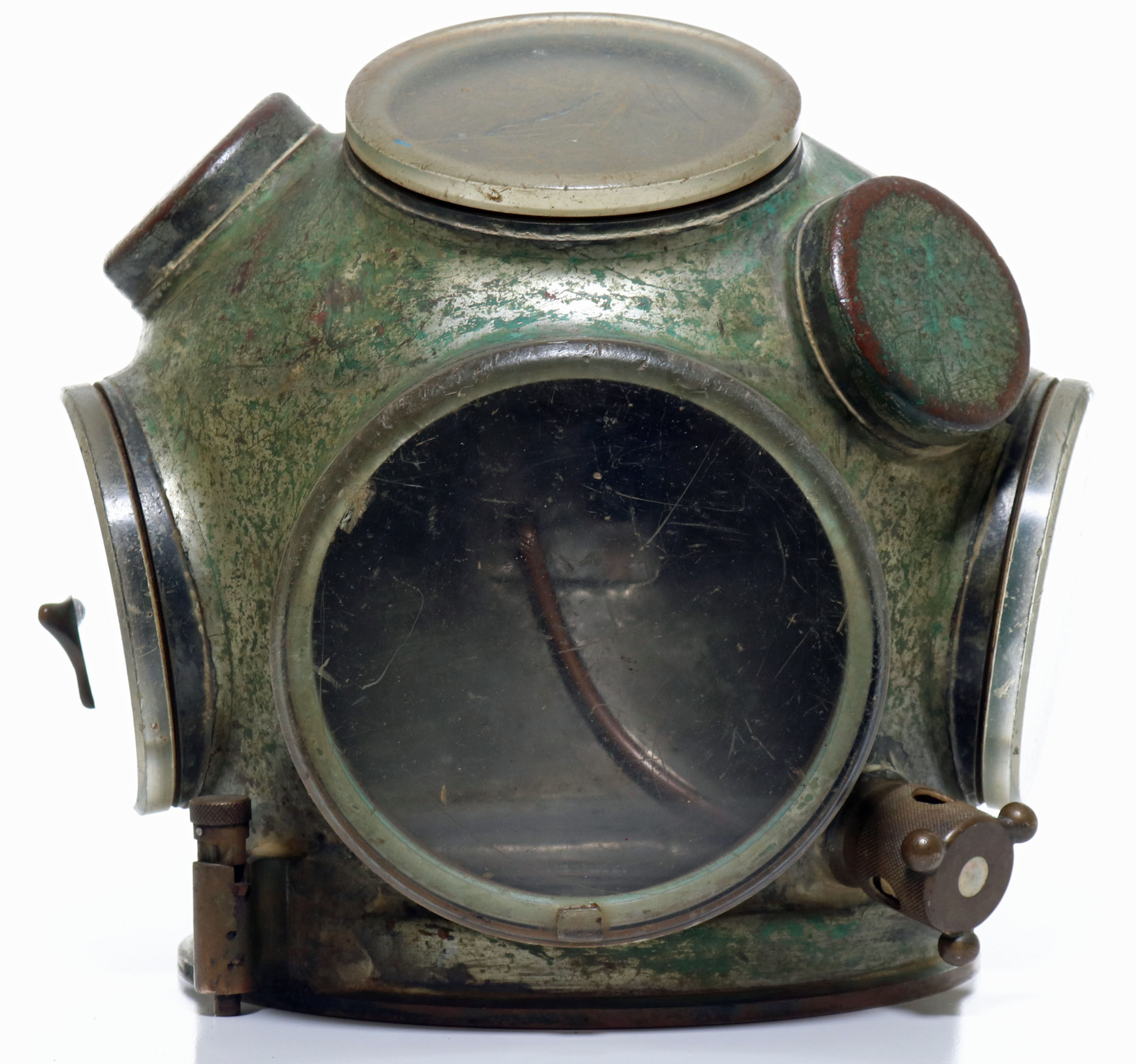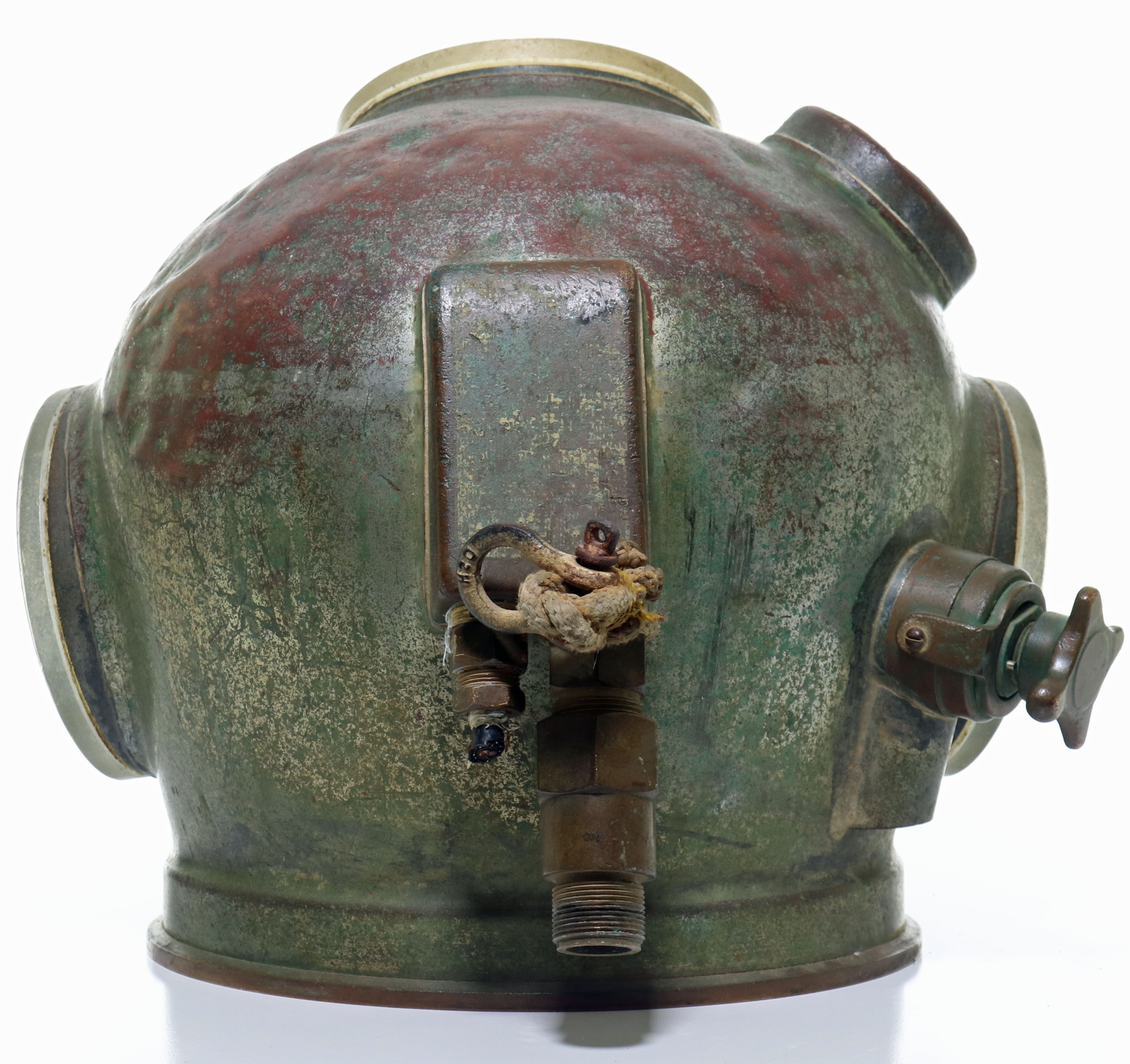 This classic vintage diving helmet bonnet (top) was manufactured by the renowned Japanese company Yokohama. This bonnet is in excellent original condition and still retains all its original hardware. The components include the acrylic ports, exhaust, spring-loaded safety pin, non-return valve, dual communications cups, old communications wiring and reproducers, and exhaust chin button.