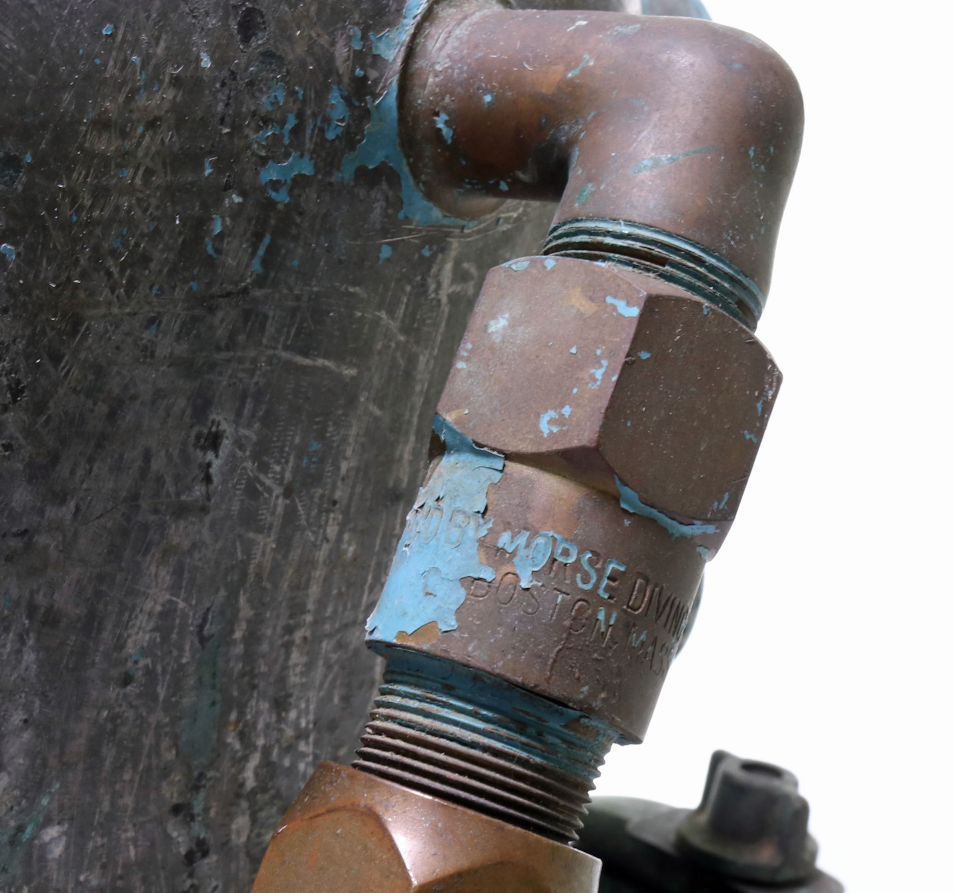 This helmet’s design and the time it was constructed could be considered the pinnacle of copper and brass commercial helmet construction. This four-light (windows or ports) twelve bolt helmet was made by Morse around 1967. During this time, a revolutionary change in diving helmet design was taking place using fiberglass and other materials. This classic Morse helmet embodies the look and function of an iconic design that, during the late 1960s, was on the decline.