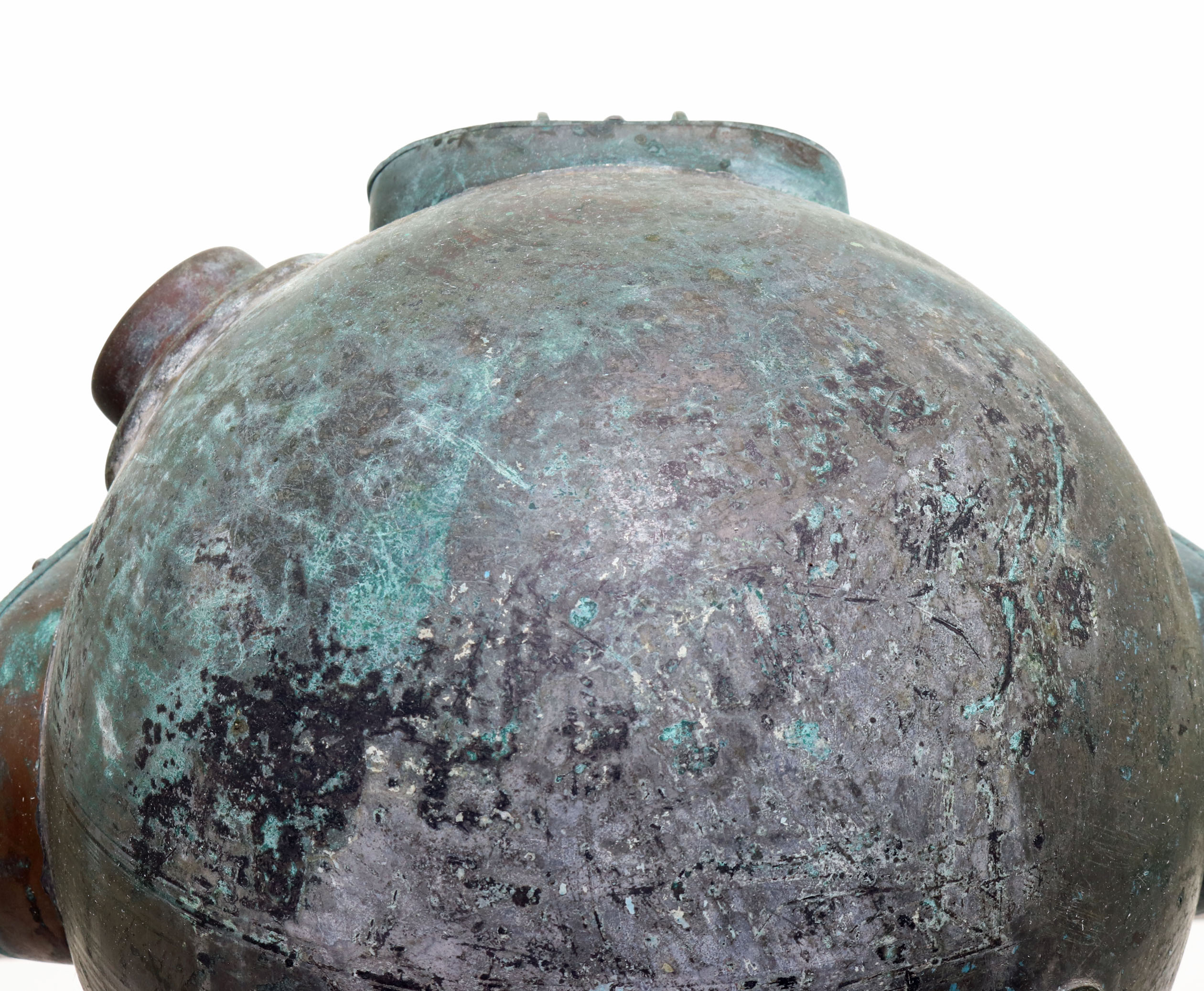 This helmet features a striking gray and green consistent patina to its copper body, giving it a unique vintage appearance. The exposed brass hardware also provides an interesting visual contrast. The helmet appears to have been painted blue long ago. A majority of that paint has come off, likely from use in saltwater. This helmet was only recently discovered in the Gulf of Mexico (America) region. If you are considering a classic commercial diving helmet, this would make an excellent choice.