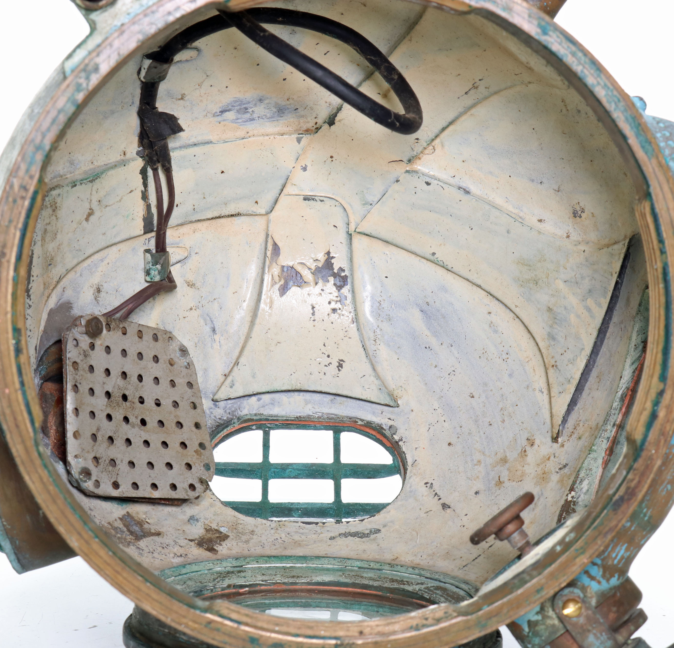 The helmet features the traditional horizontal side ports with the optional fourth port on the top. The large threaded faceplate provided superior visibility for the diver. The helmet also features a BTE exhaust, communications cup, standard air fitting with a Morse non-return valve and whip (hose), four copper brail shims, spring-loaded safety pin, and a communications fitting. Inside the bonnet, the air vents, exhaust chin button, and old communication wire and reproducer (speaker) are still intact.