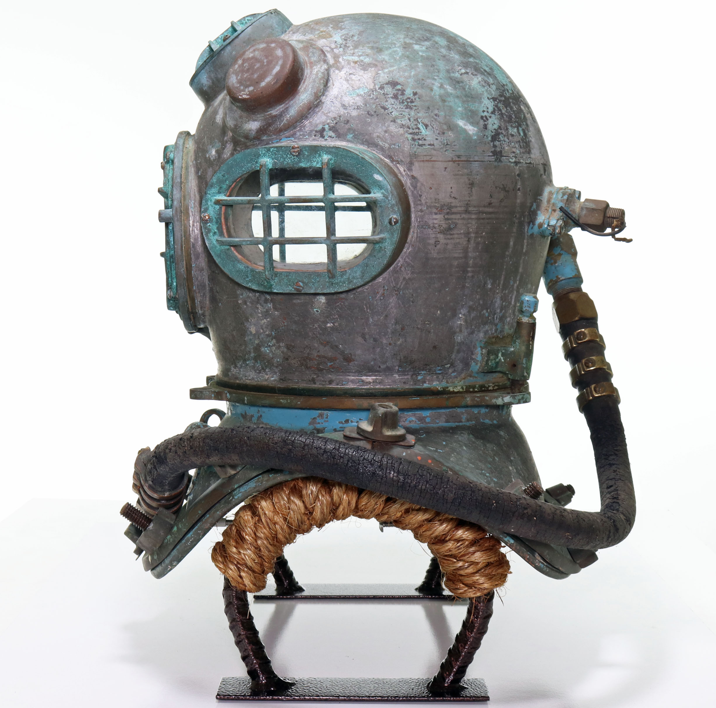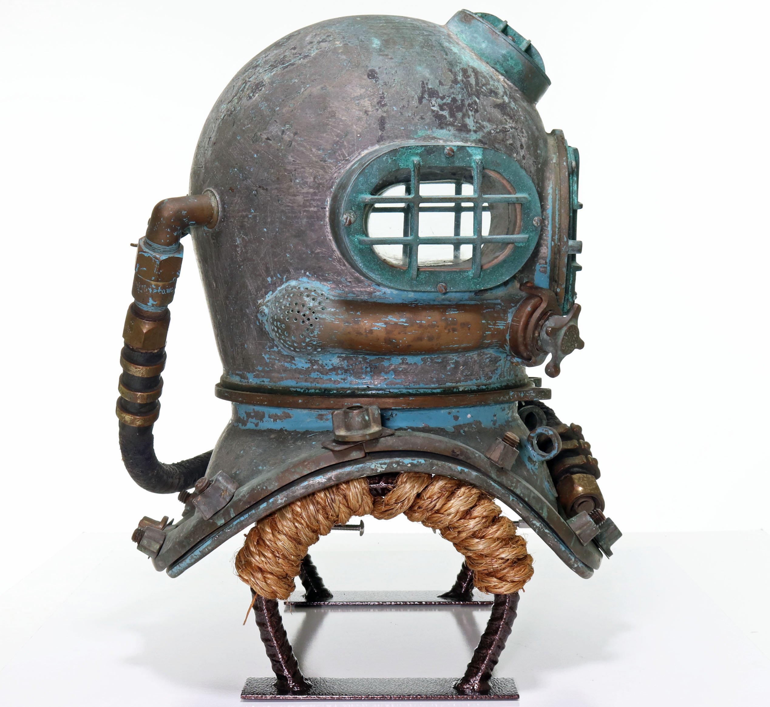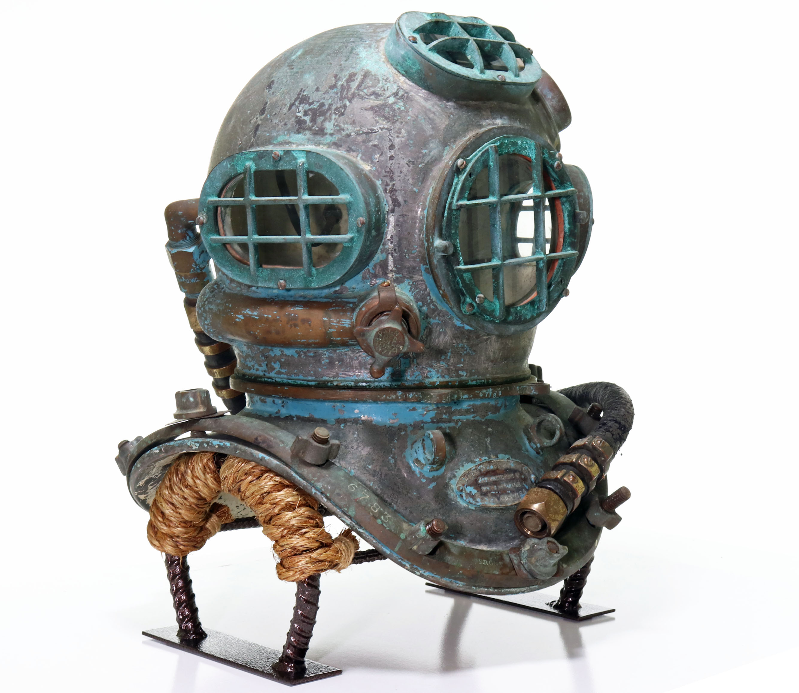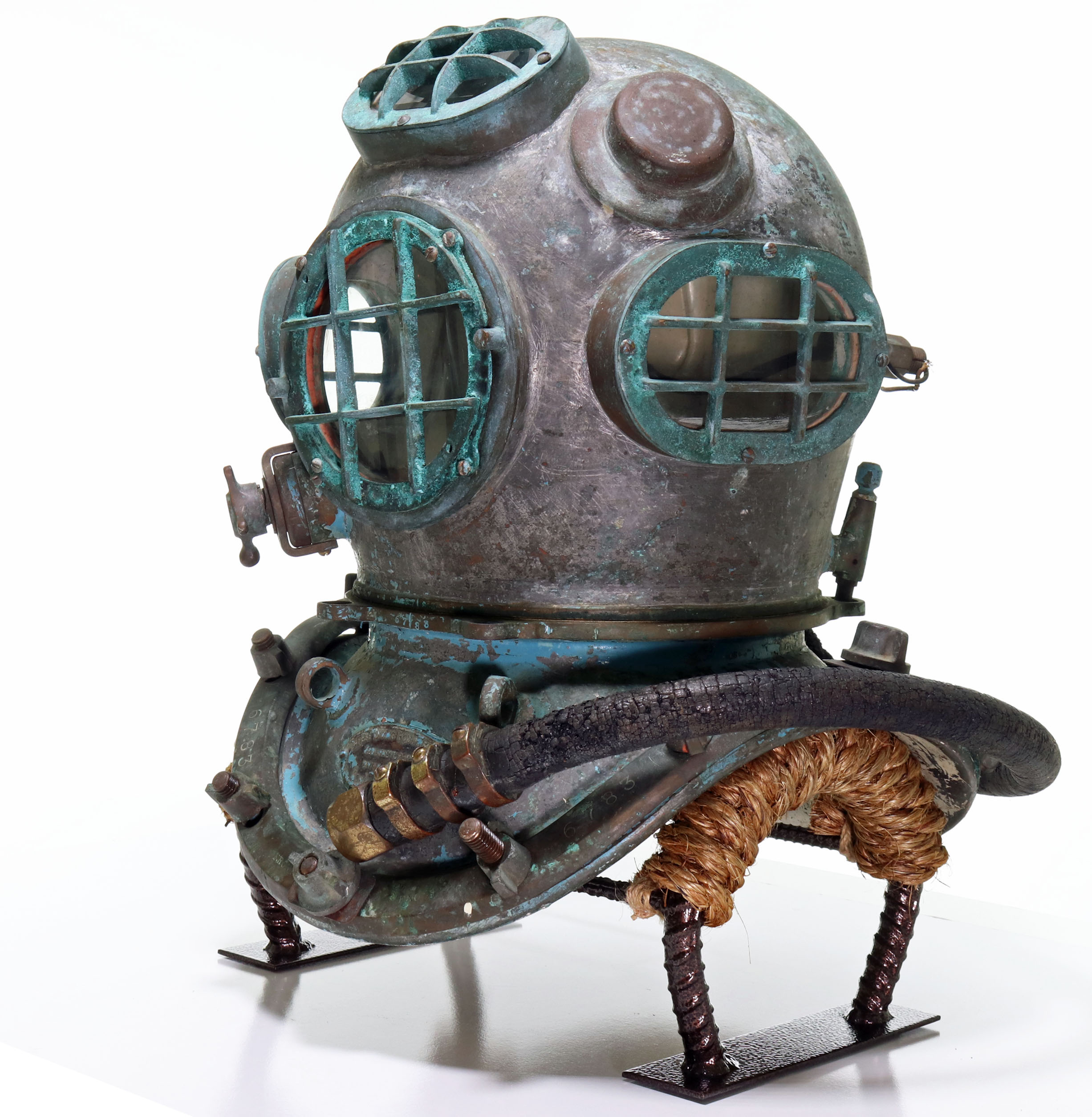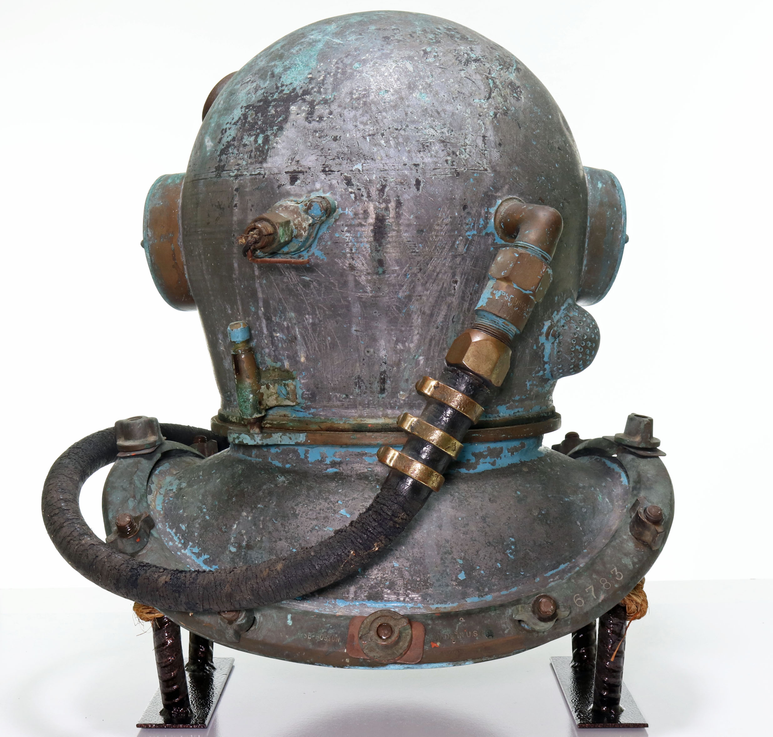 This helmet was made by the Morse Diving Equipment Company, located in Boston, MA. This company started making diving helmets and related equipment in the mid-19th Century and continues to do so in the 21st Century. Their helmets are quintessential pieces of American industrial design and iconic diving history.