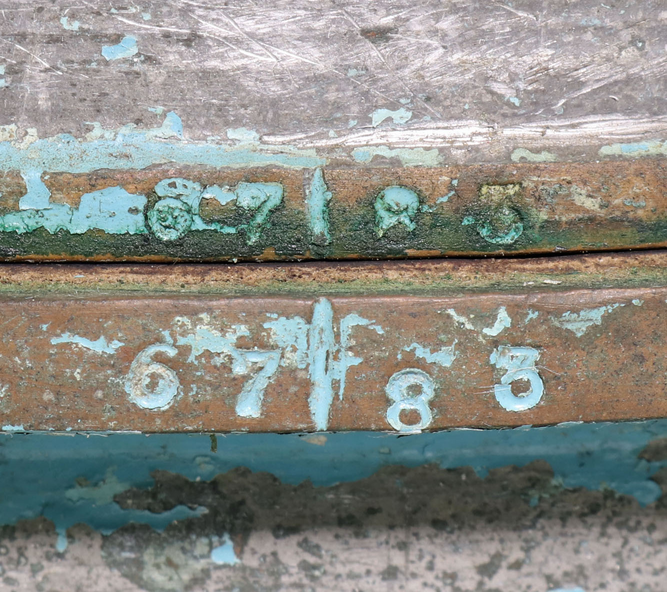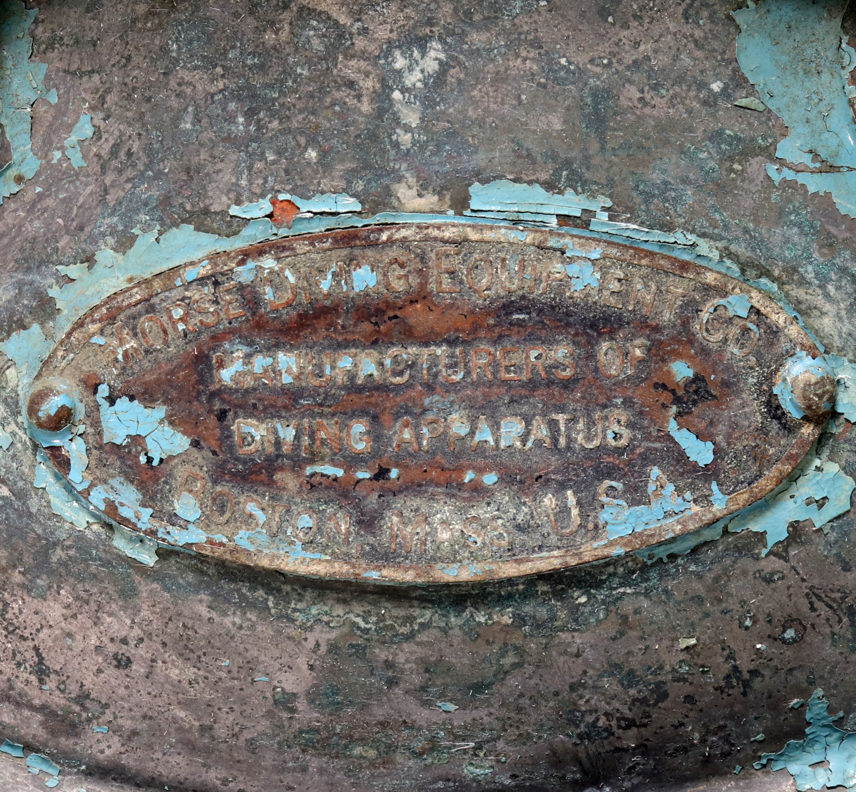 The breastplate features a seldom-seen oval ID plate, which says Morse Diving Equipment Co., Manufacturers Of Diving Apparatus, Boston, Mass, USA. The helmets serial number, 6783 is matching on all six locations.