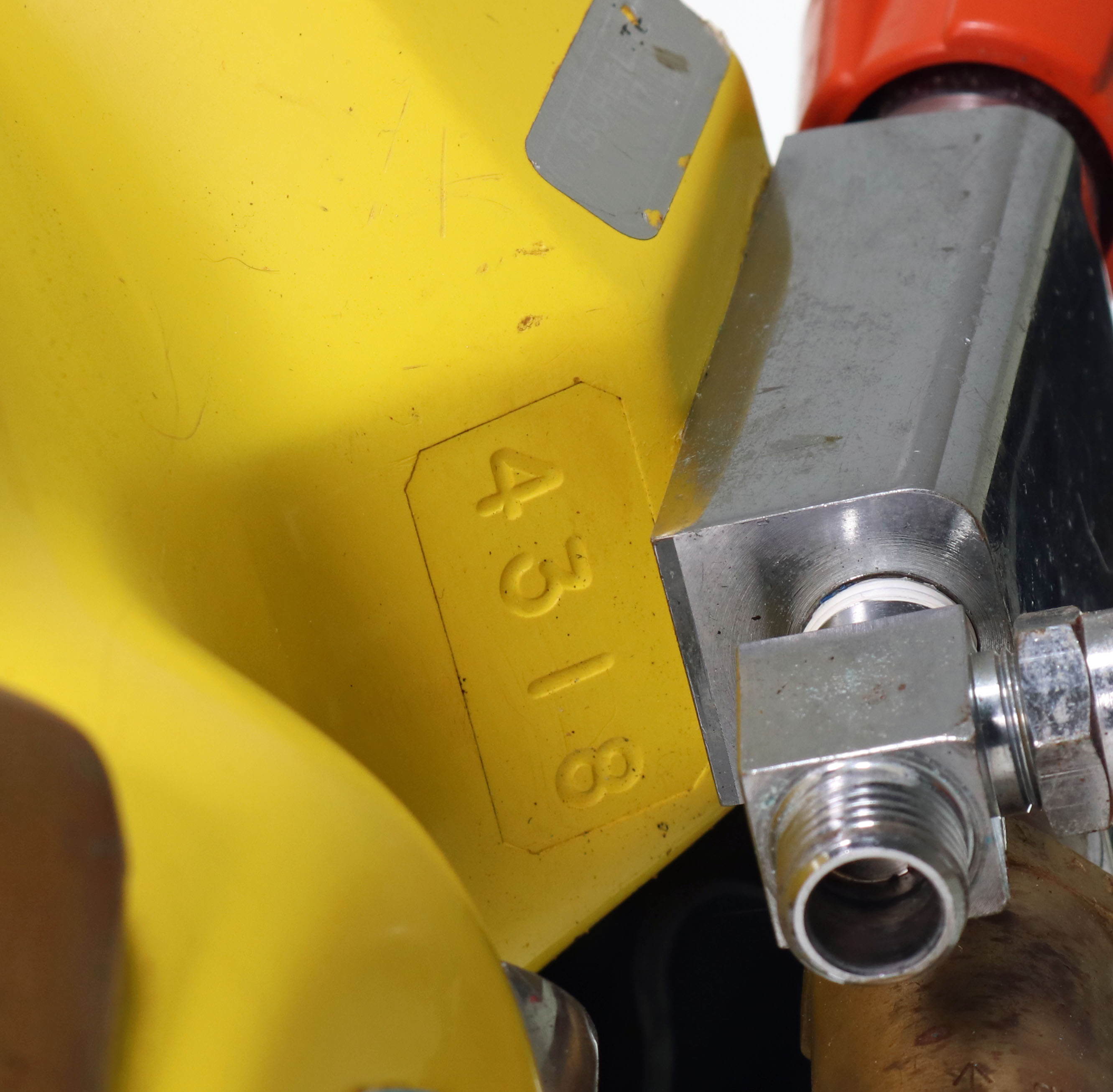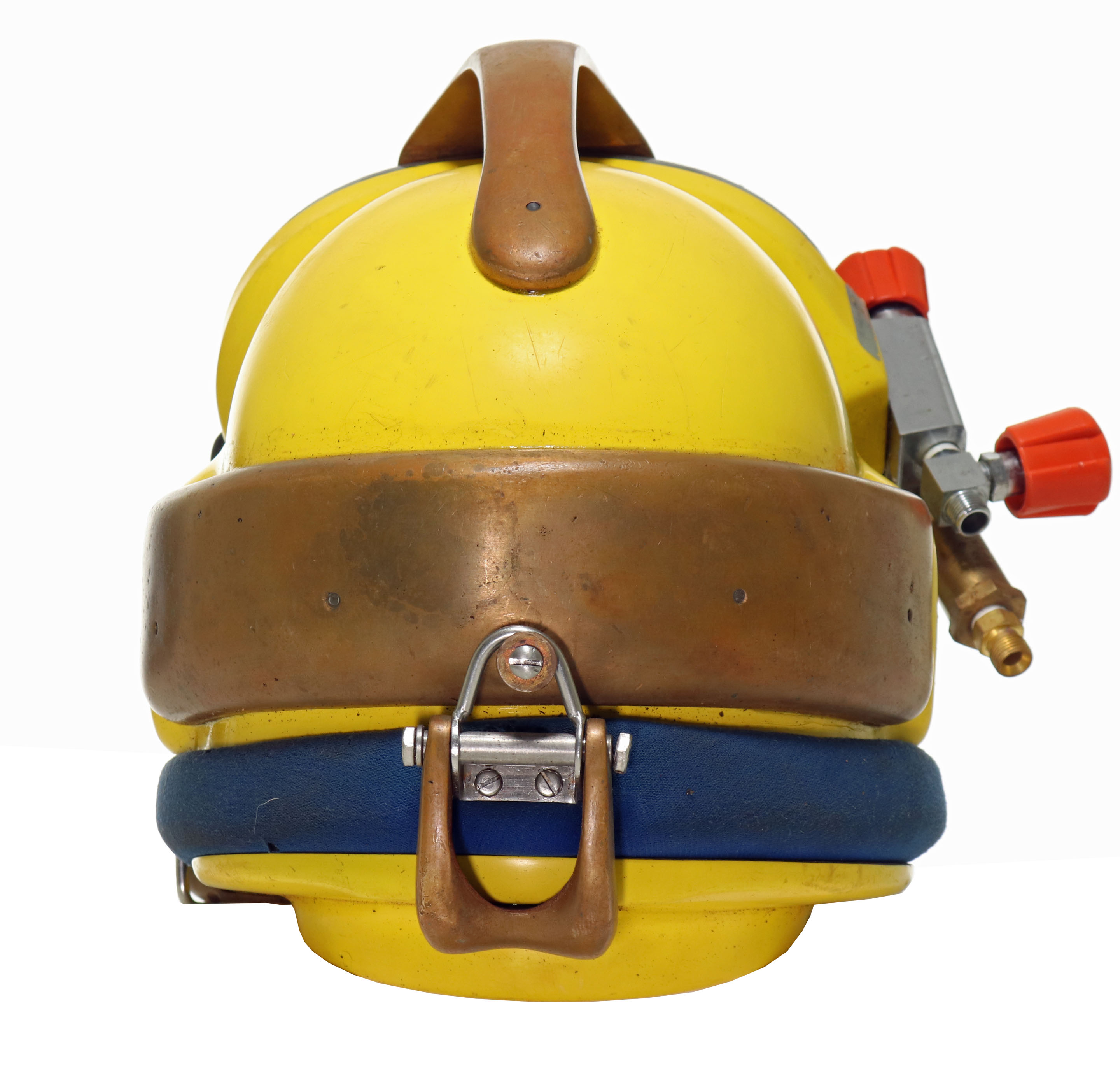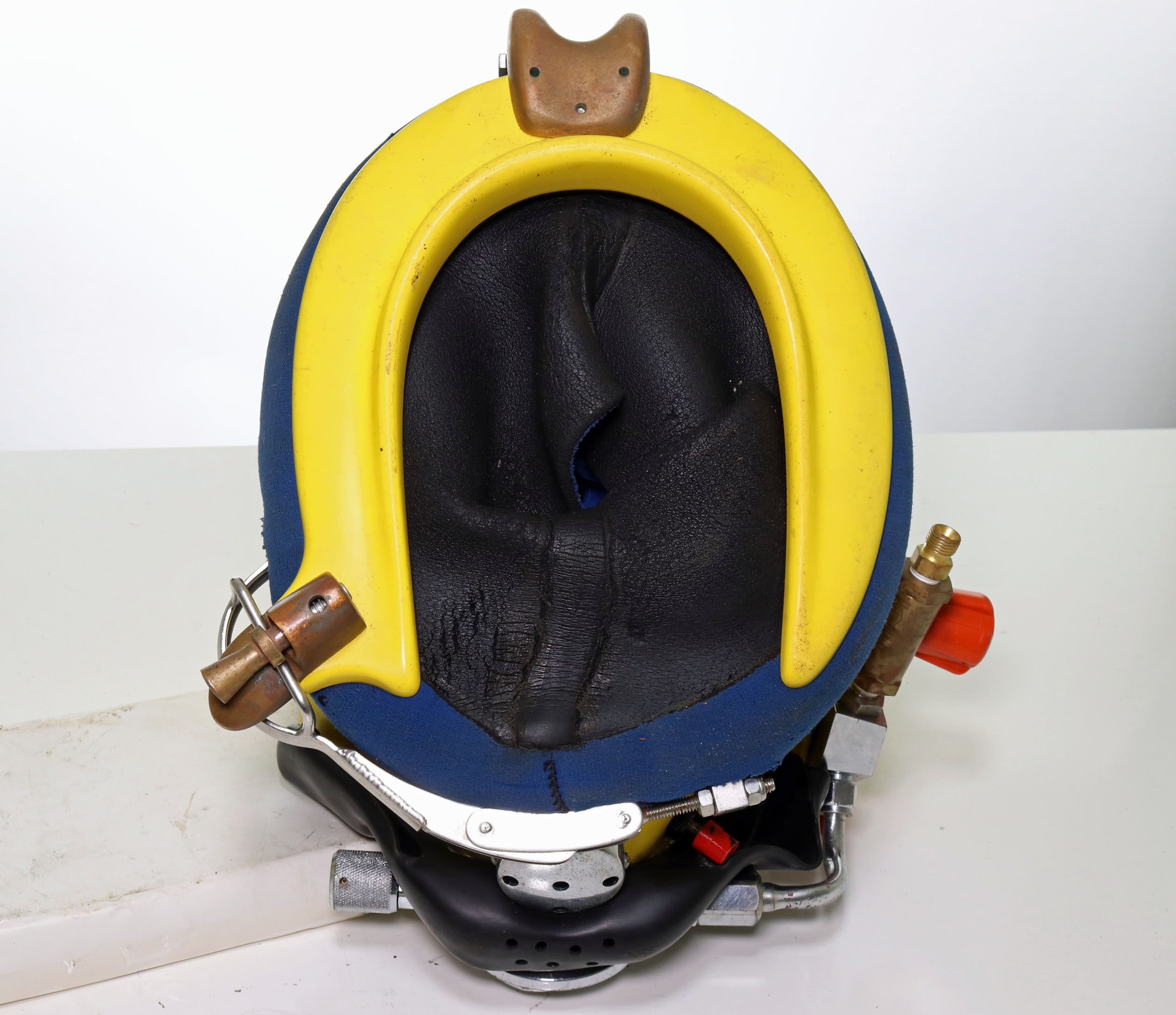 A representative at Kirby Morgan made the following comments regarding this helmet’s orange knobs: “Before the KMB 18 was introduced, our Bandmasks (KMB8/9/10) were made by US Divers and used the orange knobs. Once we took over the manufacturing, we retained the remainder of their stock which included the orange knobs. So the orange knobs were a temporary factory color from KM. So the consensus here is that they were the original parts that came with the helmet.”