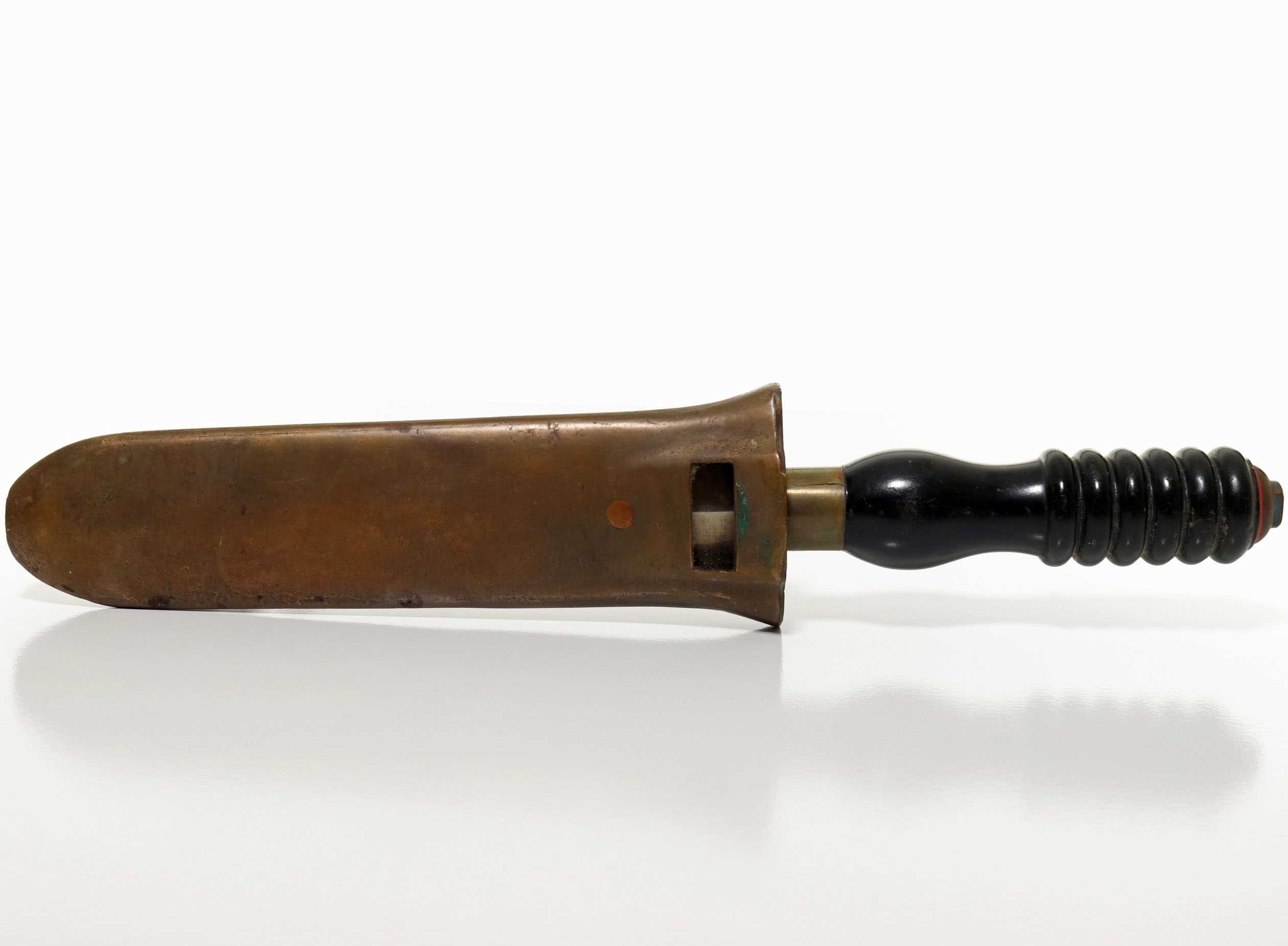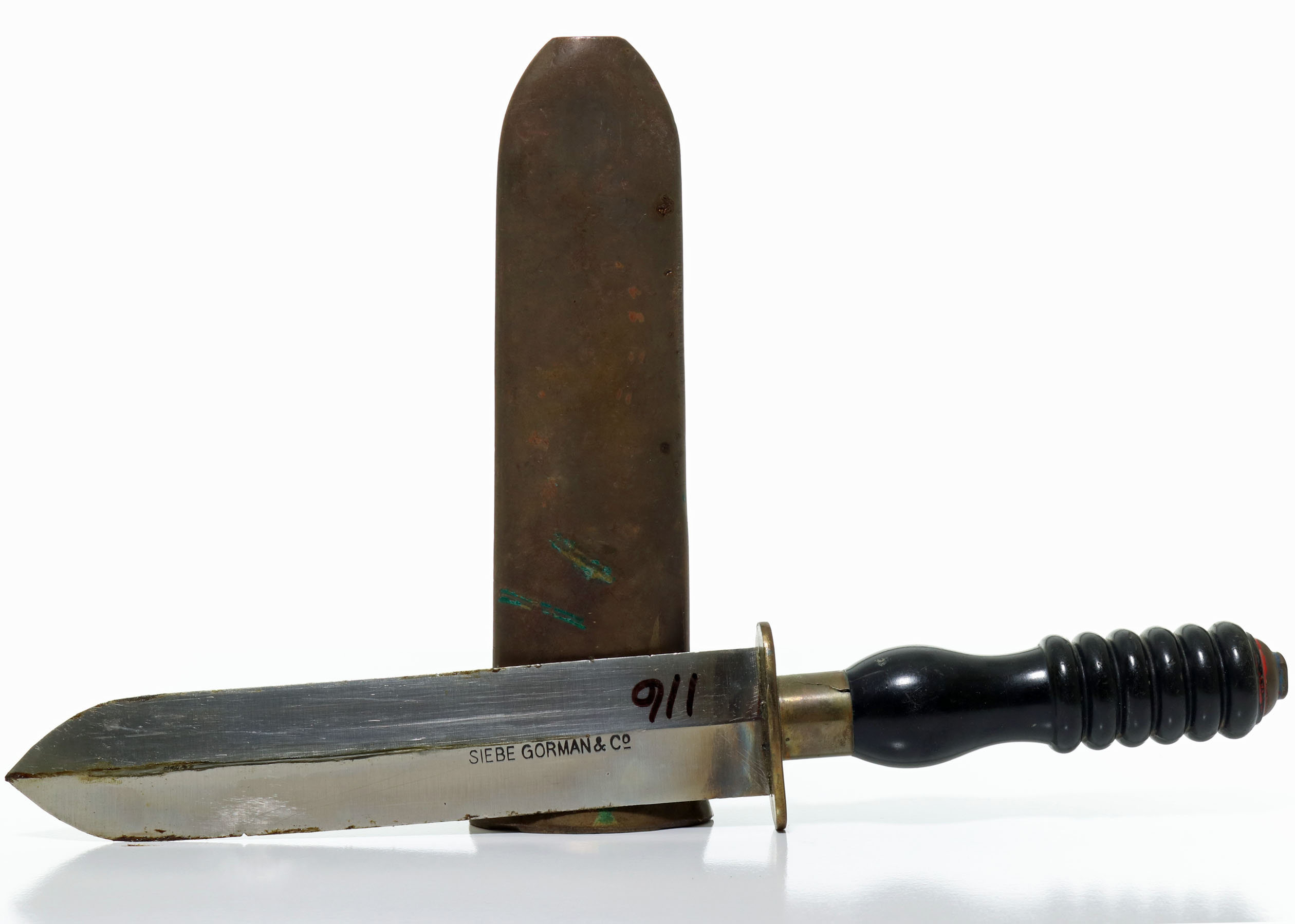 Presented is a replica Siebe Gorman & Co. non-magnetic knife. This example features a brass sheath. The blade with two sharp edges features Siebe Gorman & Co on one side. The blade is steel, but not magnetic. A black Bakelite handle with brass hardware is present. The knife appears to have been used but is well taken care of. The number in black on the blade is written with a Sharpie and can be cleaned off.