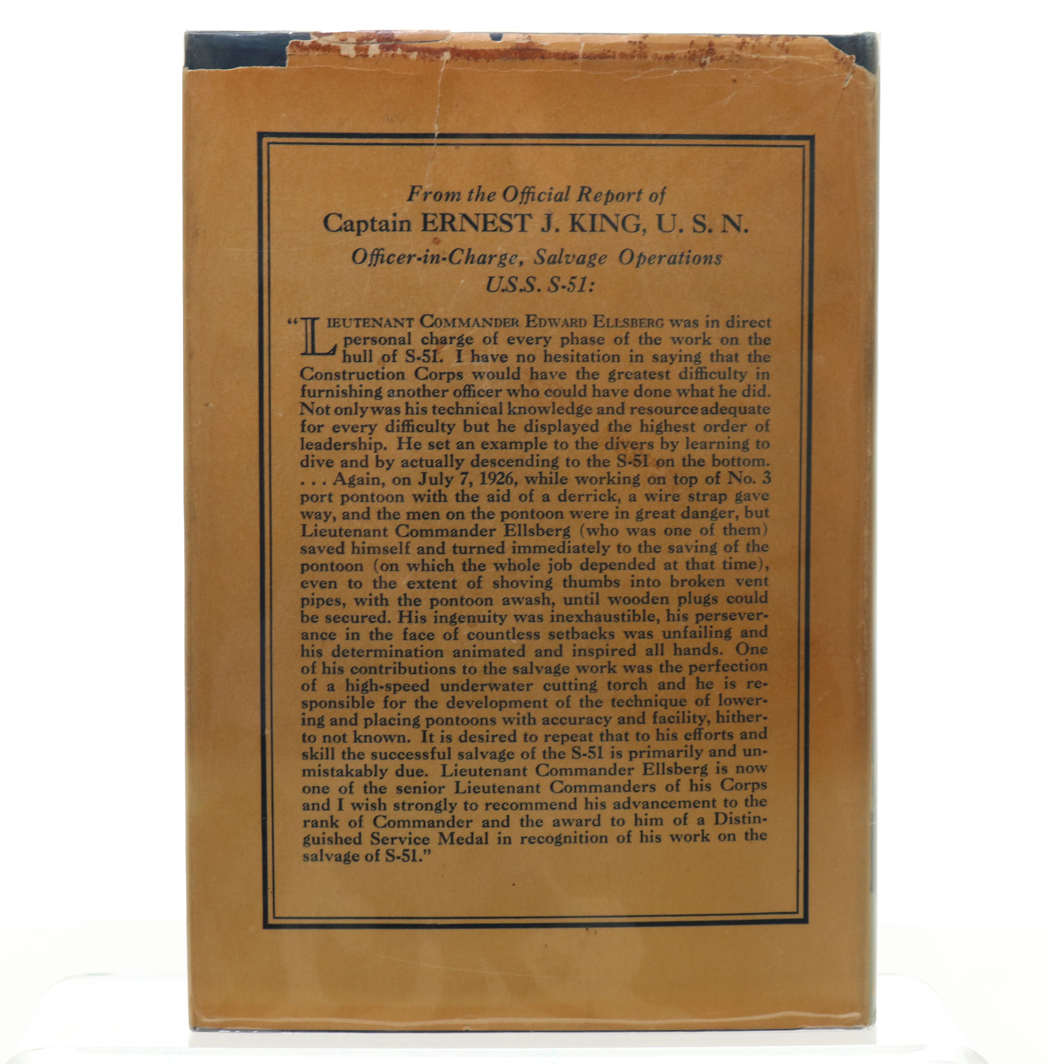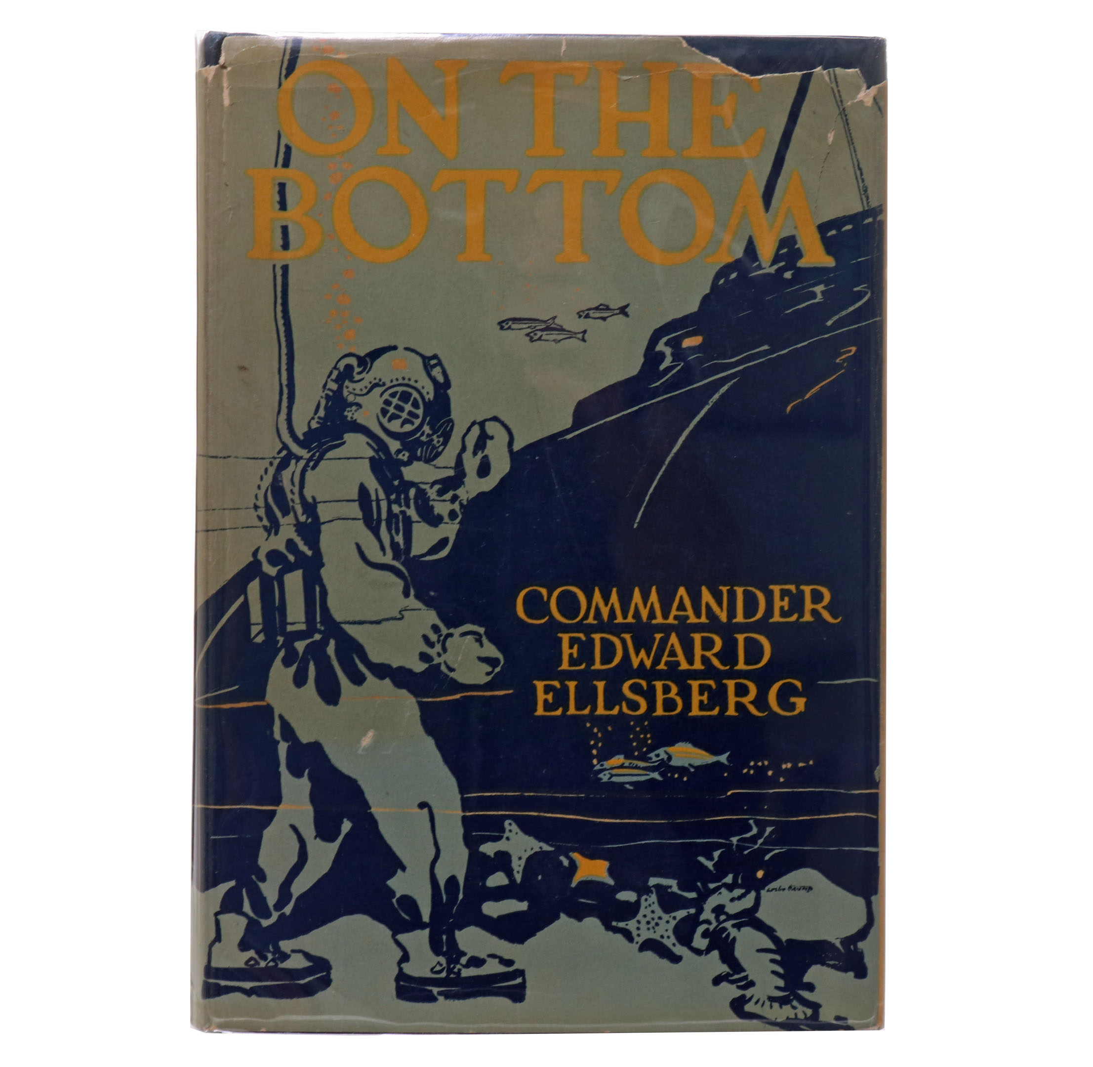 This is a very good first edition first printing of On The Bottom by Edward Ellsberg 1929. 8vo hardcover with the original dust jacket. The dust jacket has some shelf wear and minor chipping and rubbing on the edges. 324 pages with black and white illustrations throughout. The text is clean and free of marks. Blue cloth binding is tight. This is an iconic book with a great cover illustration.