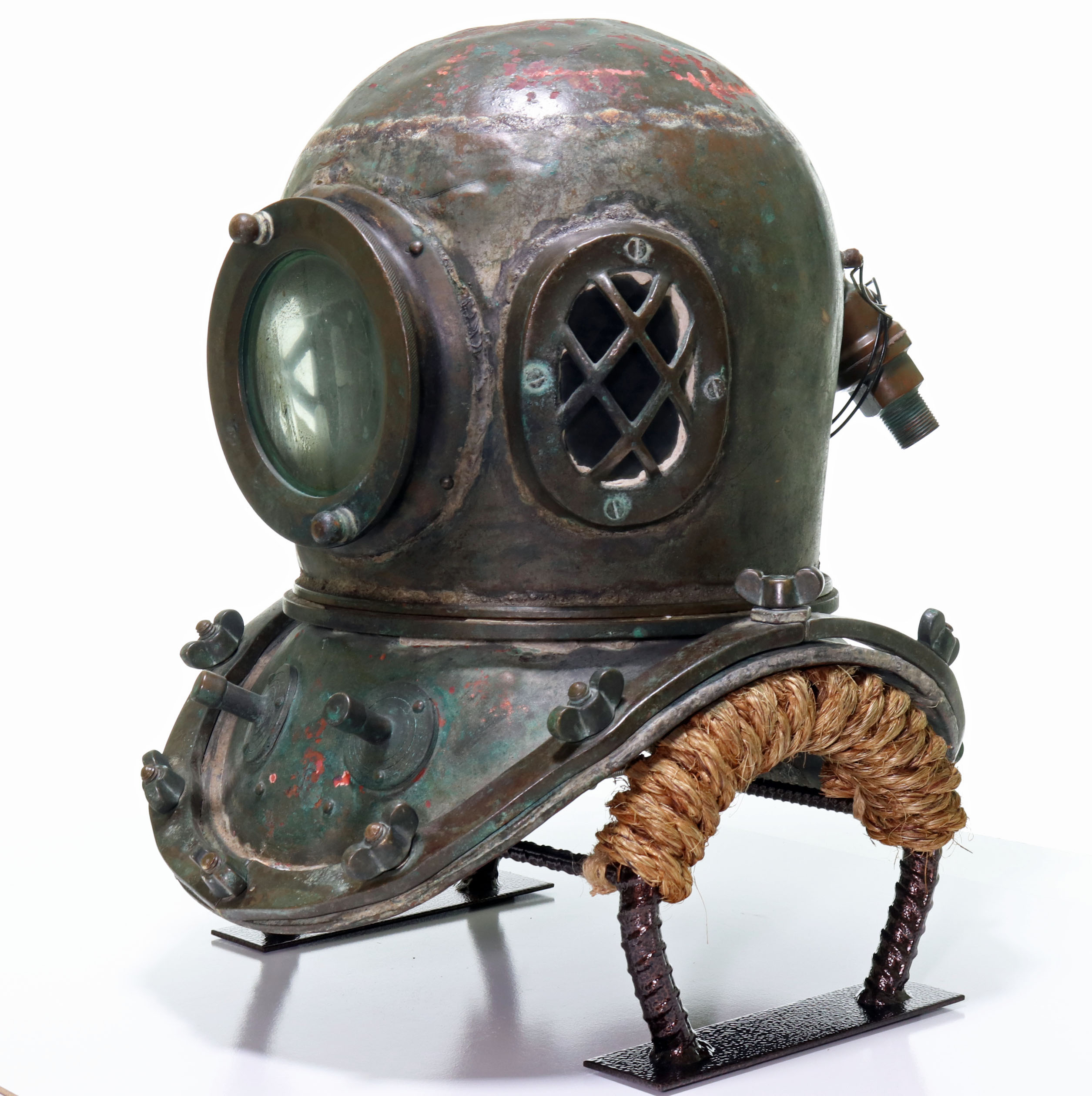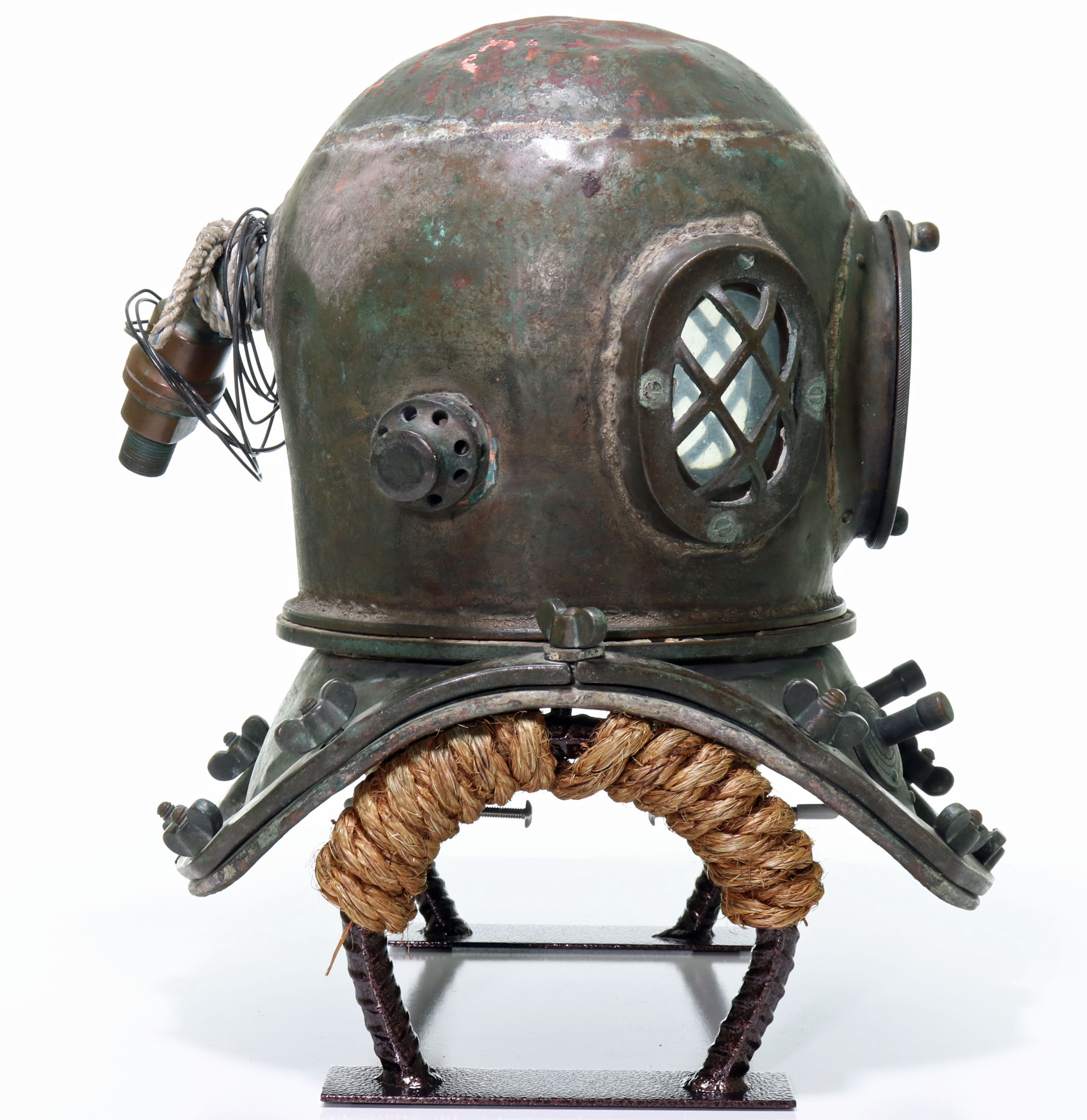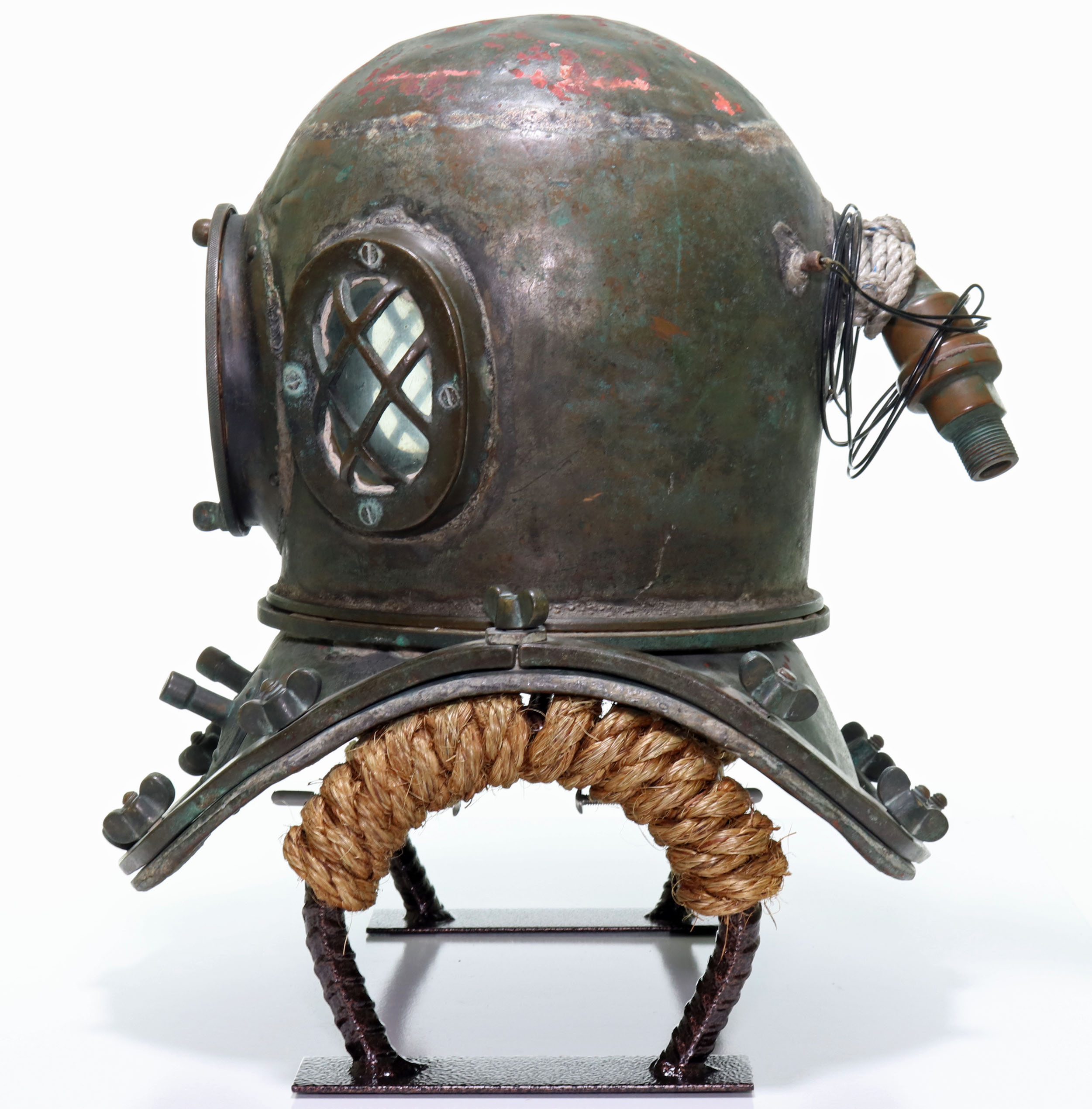 This is a relatively nice Japanese or Korean antique diving helmet. This helmet is in the classic three-light twelve-bolt pattern. The helmet’s ID plate is unfortunately gone, and there are no other indicators of who made this helmet. Unlike many Asian helmets, this one is not completely used up or badly beaten up. All of the glass is present and free of cracks. Internal air vents and an exhaust chin button are present. Vintage telephone wire and reproducer are still intact. This helmet also features a definitive solder line along the top peak of the bonnet. If you are looking for a nice Japanese or Korean helmet, this would make a great choice.