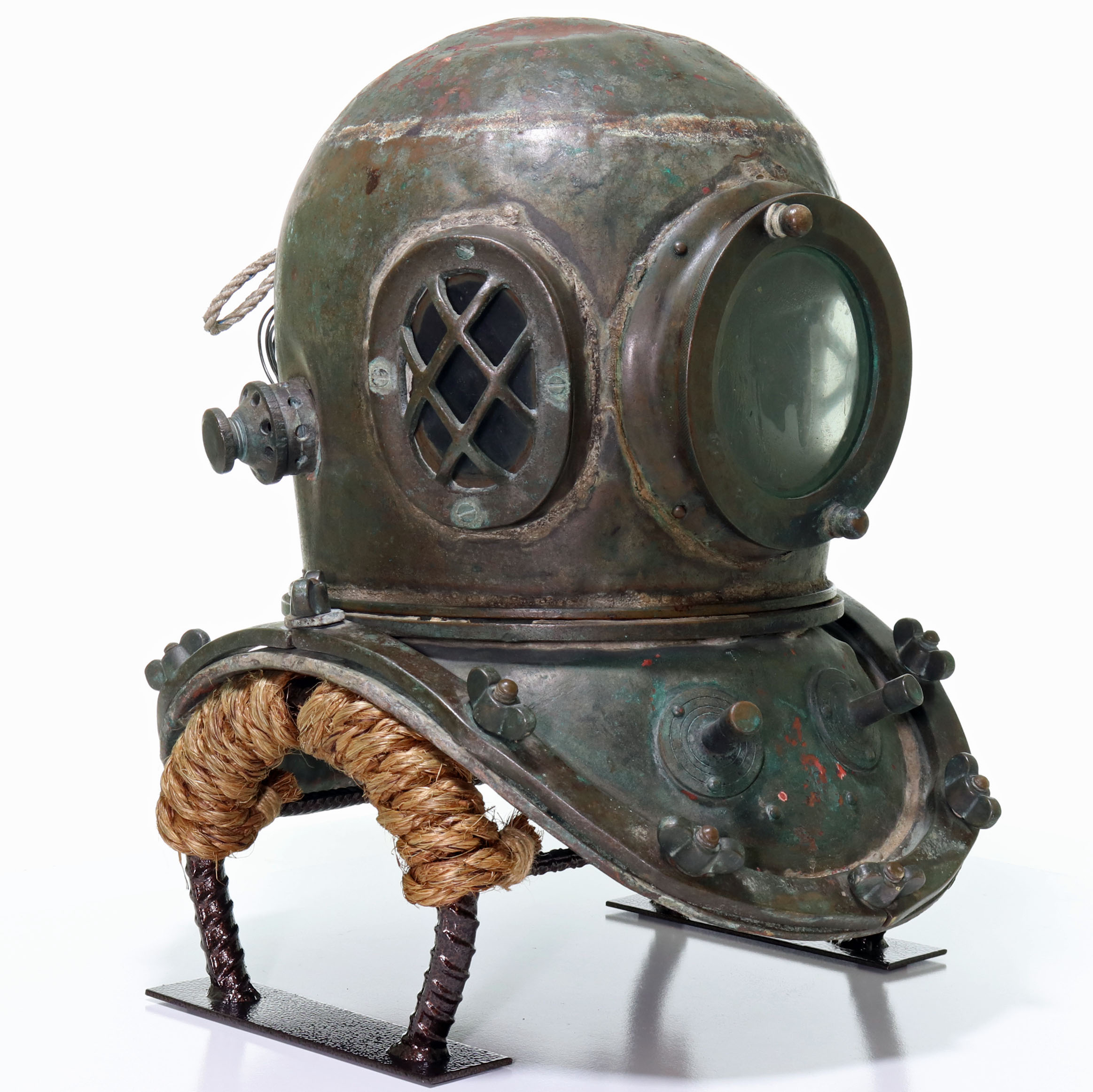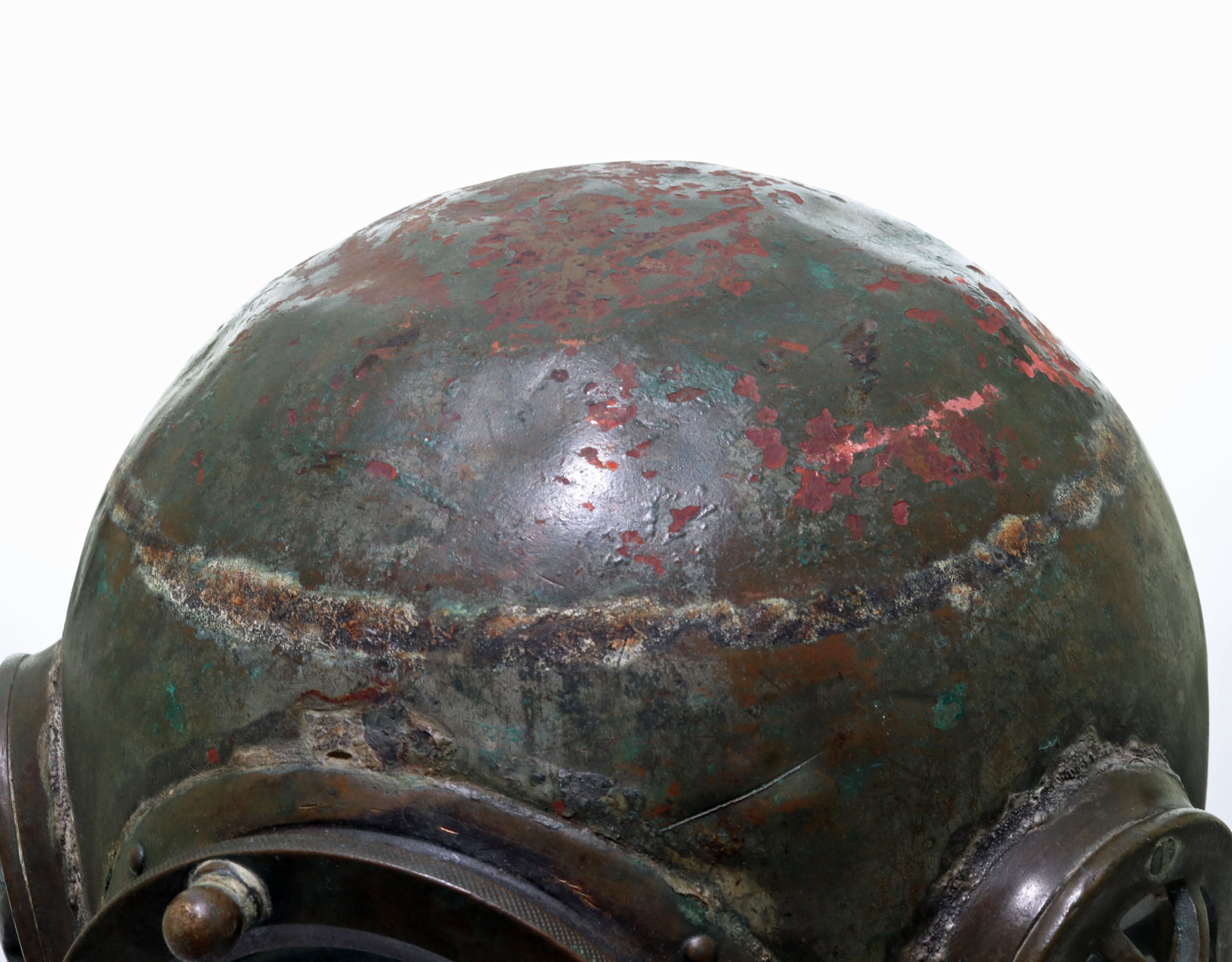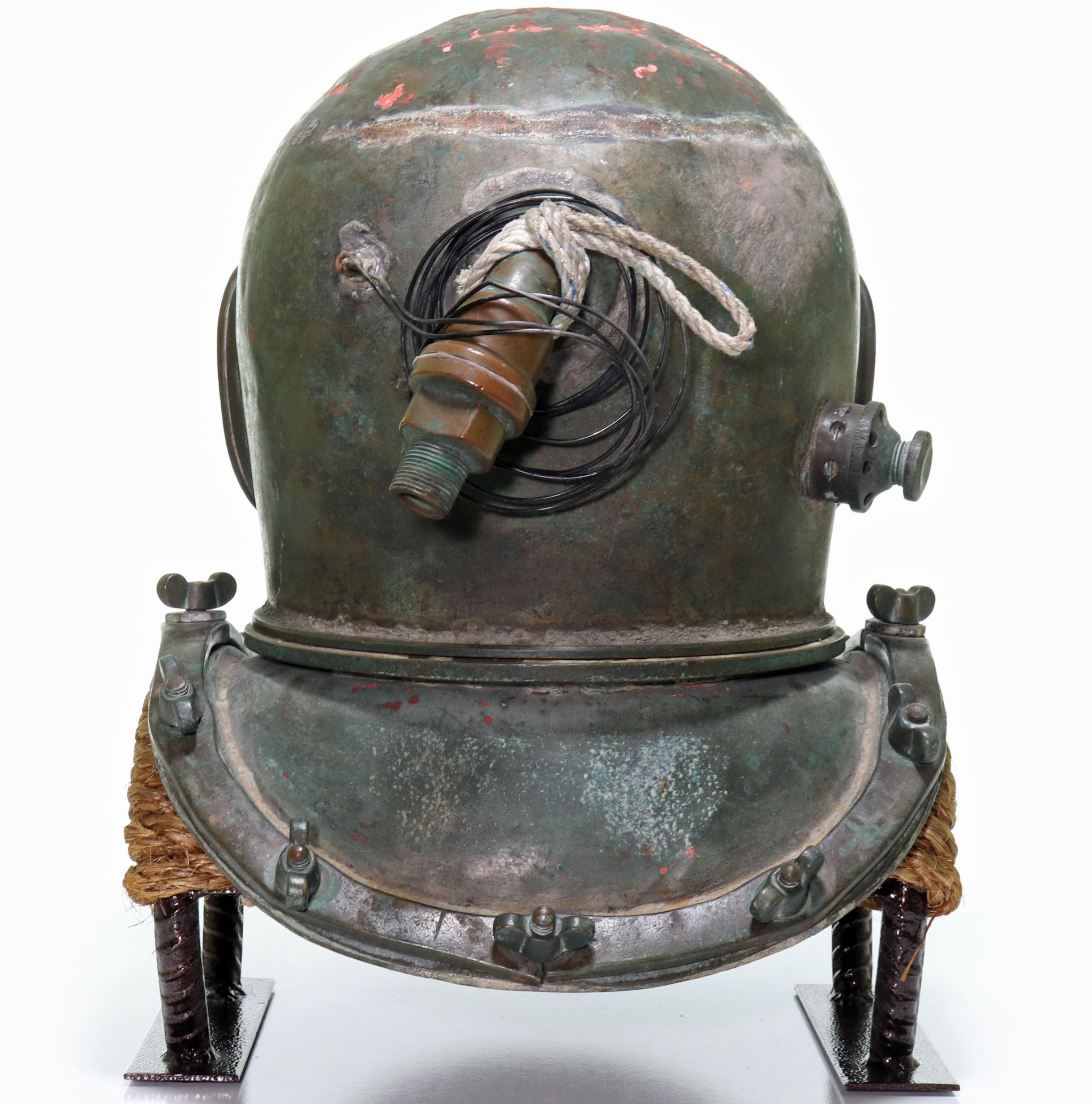 This is a relatively nice Japanese or Korean antique diving helmet. This helmet is in the classic three-light twelve-bolt pattern. The helmet’s ID plate is unfortunately gone, and there are no other indicators of who made this helmet. Unlike many Asian helmets, this one is not completely used up or badly beaten up. All of the glass is present and free of cracks. Internal air vents and an exhaust chin button are present. Vintage telephone wire and reproducer are still intact. This helmet also features a definitive solder line along the top peak of the bonnet. If you are looking for a nice Japanese or Korean helmet, this would make a great choice.