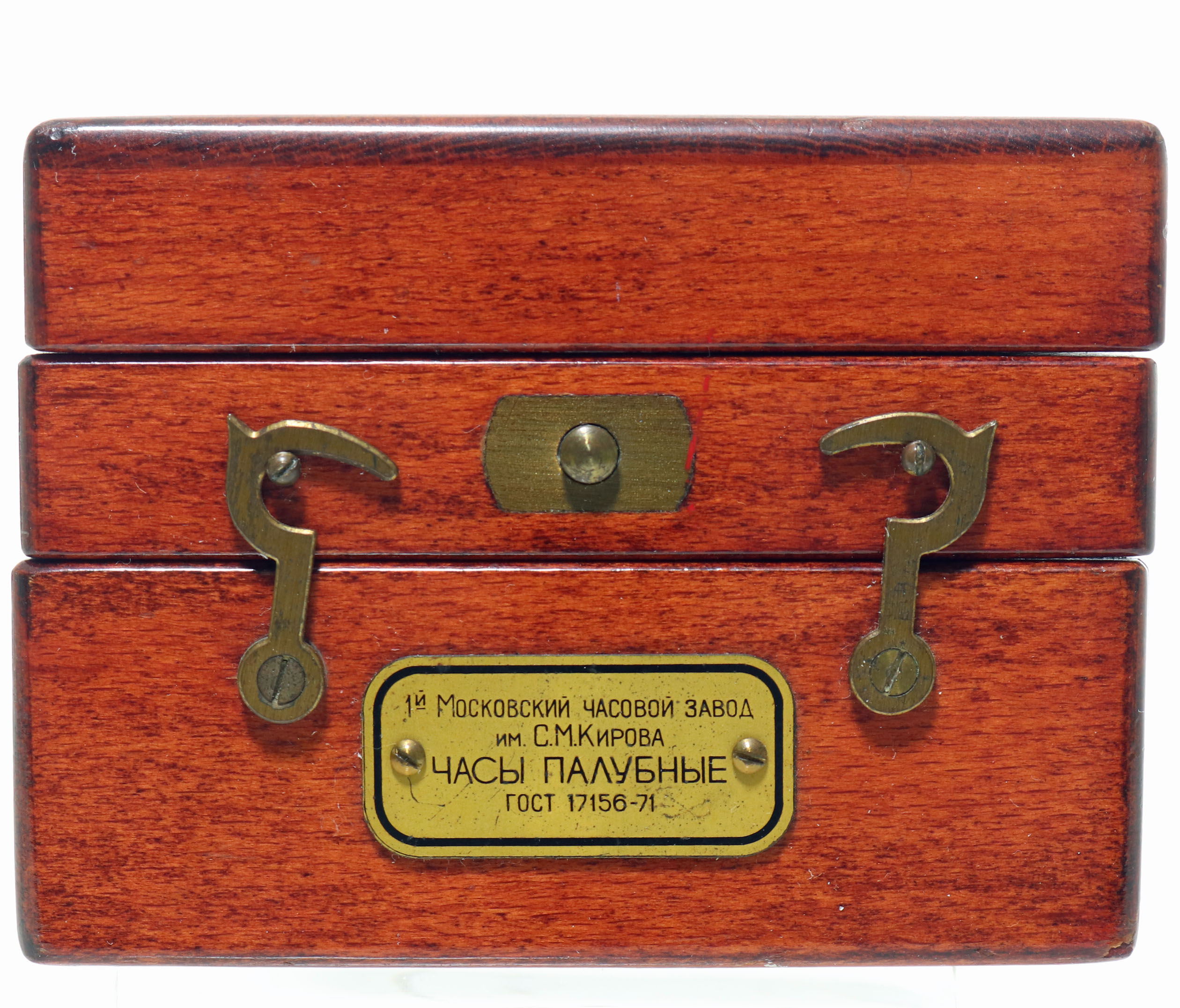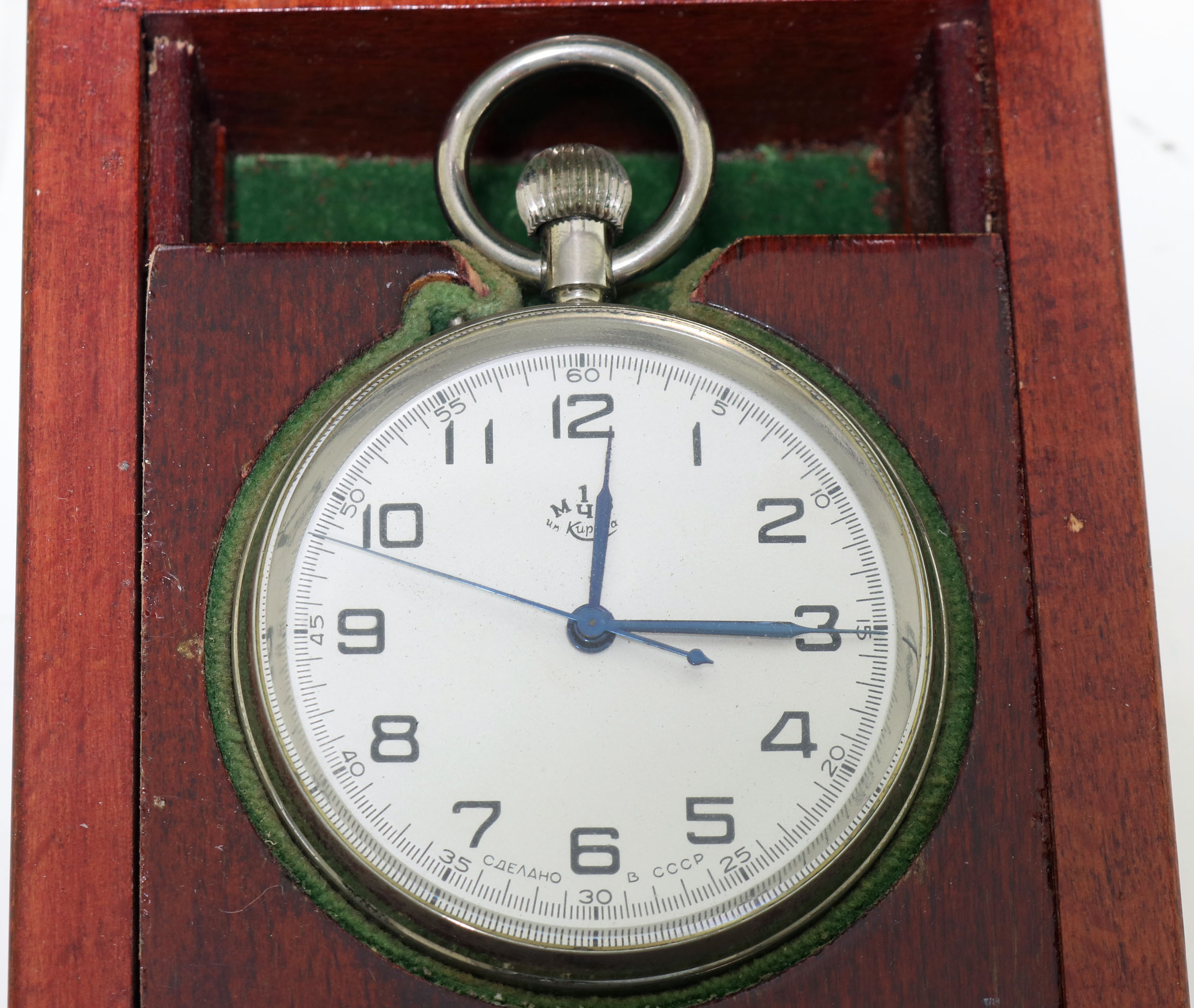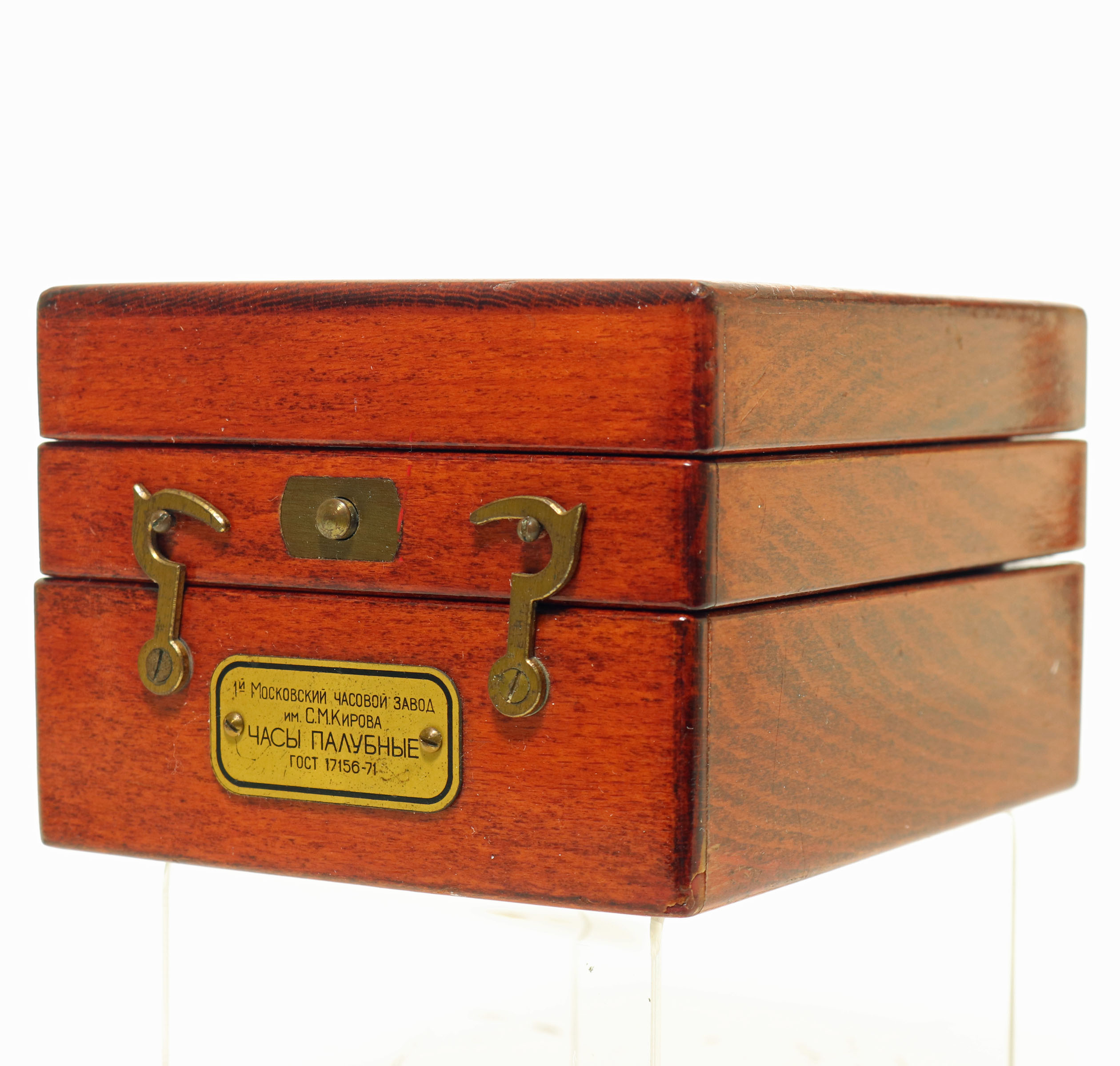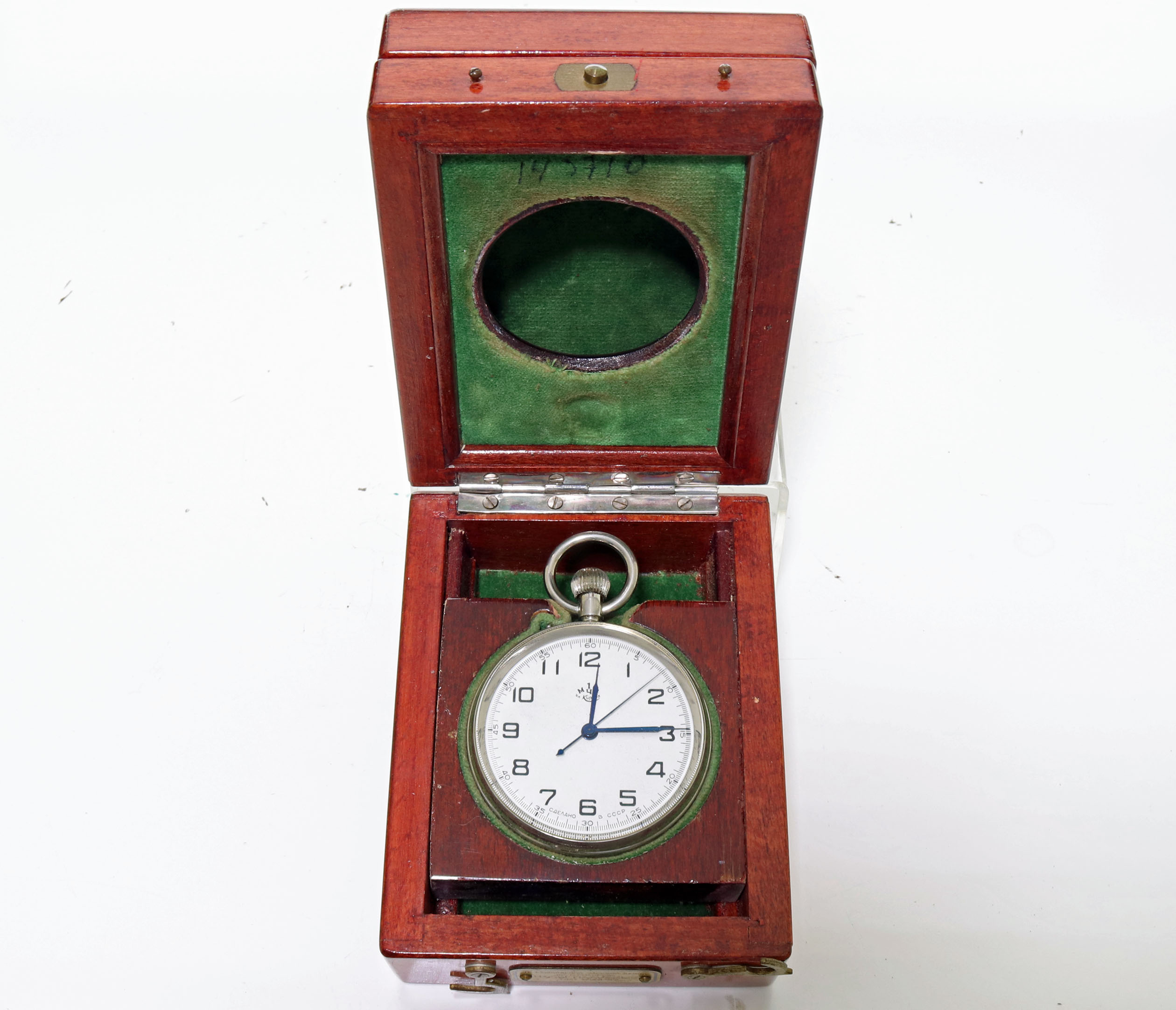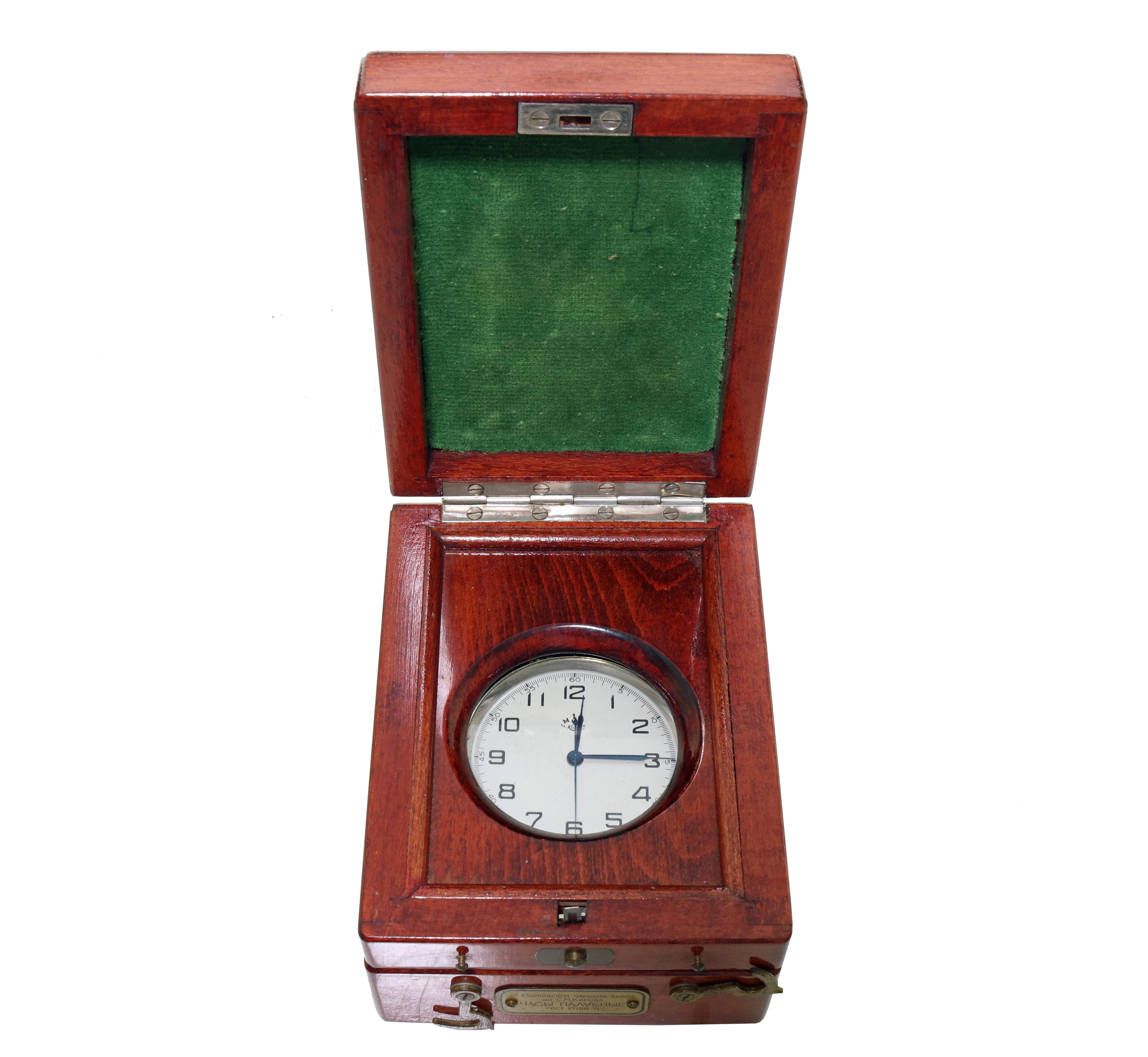 This is an impressive Soviet Navy deck watch. This watch is housed in a wood case that opens in two sections. These watches were made by Poljot in Moscow from the parts and designs of the A. Lange & Sohn factory in Glasshutte, Germany at the end of World War 2. The pocket watch-sized instrument is a manual-wind mechanical watch. The movement is 23k gold-plated to prevent saltwater corrosion. The watch is 53mm in diameter and 12mm thick, with 42-hour power reserve and chronometer certification. It is running, but we can not guarantee its function.