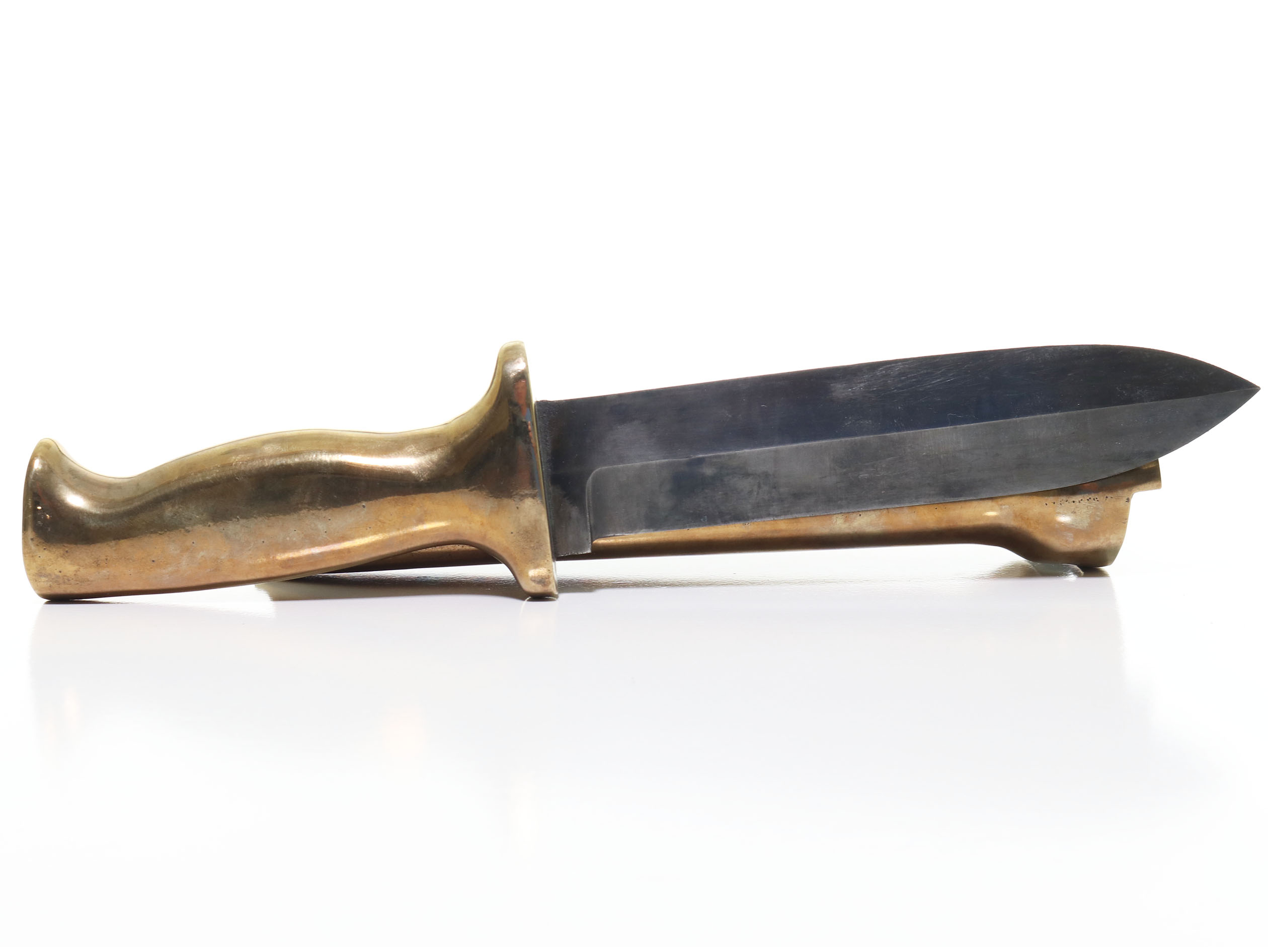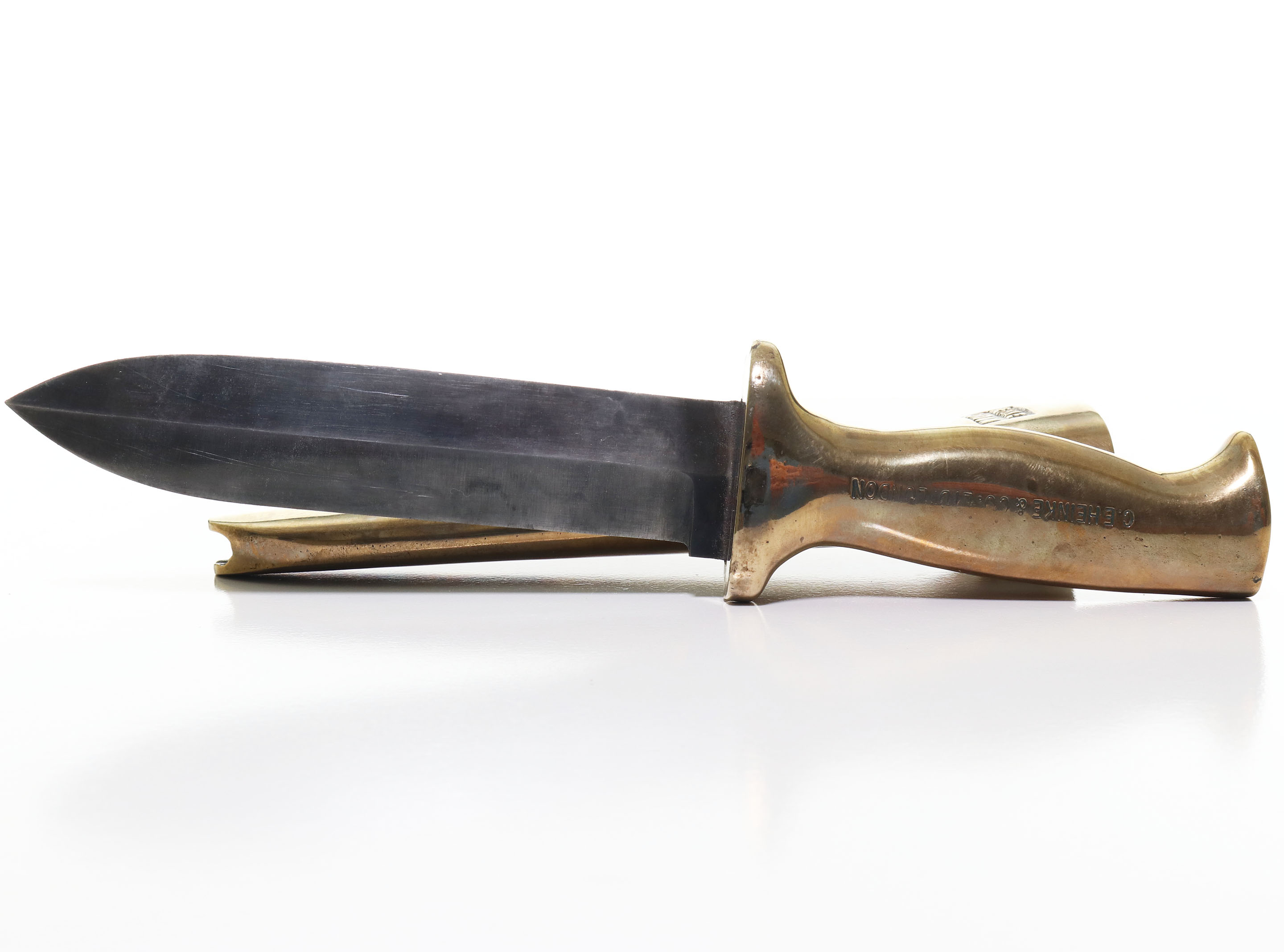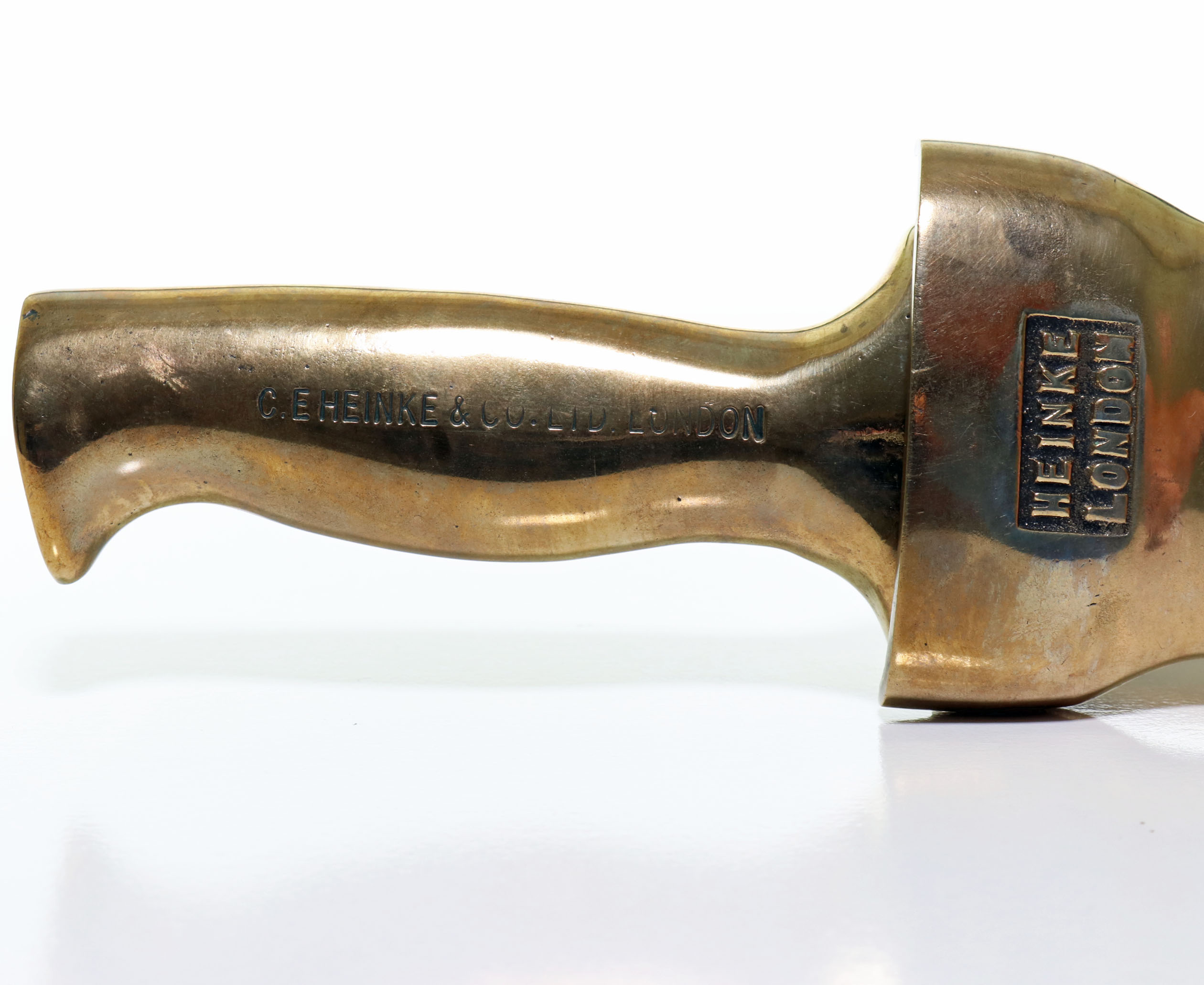 This is an impressive replica dive knife made in the style of the famed London company C.E. Heinke & Co. As shown in the photos, this example is in very nice condition. The brass handle and sheath have been polished long ago. The brass handle is clearly stamped. The brass sheath features Heinke London cast into it on one side. Blade is in very good condition with usual handling marks.