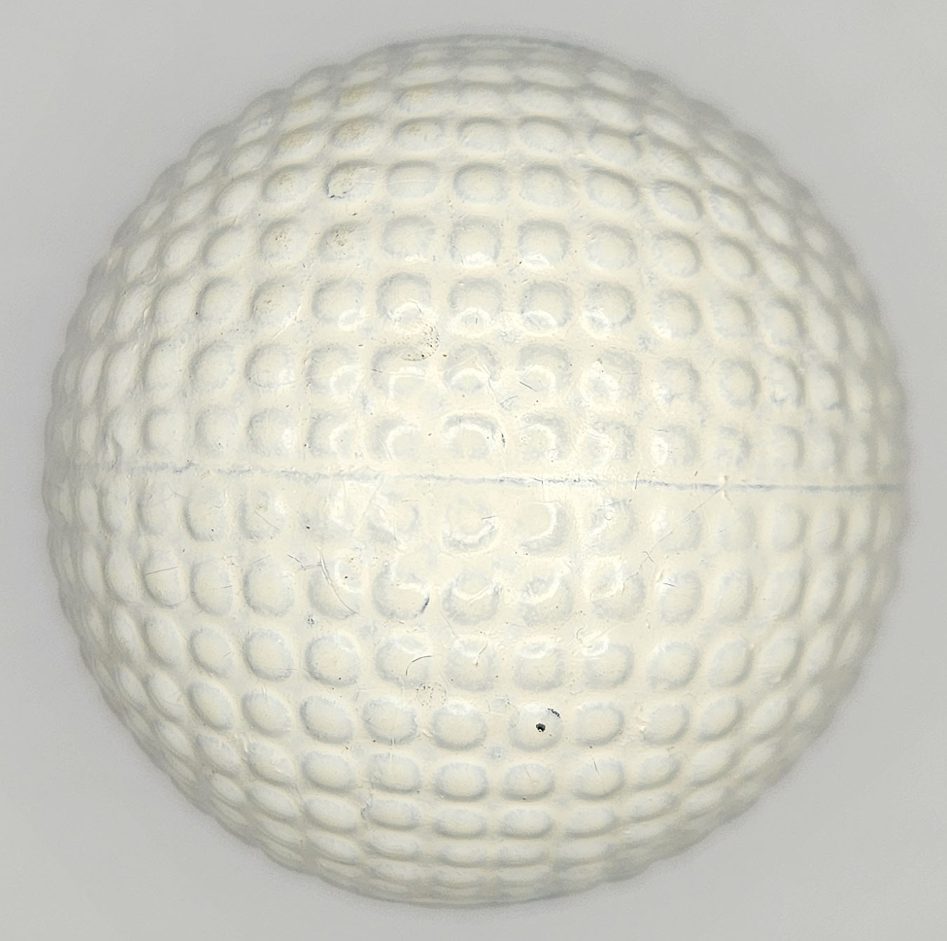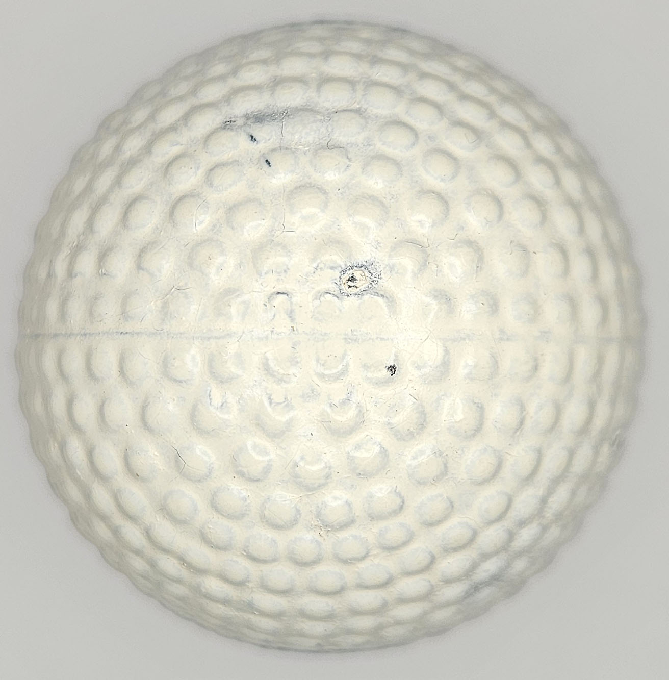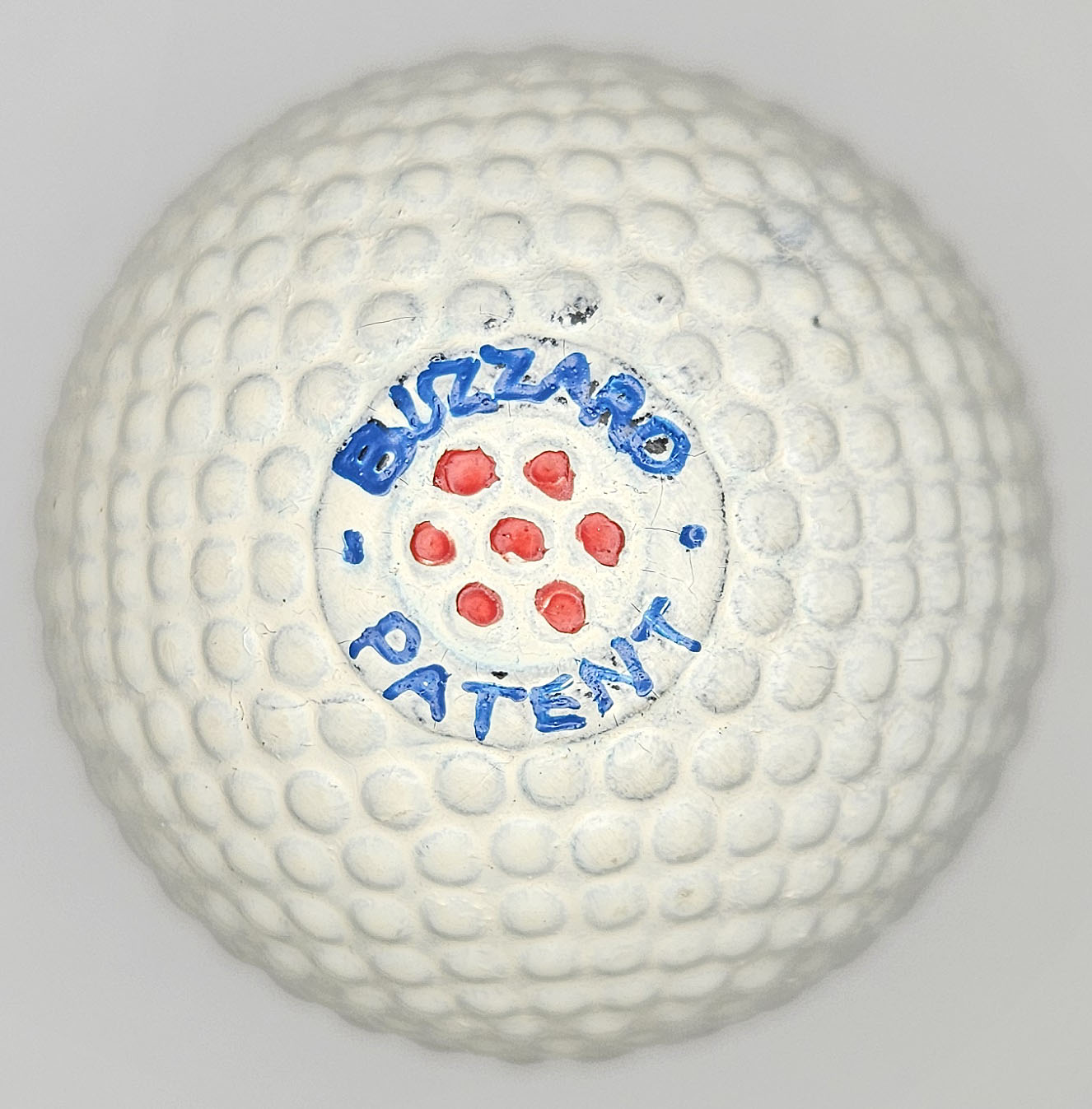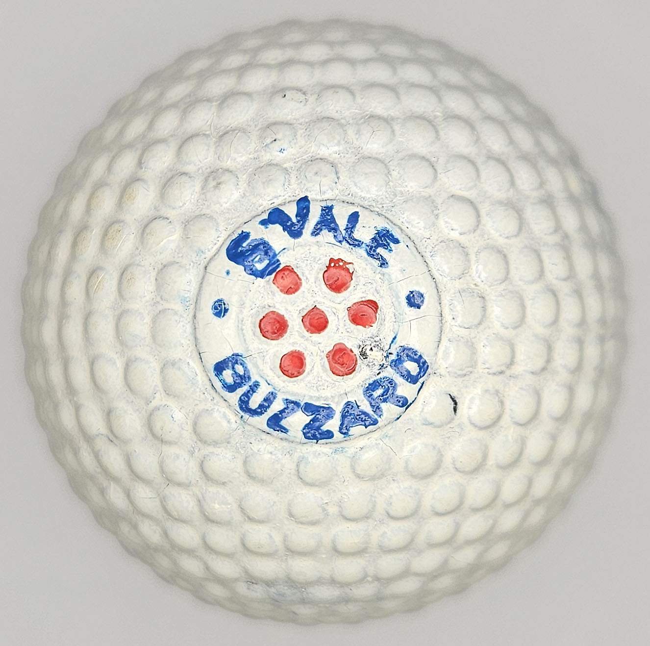 This is an excellent example of a Buzzard bramble golf ball. Buzzard 5 Vale stamped on one side, Buzzard Patent on the other. No noticeable flaws on the cover with a strong even white color, blue and red stamps are strong as well.