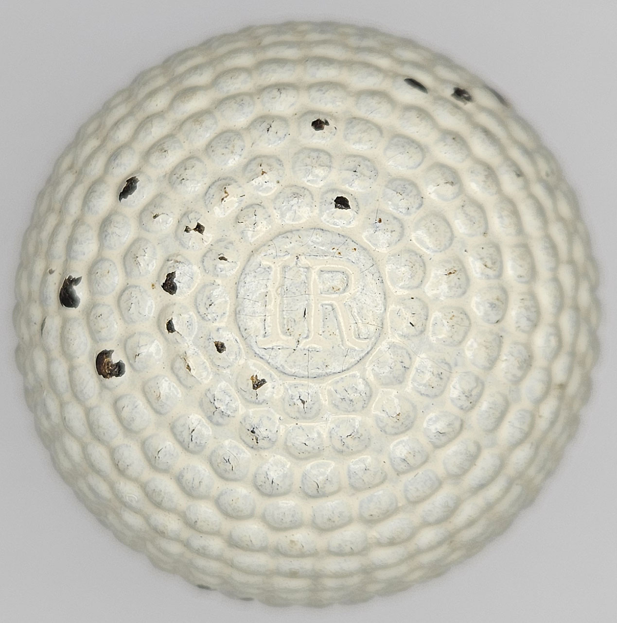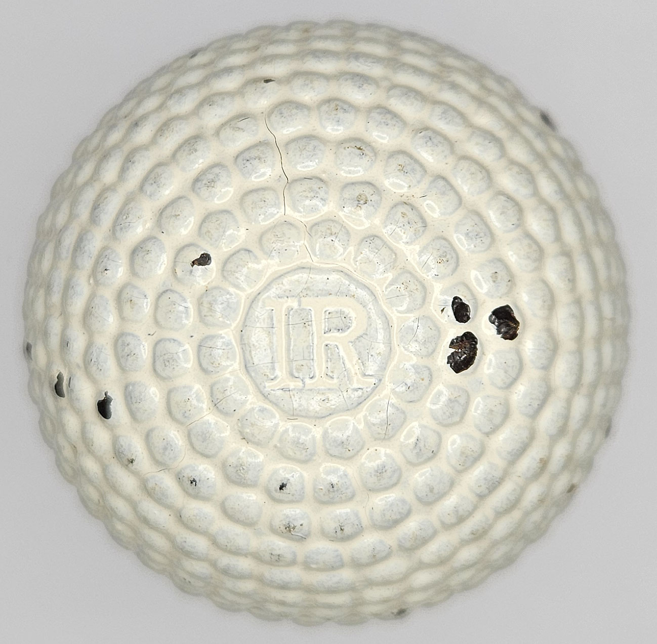 This antique bramble golf ball features a IR on both sides of the ball. The white cover has a consistent nice color with some chipping from handling. A shallow crack runs nearly the entire circumference.