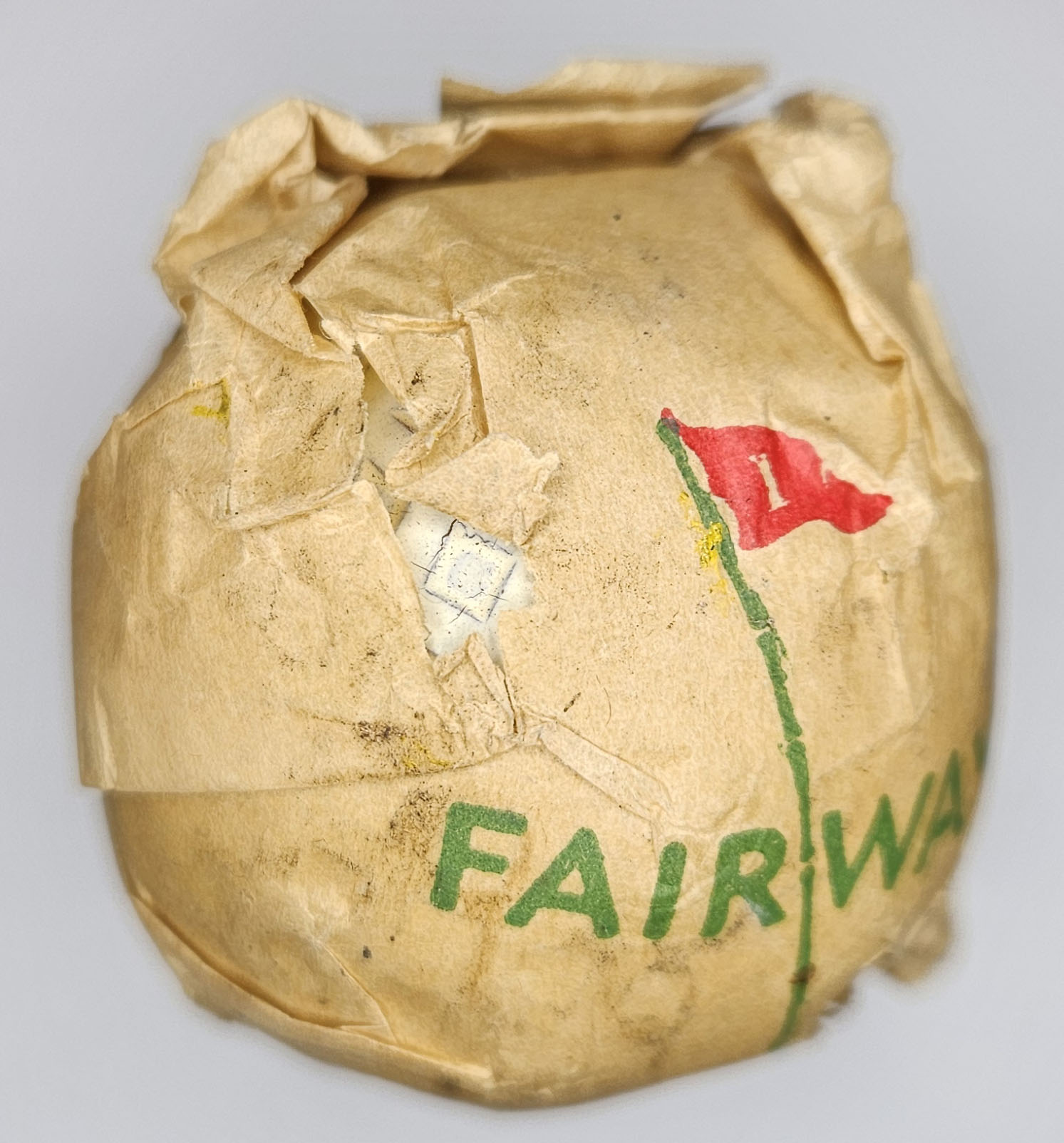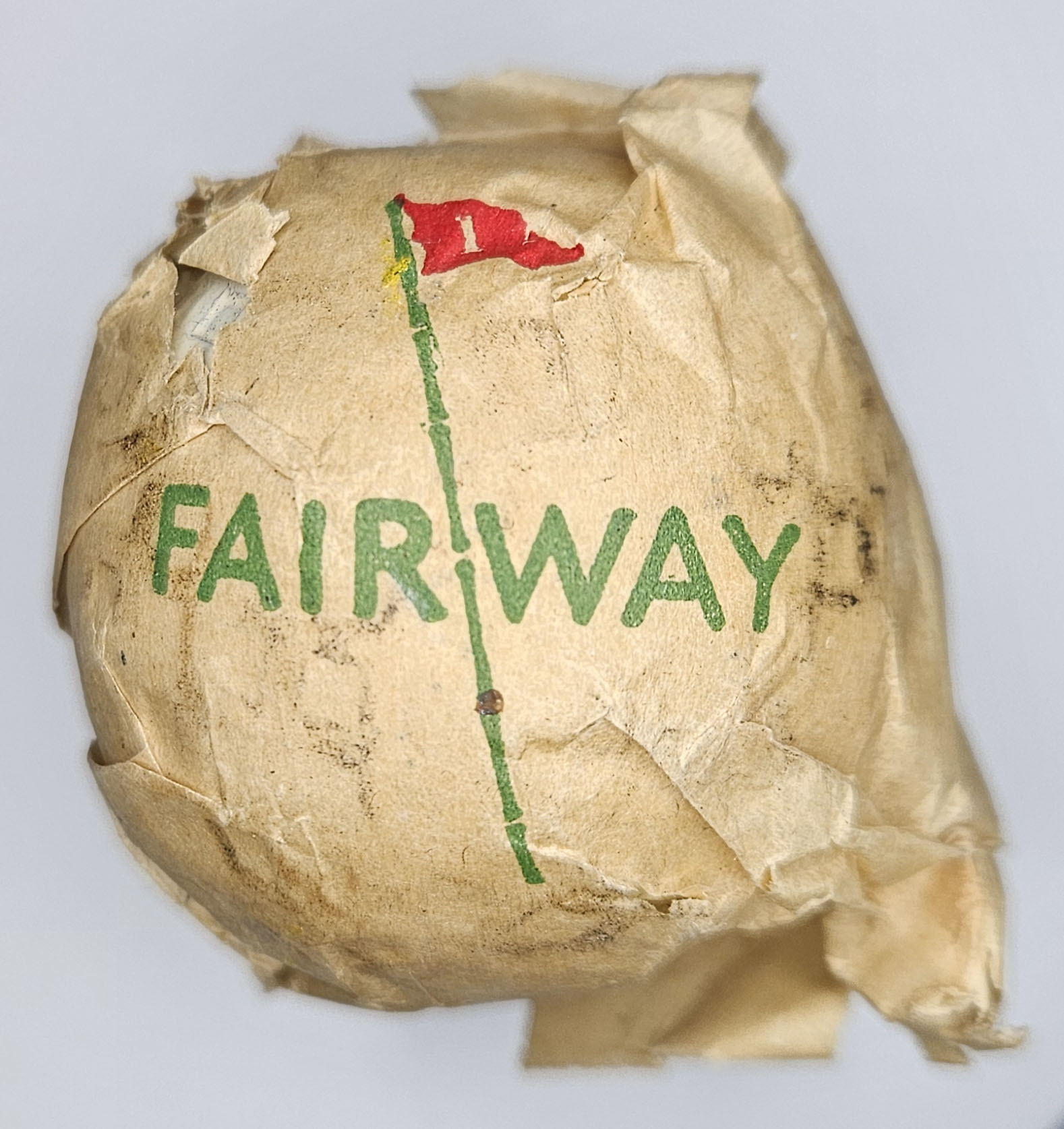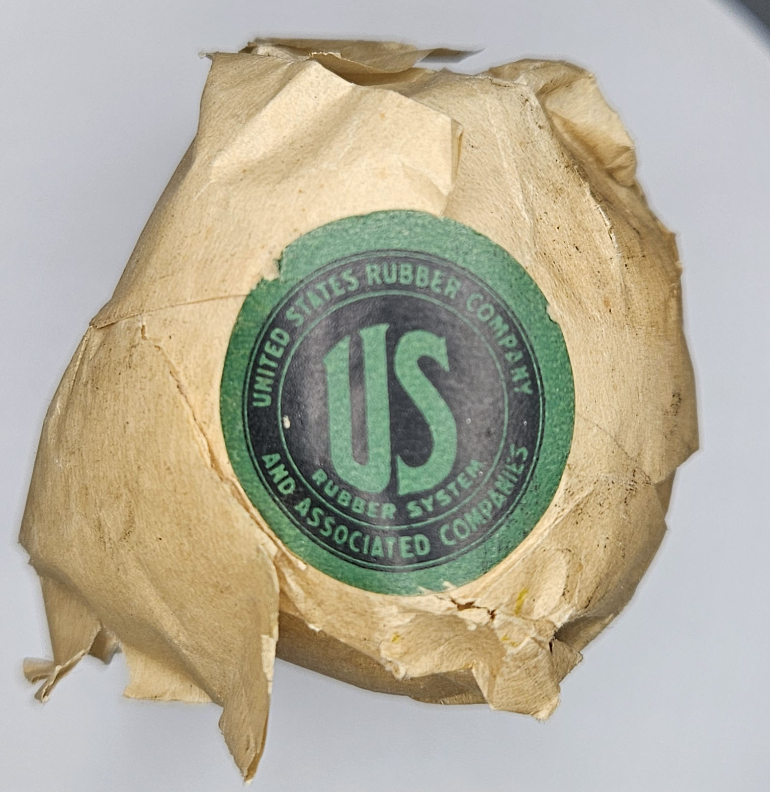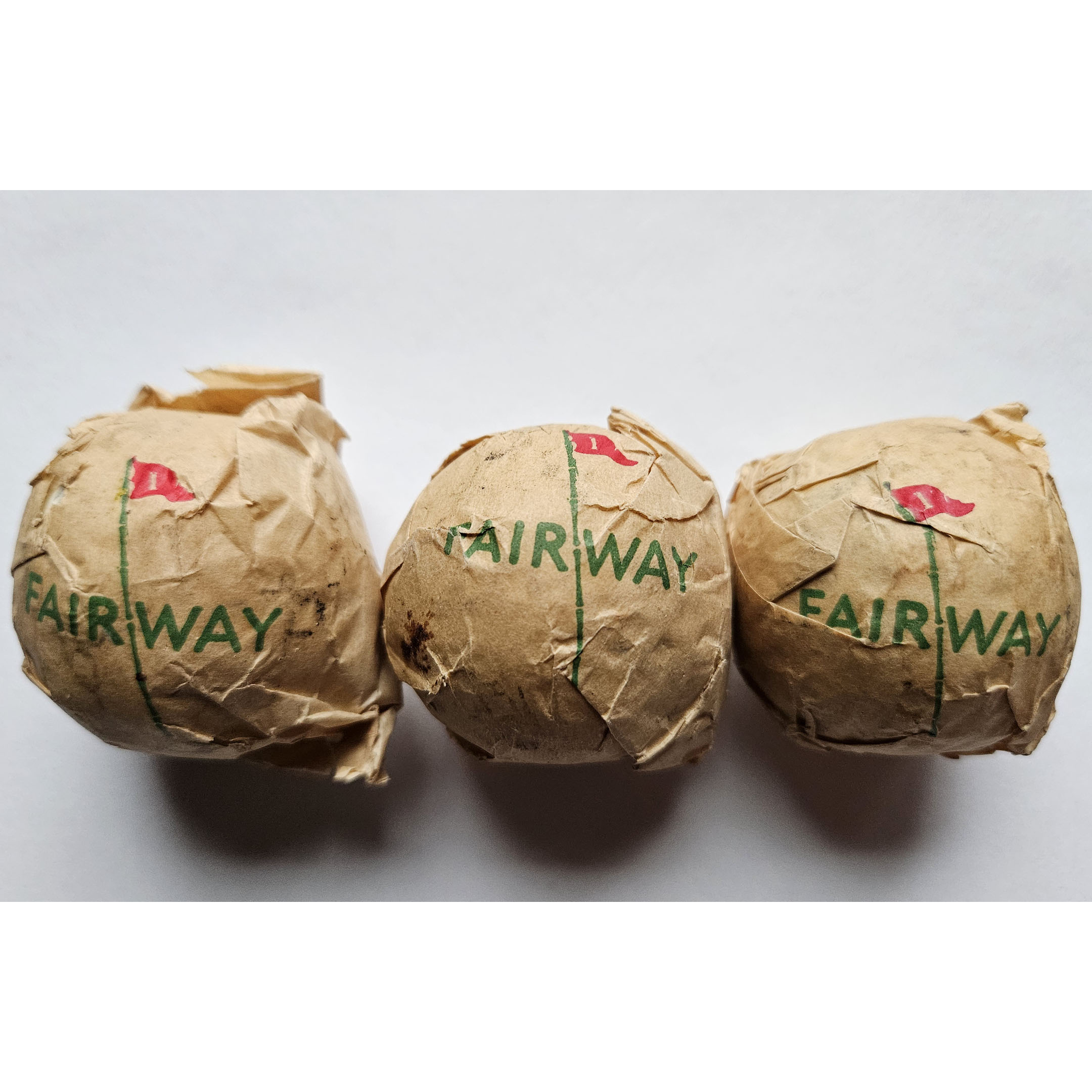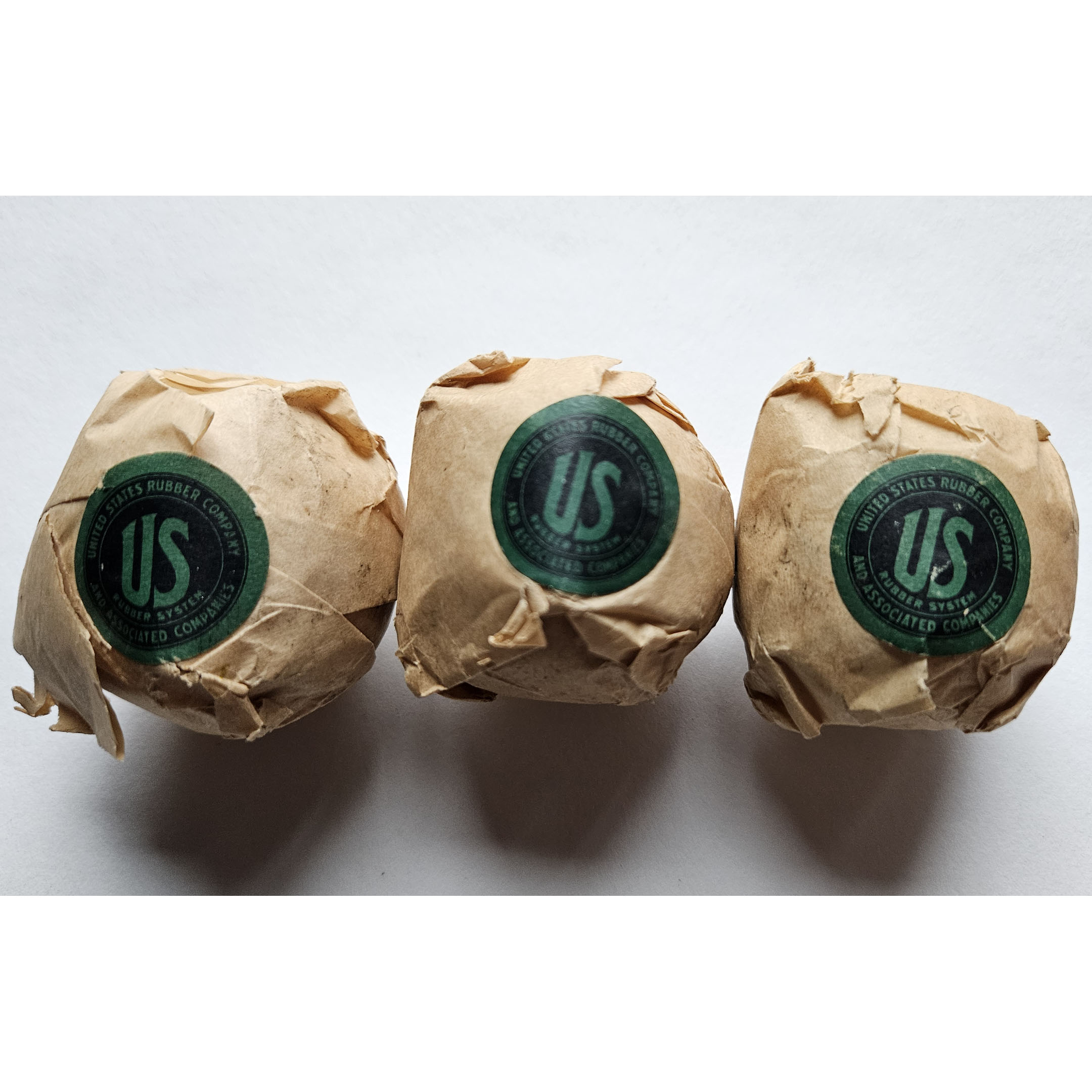 This is three original US Rubber Fairway square or mesh pattern golf balls in their original paper wrapping. US Rubber label is also intact and in excellent condition. One has a very small piece of wrapper missing, showing a square pattern on the ball. Circa 1920’s.