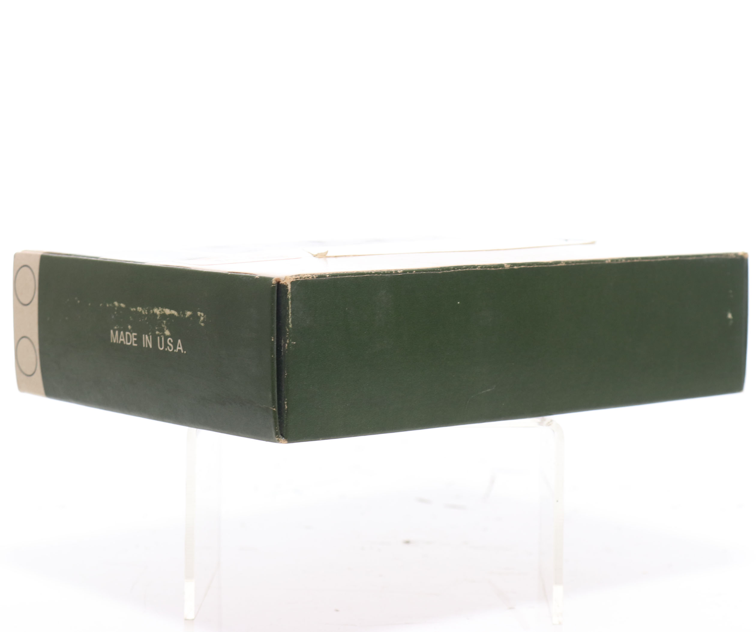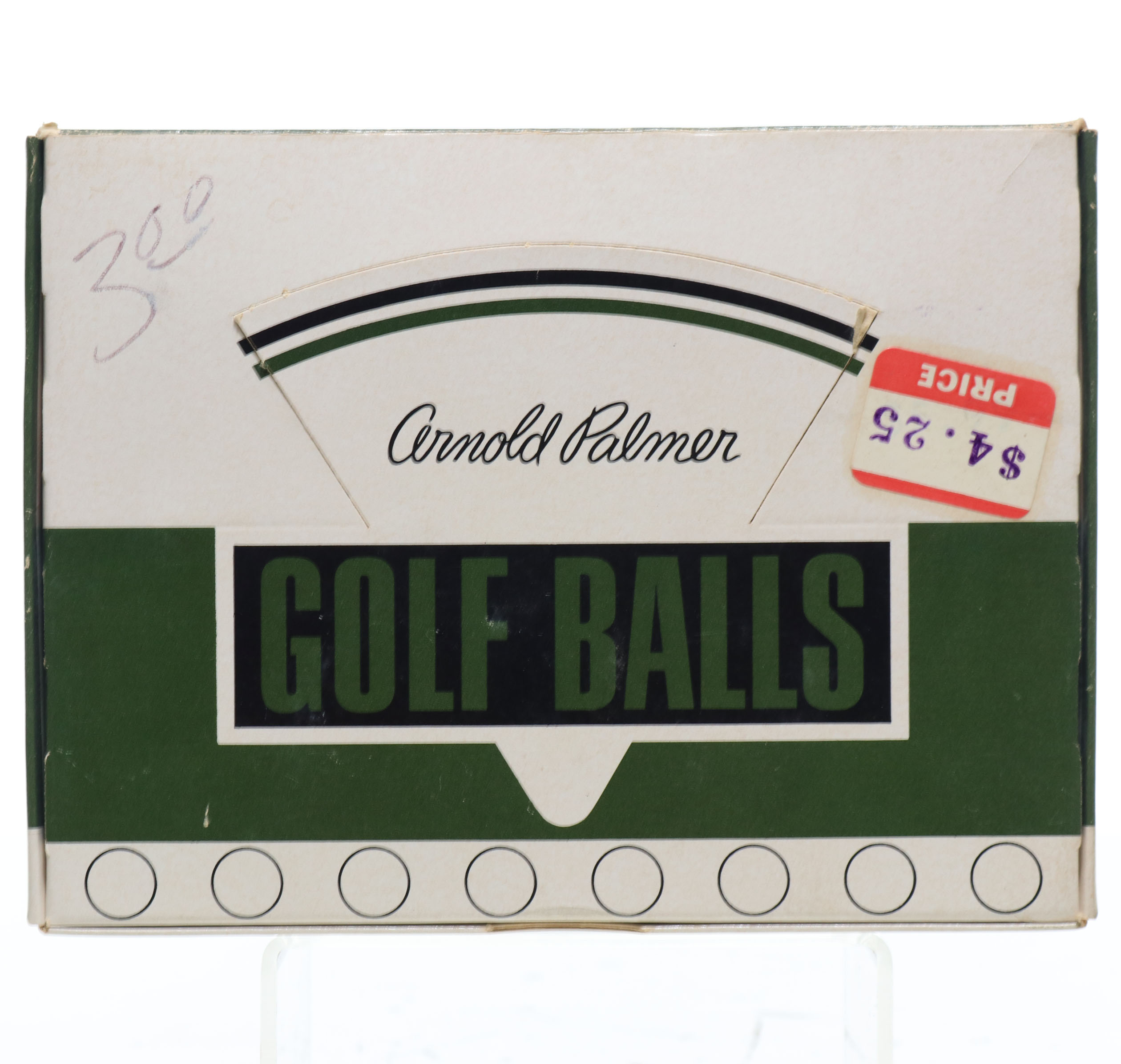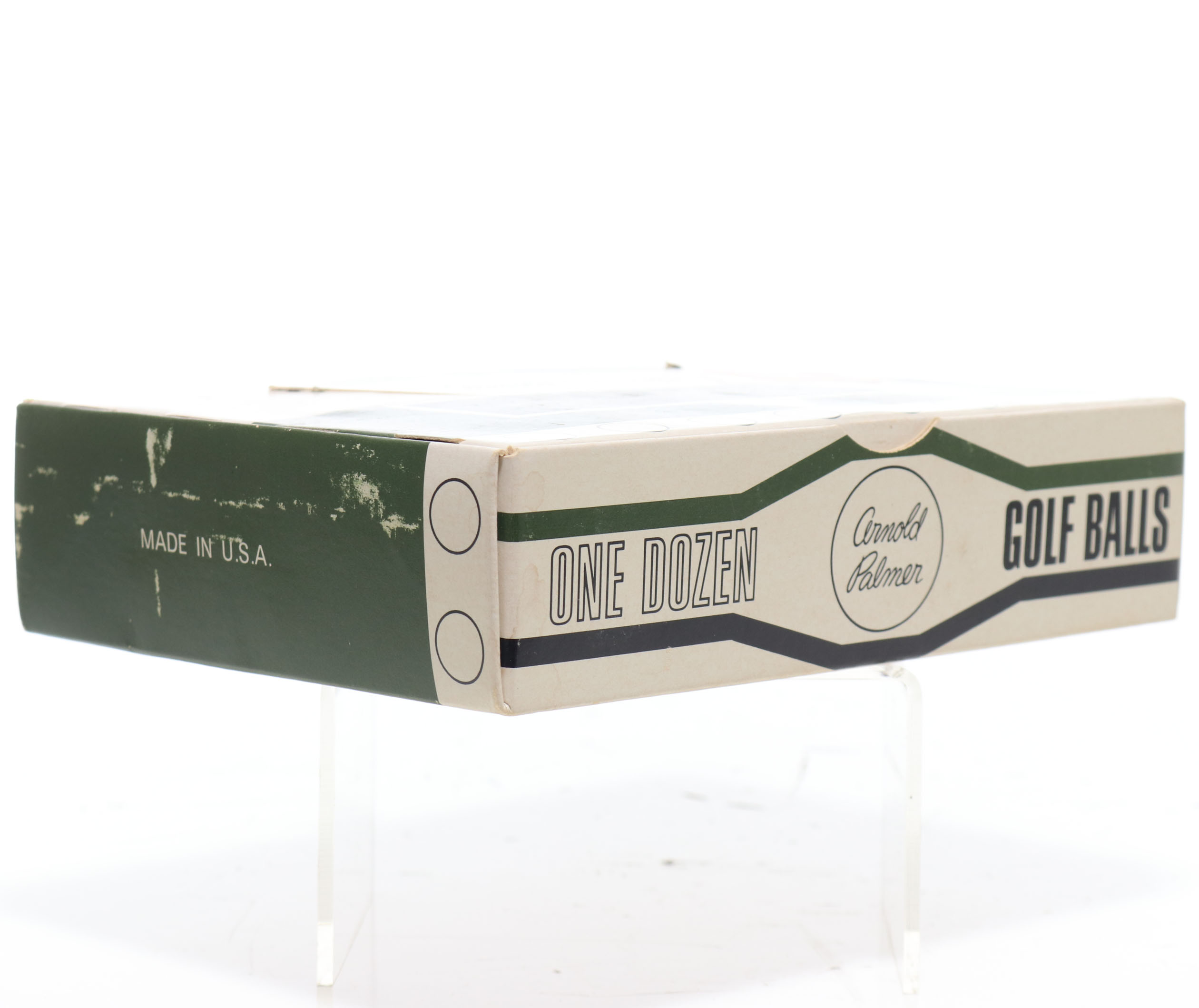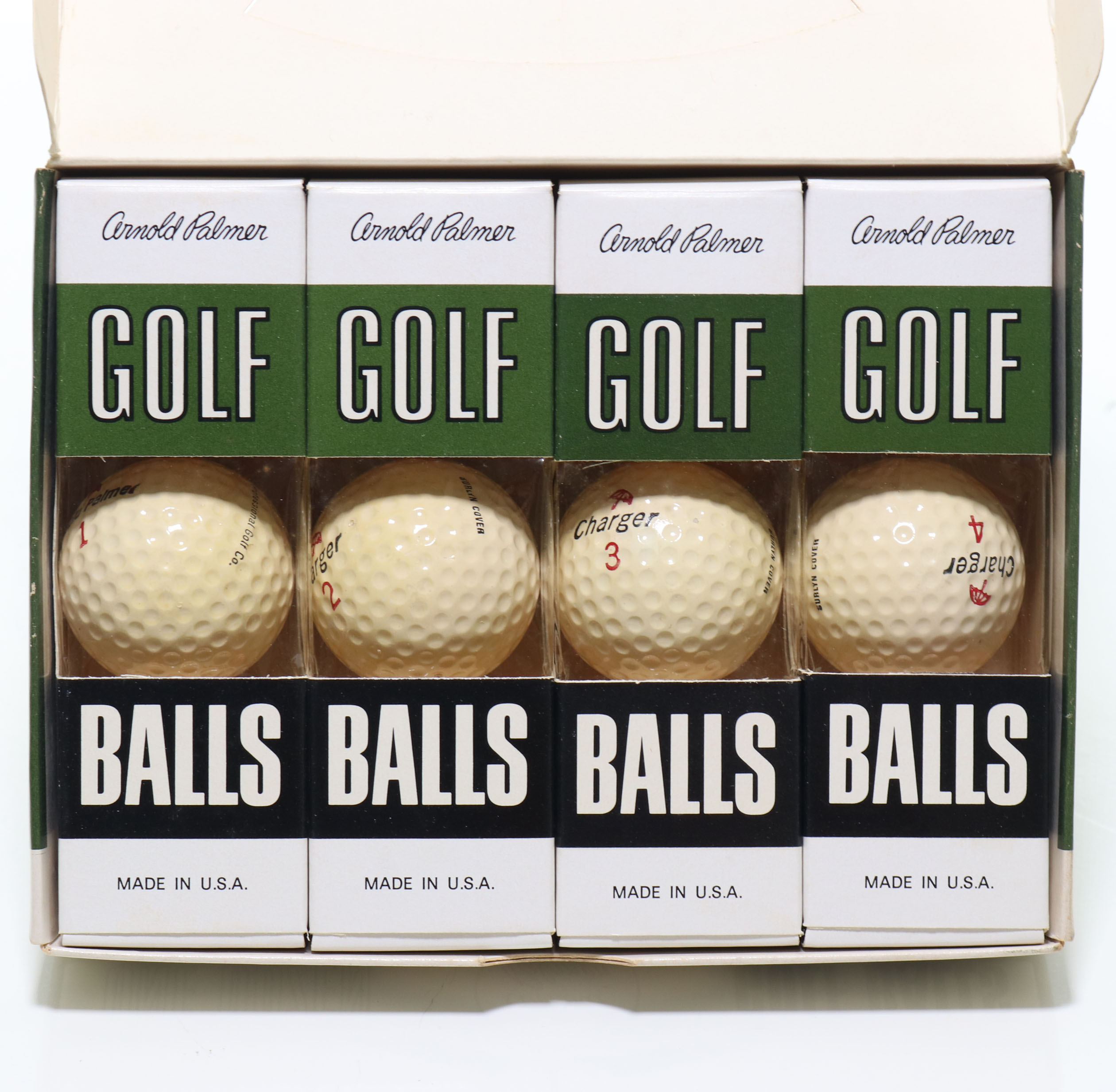 This is a very nice new old stock unopened complete box of Arnold Palmer Charger golf balls. These were made for Palmer Professional Golf Co. in the 1970s. Each ball has an umbrella above the Charger name. All twelve of the original balls are intact and appear to be in like-new condition, as well as each sleeve! Outside box is in excellent condition with signs of shelf wear and a few minor blemishes, please refer to photos.