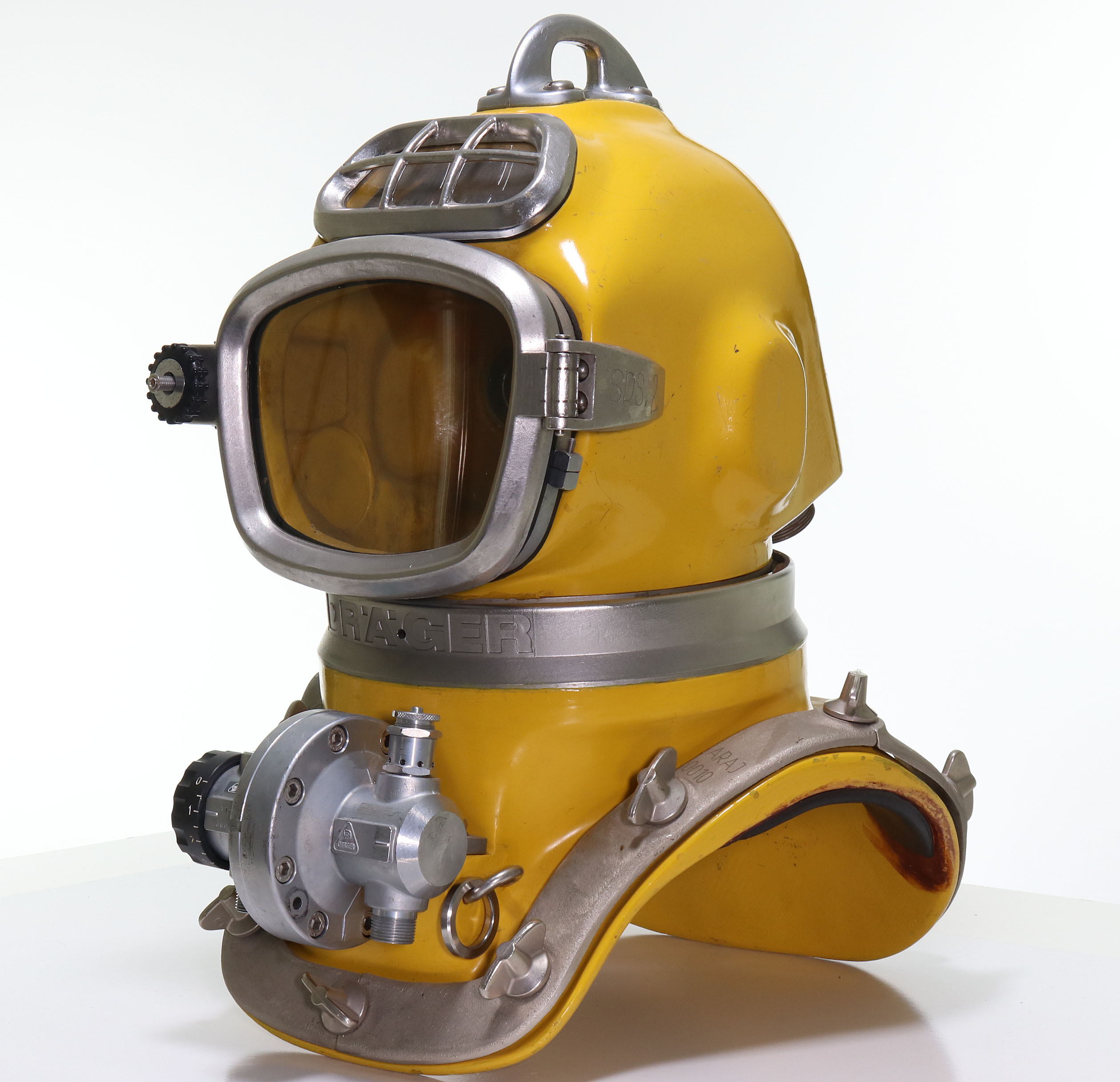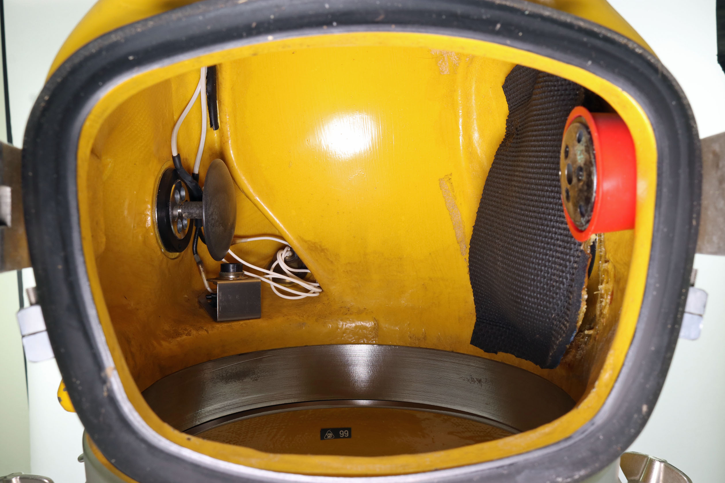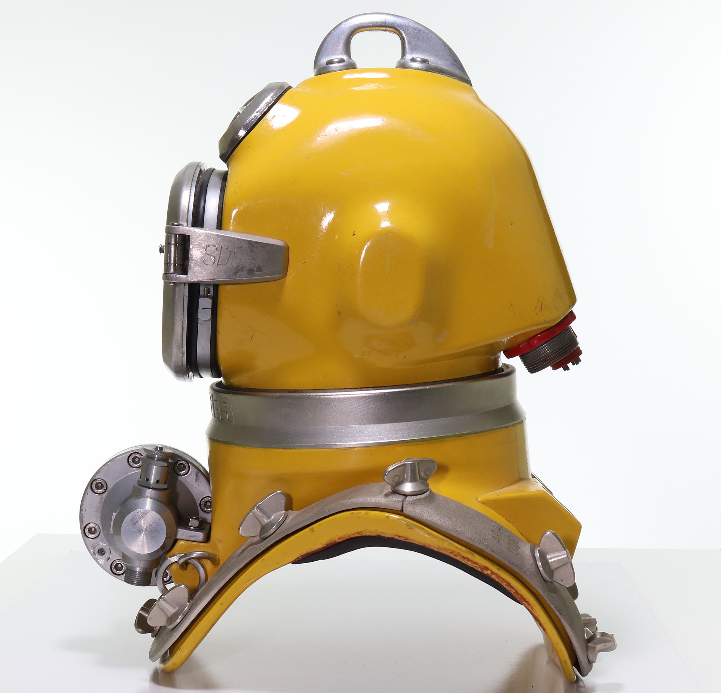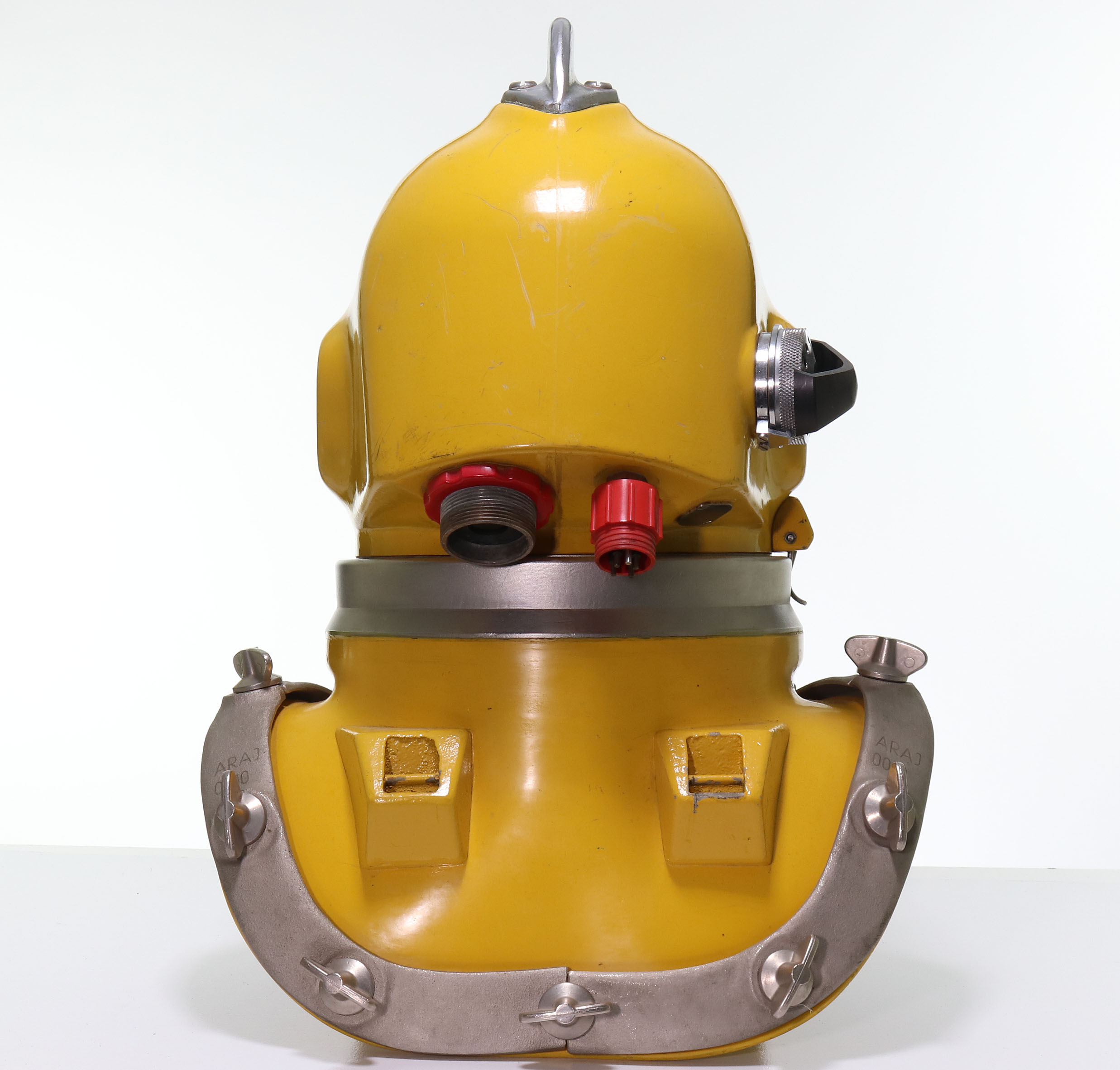 This example is in excellent condition with only very slight blemishes present in the yellow paint. It does feature the large regulator mechanism on the front of the breastplate. The regulator is serial #99. A sticker on the inside of the breastplate also has #99 on it. All of the original components are intact including the twelve wing nuts and brails. The brails have ARAJ 0010 on them. The helmet weighs approximately 48 pounds. This is an impressive helmet design reminiscent of the much older copper and brass German helmets.