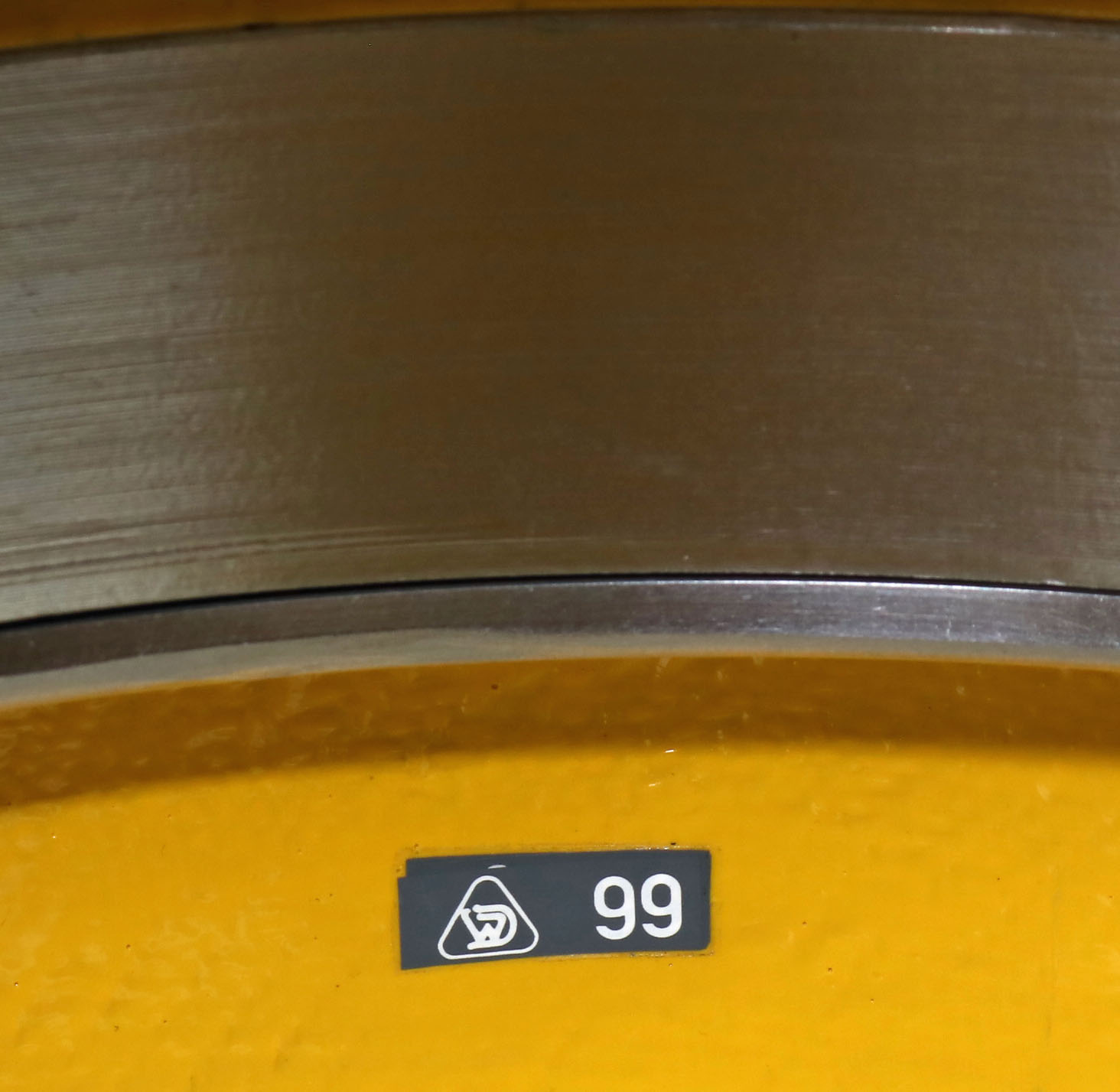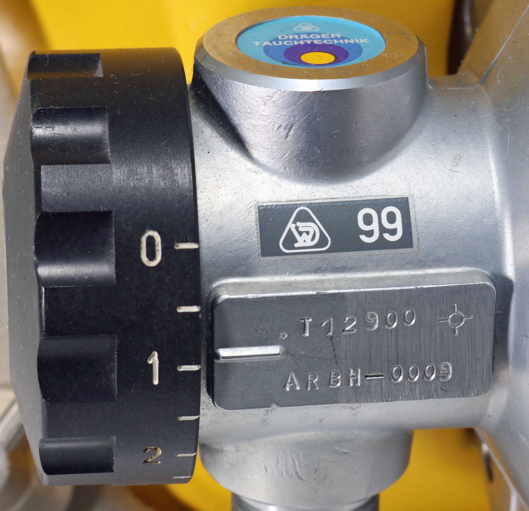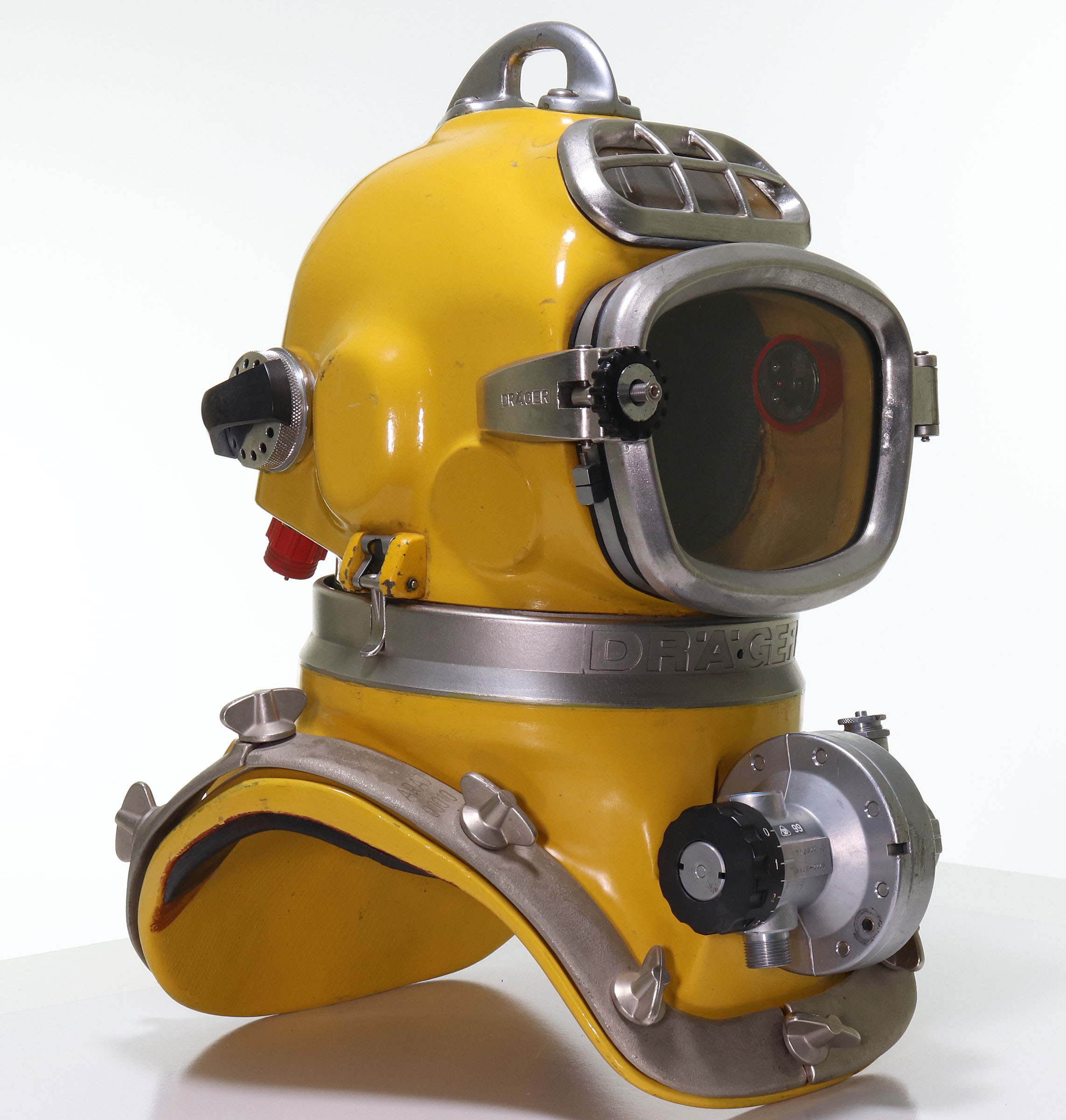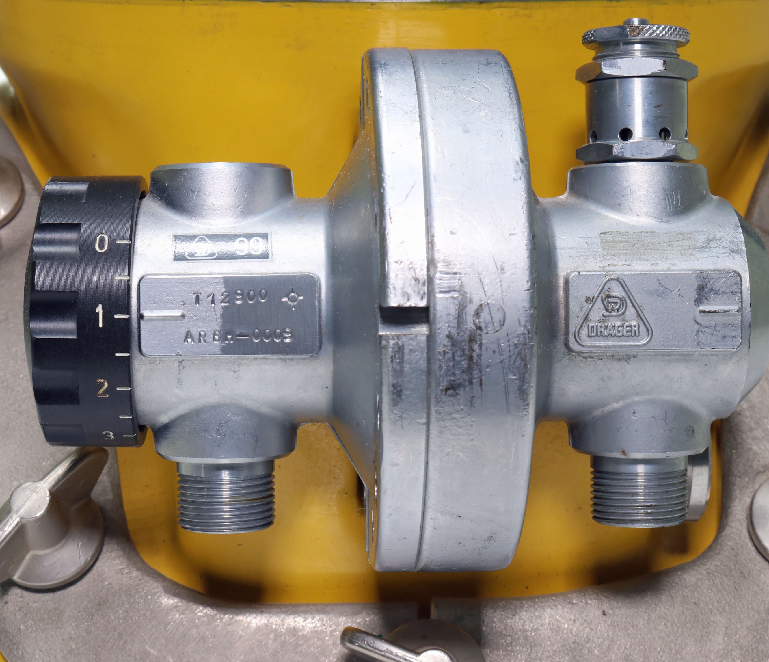 This example is in excellent condition with only very slight blemishes present in the yellow paint. It does feature the large regulator mechanism on the front of the breastplate. The regulator is serial #99. A sticker on the inside of the breastplate also has #99 on it. All of the original components are intact including the twelve wing nuts and brails. The brails have ARAJ 0010 on them. The helmet weighs approximately 48 pounds. This is an impressive helmet design reminiscent of the much older copper and brass German helmets.