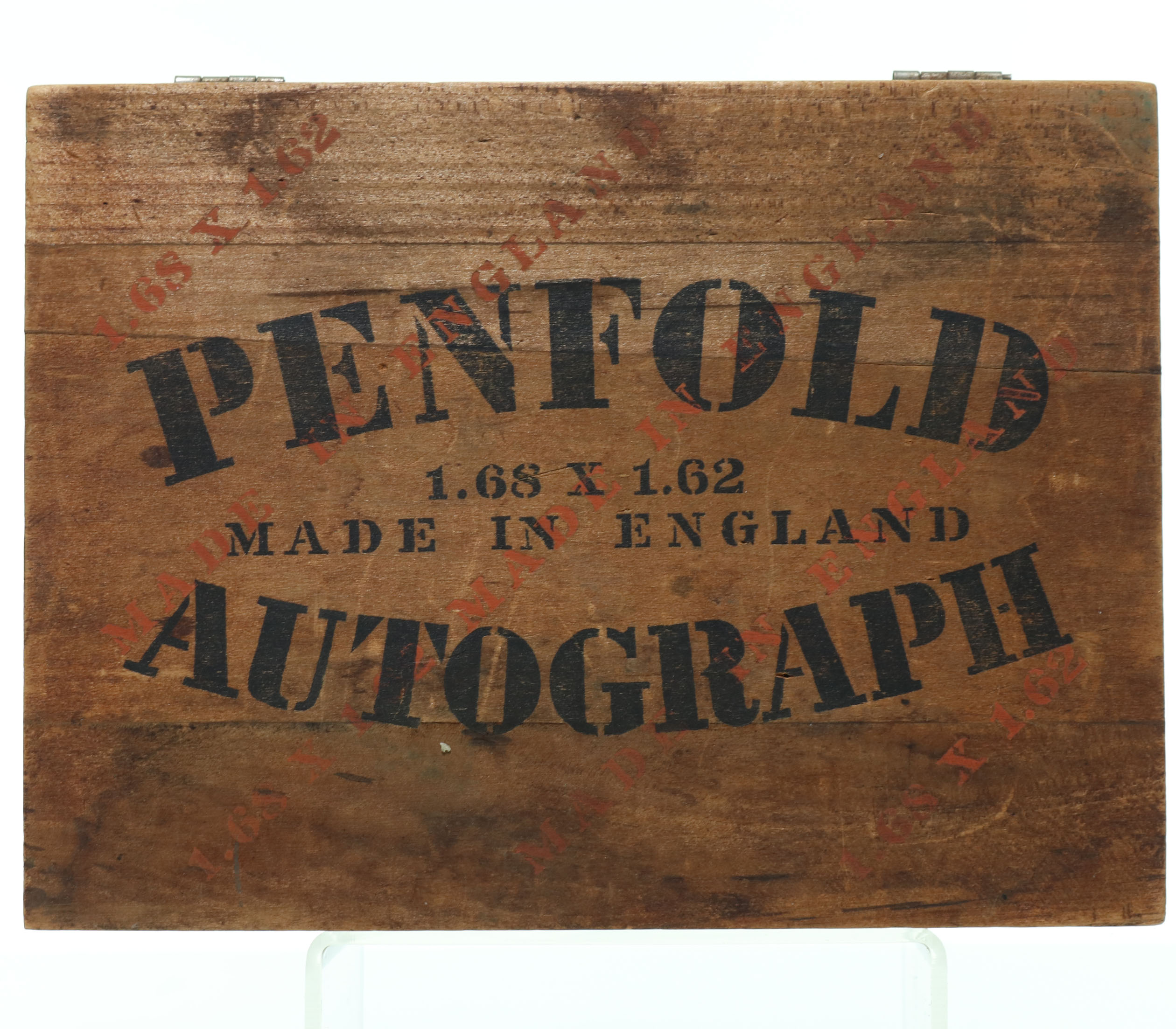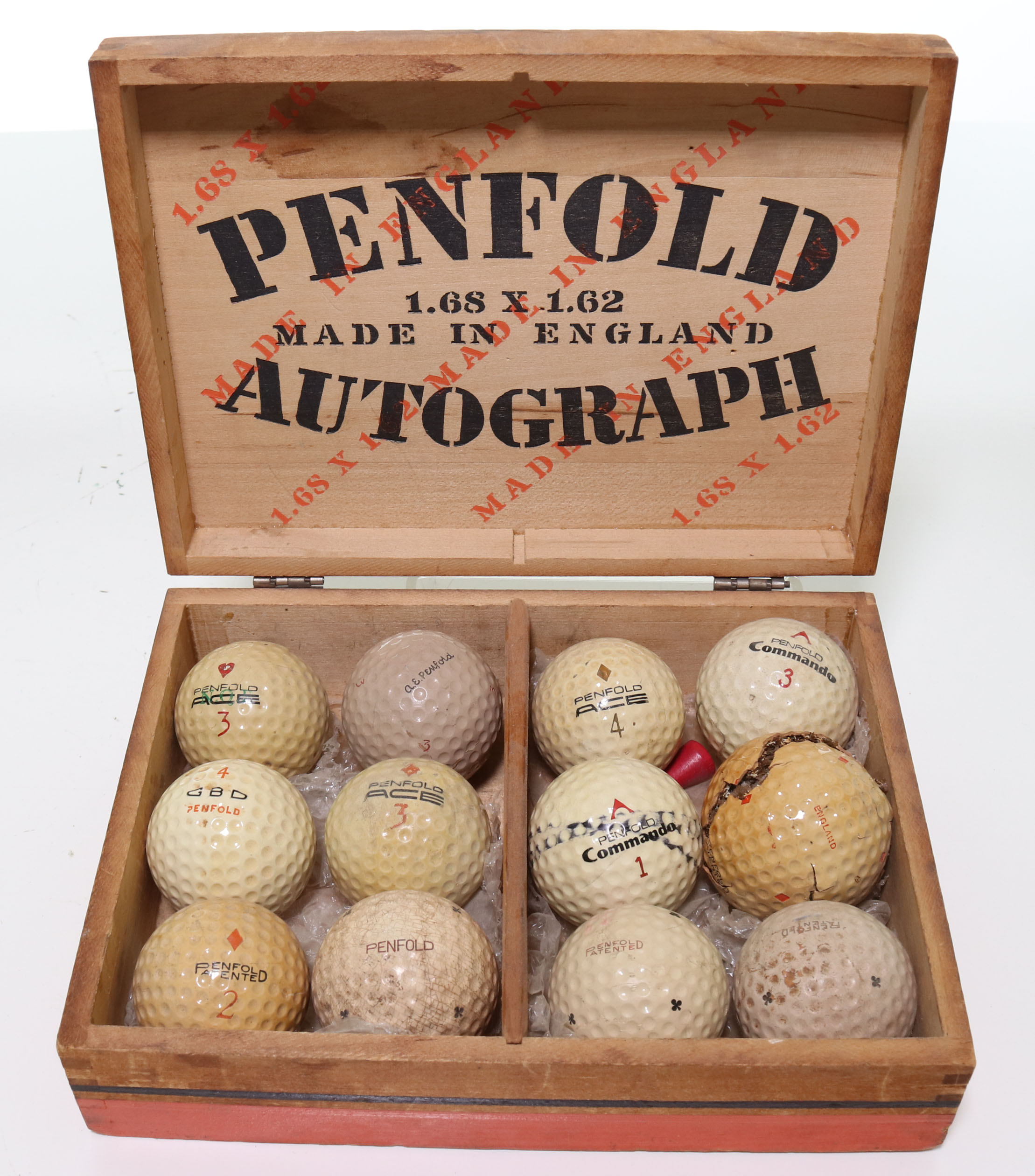 This is a very nice old wood Penfold Autograph model golf ball box. Inside are twelve various models of Penfold balls in various models and conditions. The wood box is in very good condition with metal hinges intact. Please refer to the photos.