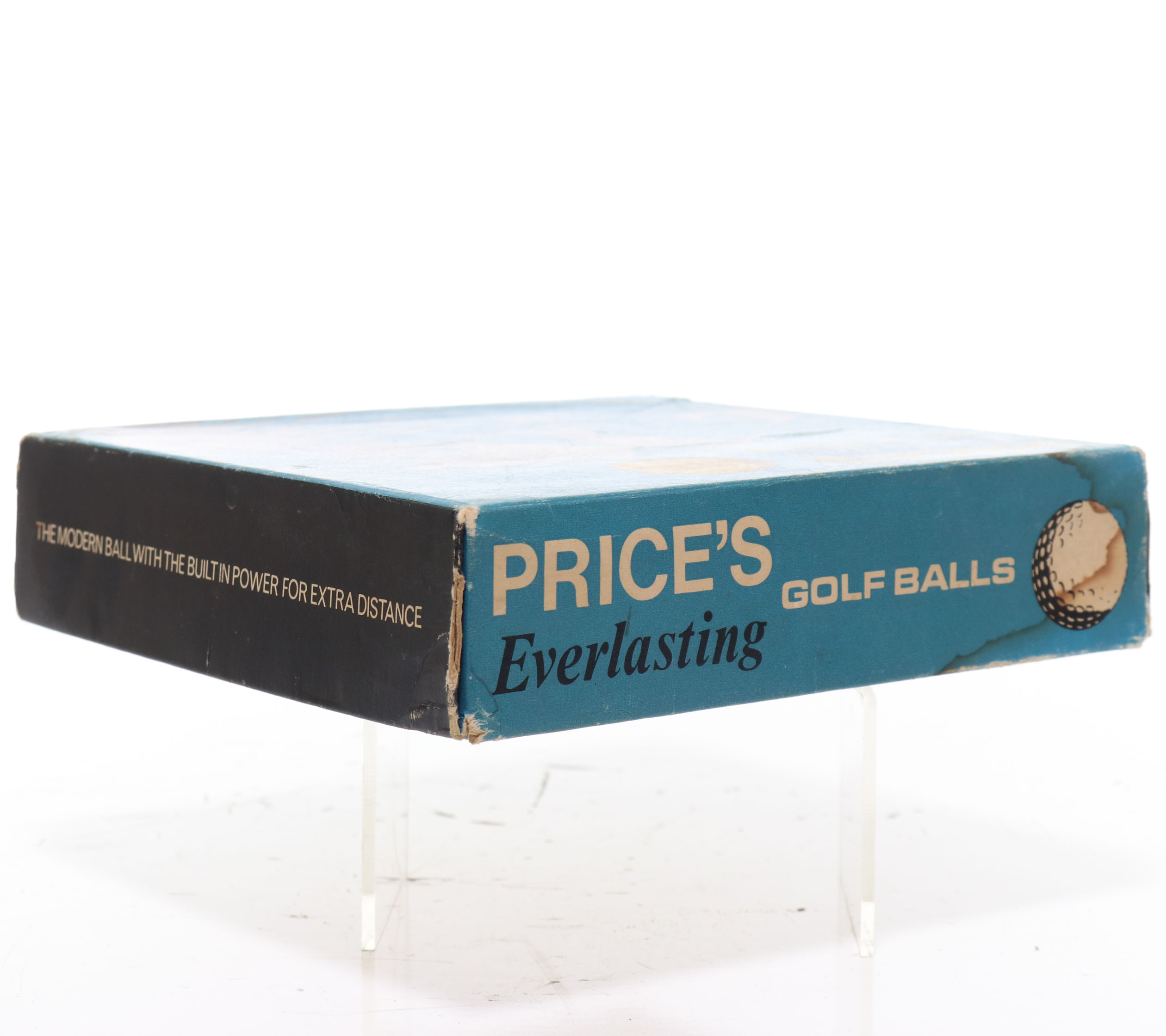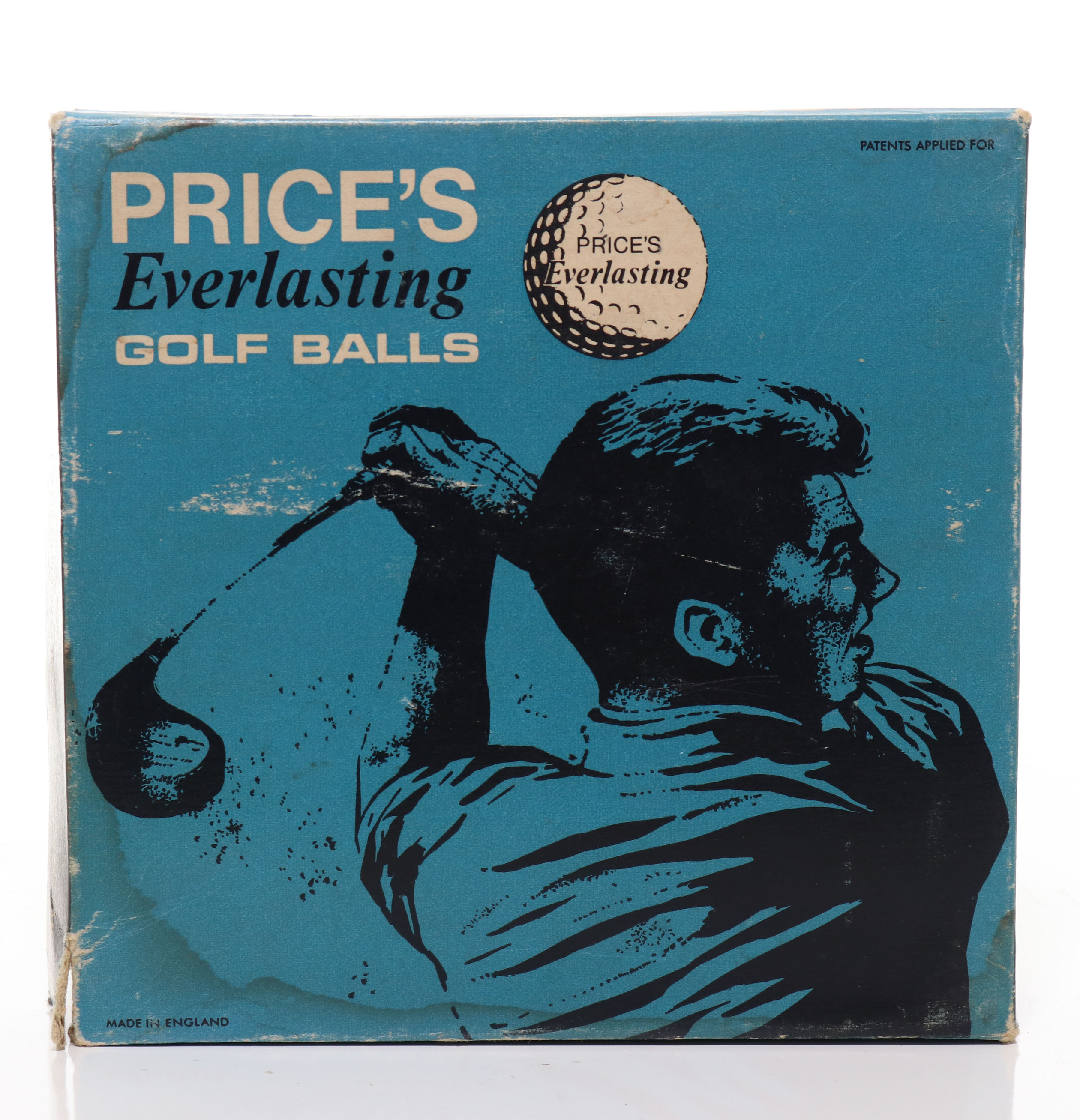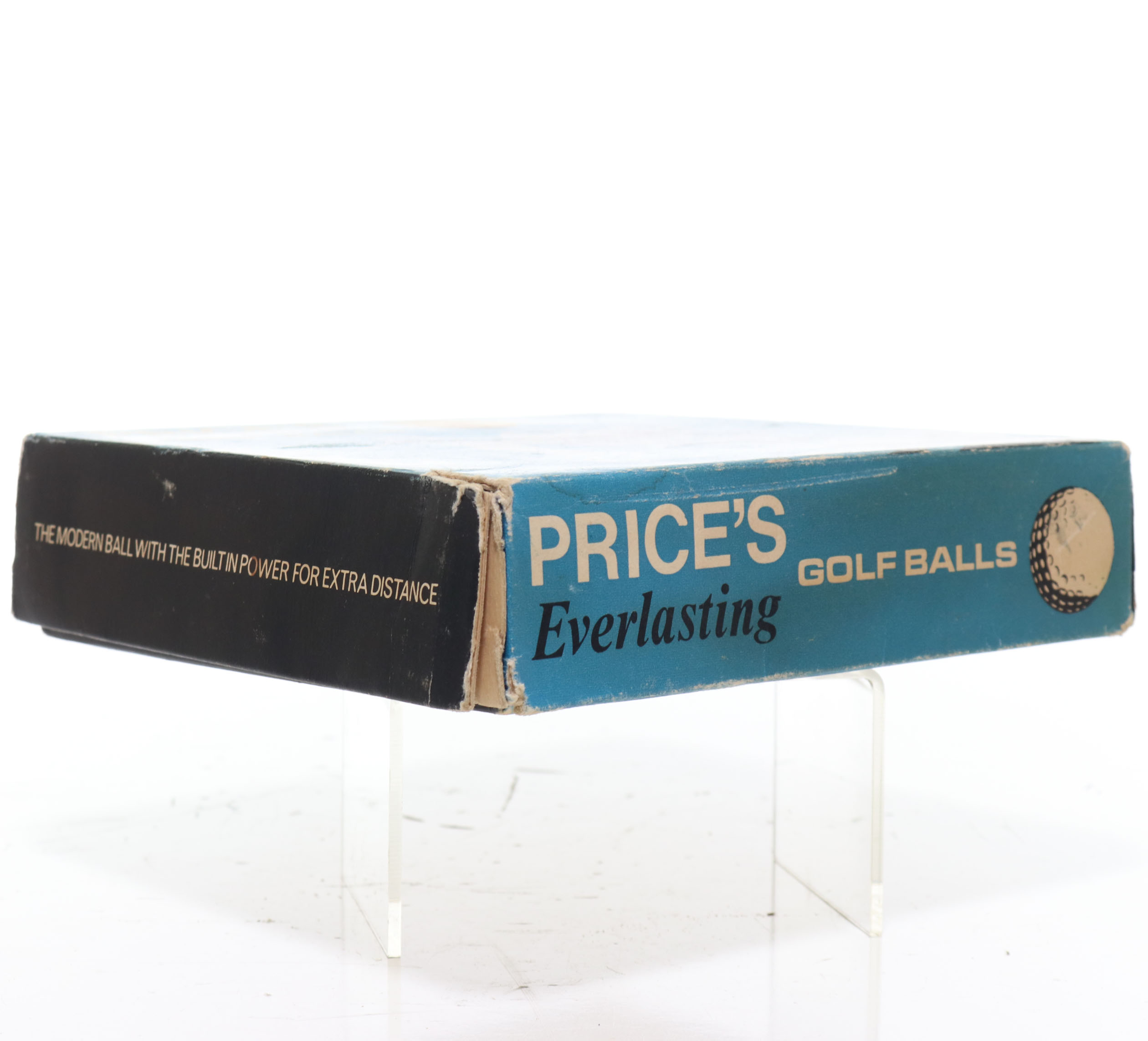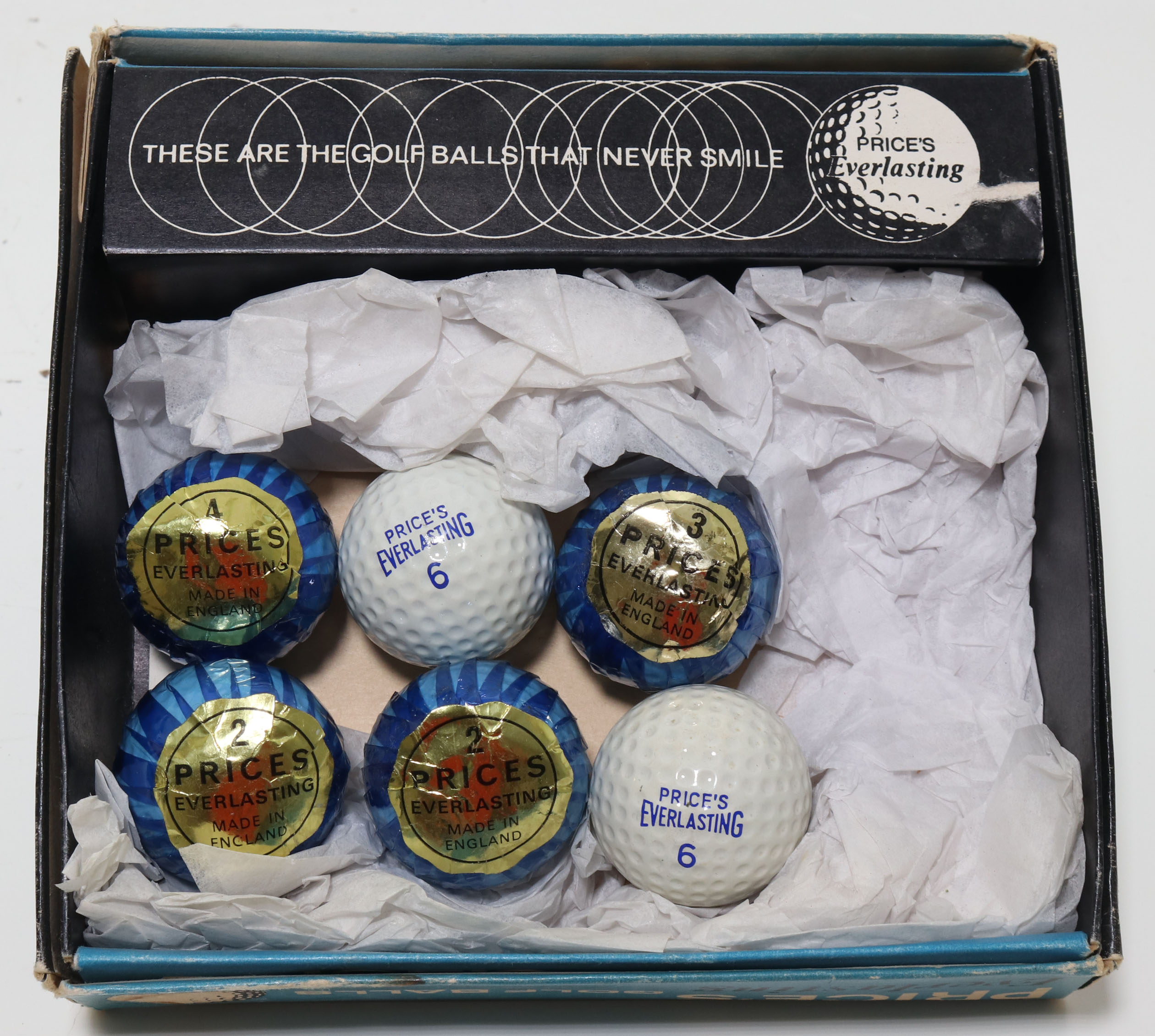 This is a nice box of Price’s Everlasting golf balls. Six of the original balls are intact and appear to be in like-new condition. Four of them still have the blue wrapping on them. The outside box is in fine condition with signs of shelf wear, blemishes, and slight staining. Please refer to the photos.