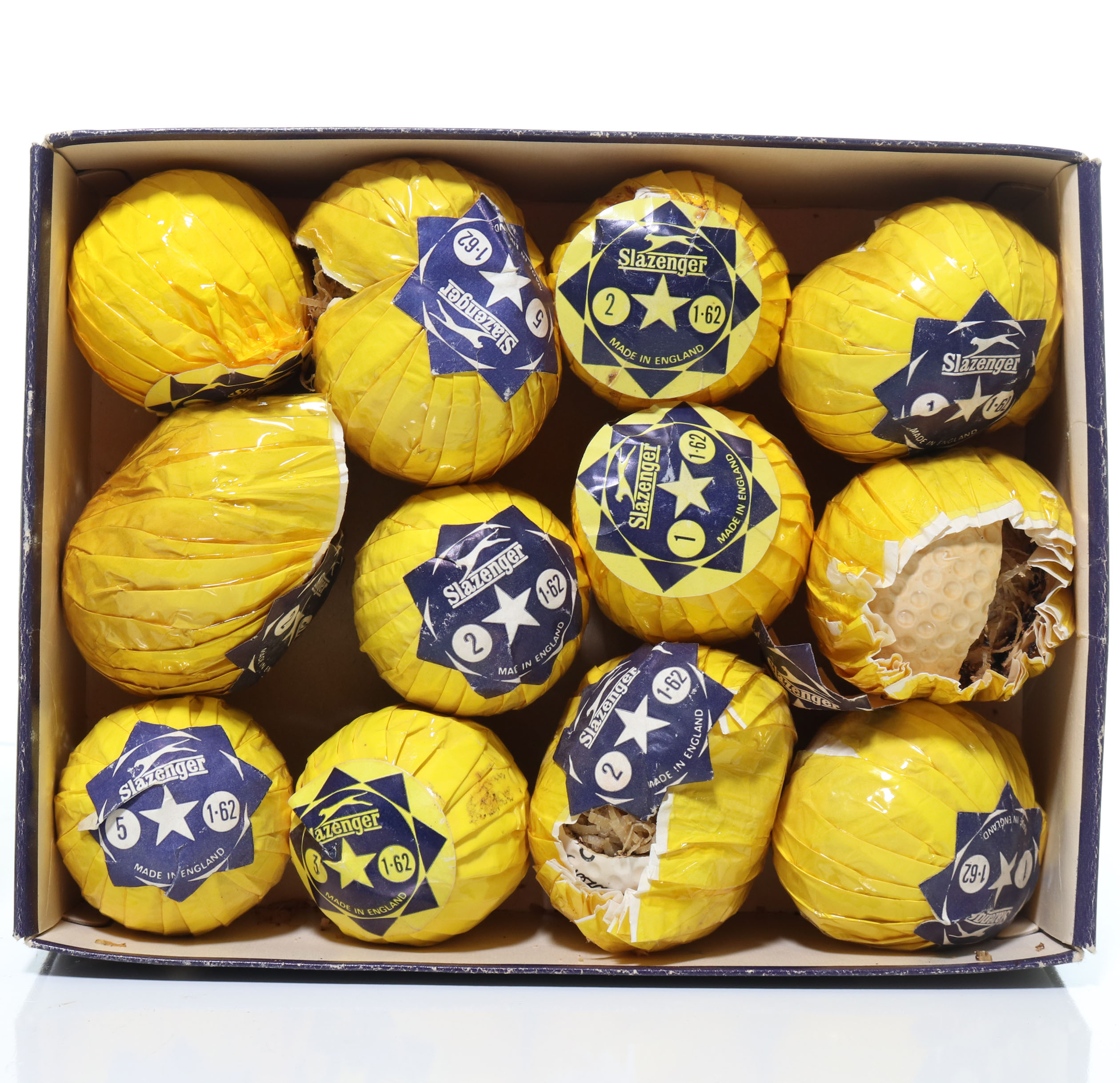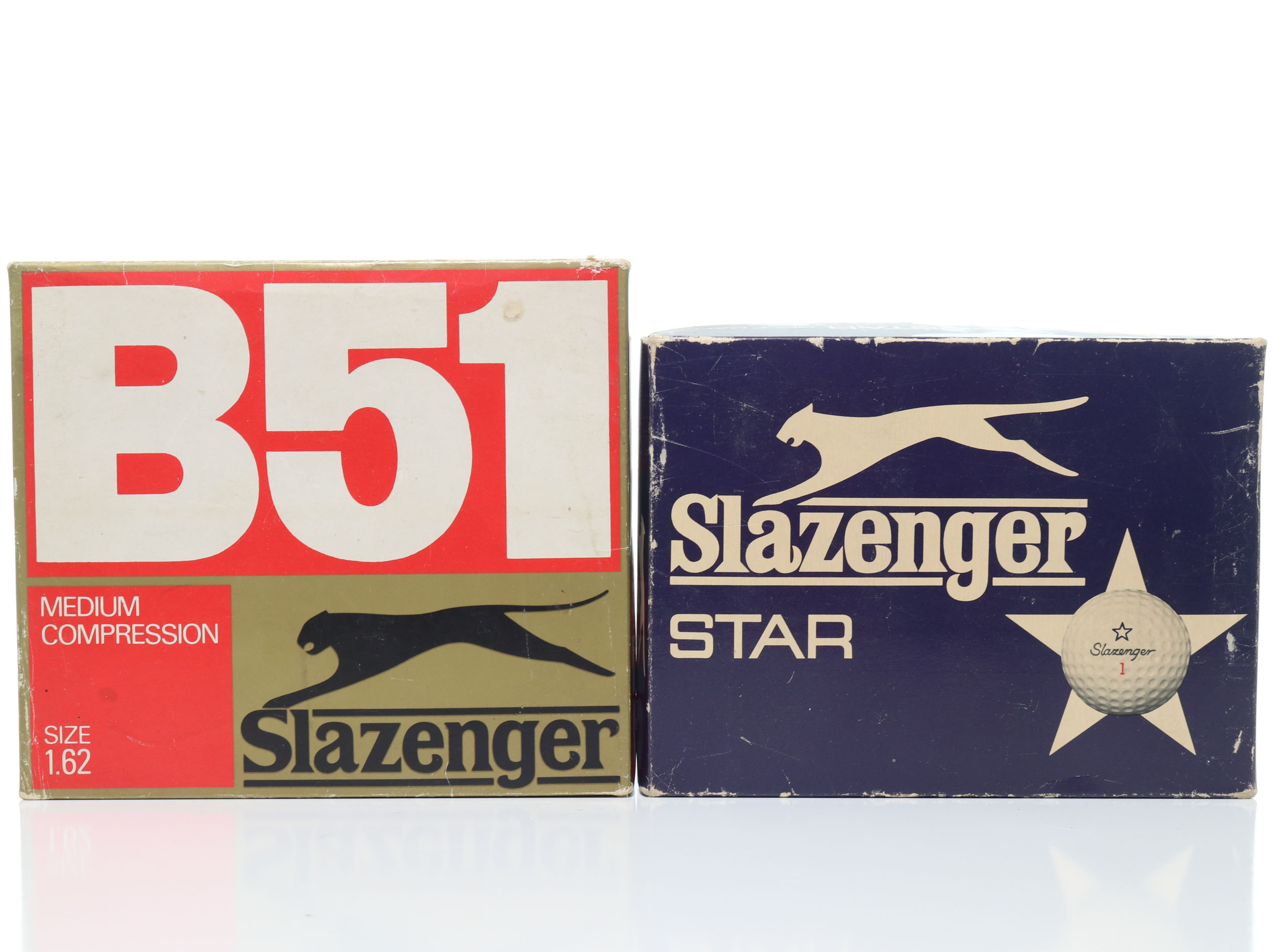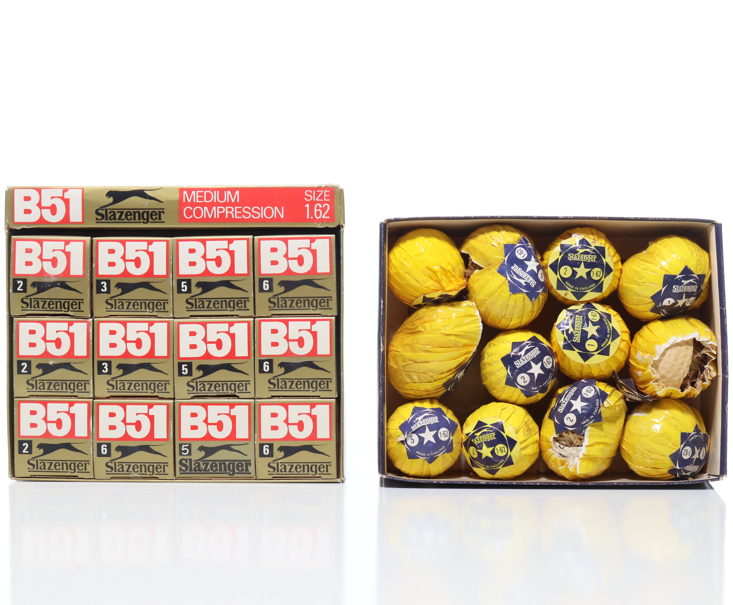 This lot features two boxes of golf balls made by Slazenger. One box is the Star model balls. All 12 balls are intact and in their original yellow wrappers and labels. Please note that approximately half of the balls appear to have expanded in size significantly. The second box is model B51 medium compression balls. All dozen are intact in their individual boxes. Please refer to the photos for exterior box conditions.
