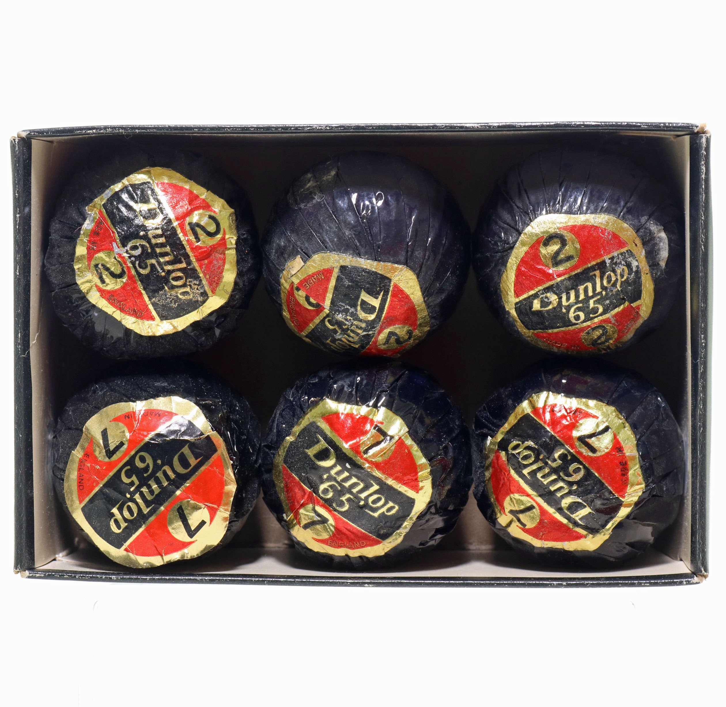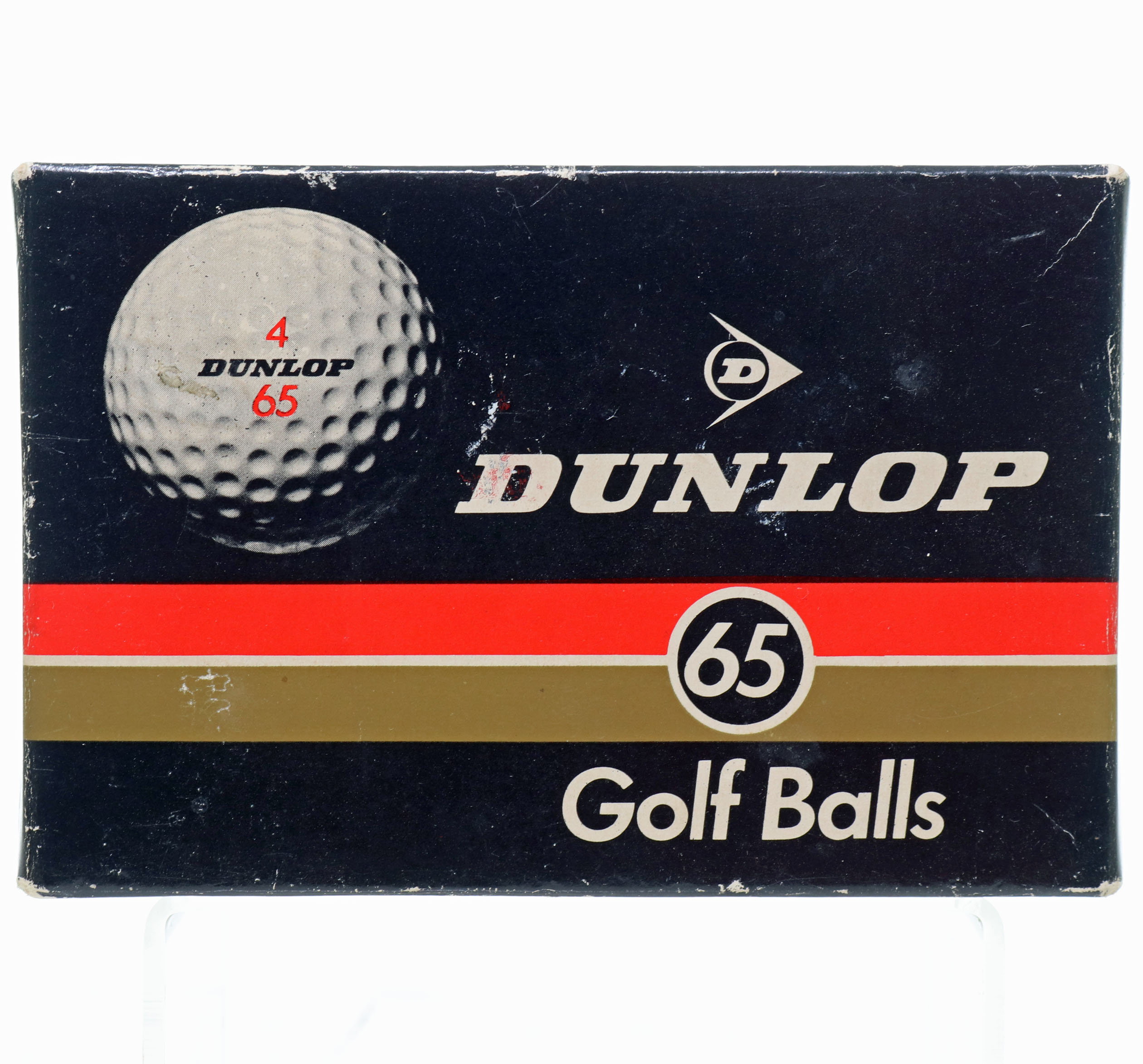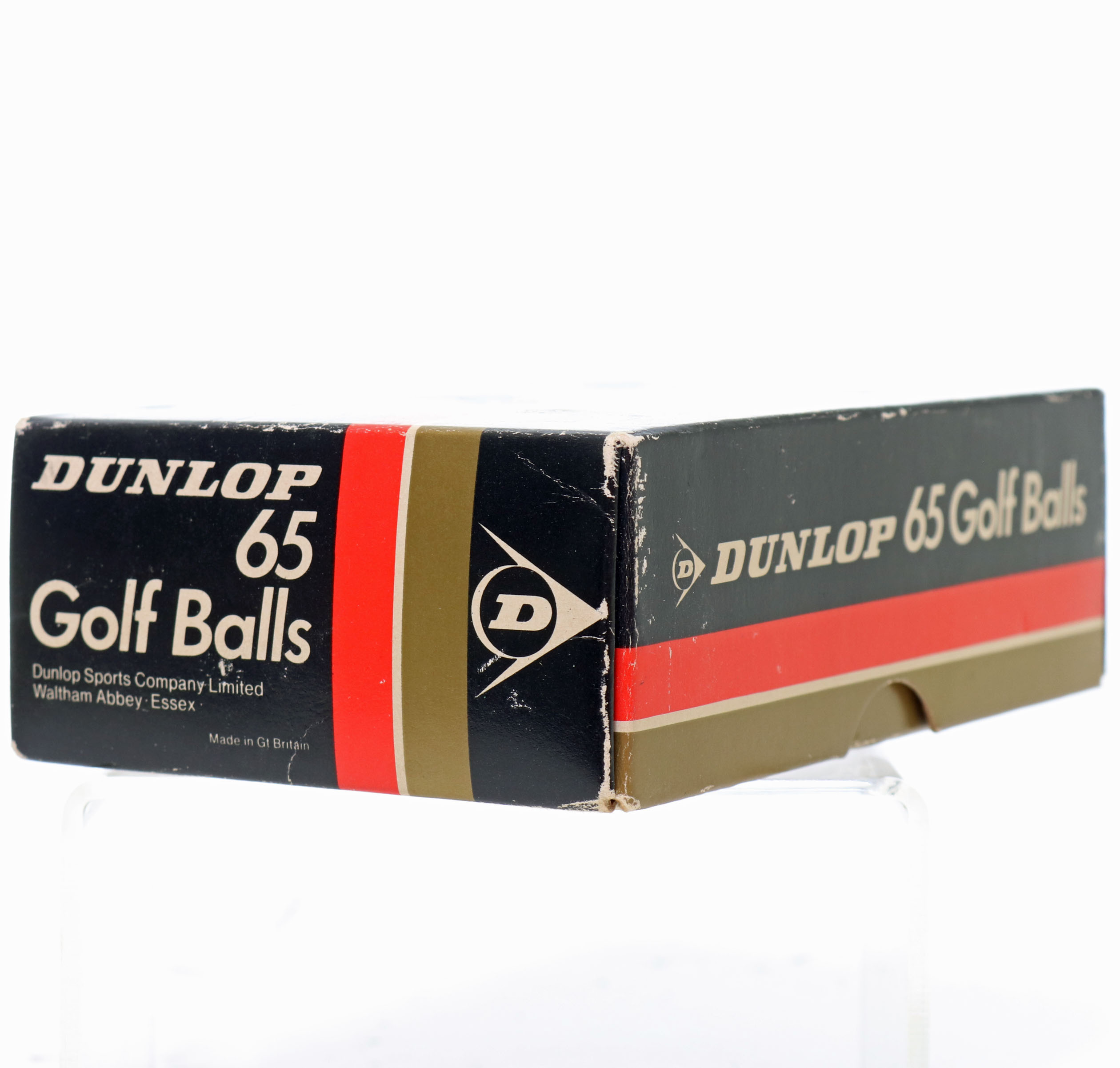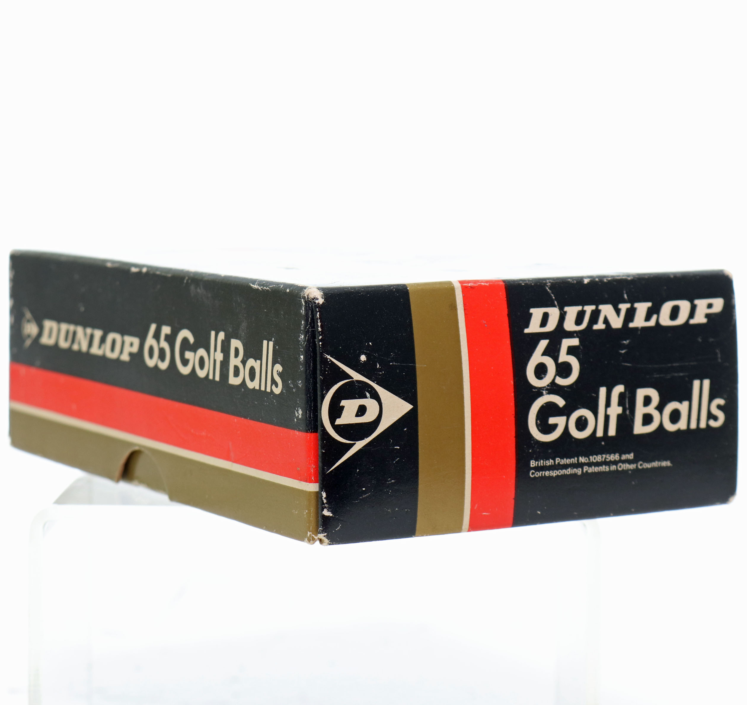 This is a complete small box of six British Dunlop 65 golf balls. All six of the balls are present in their original black wrappers and labels. Please refer to the photos for exterior box condition.