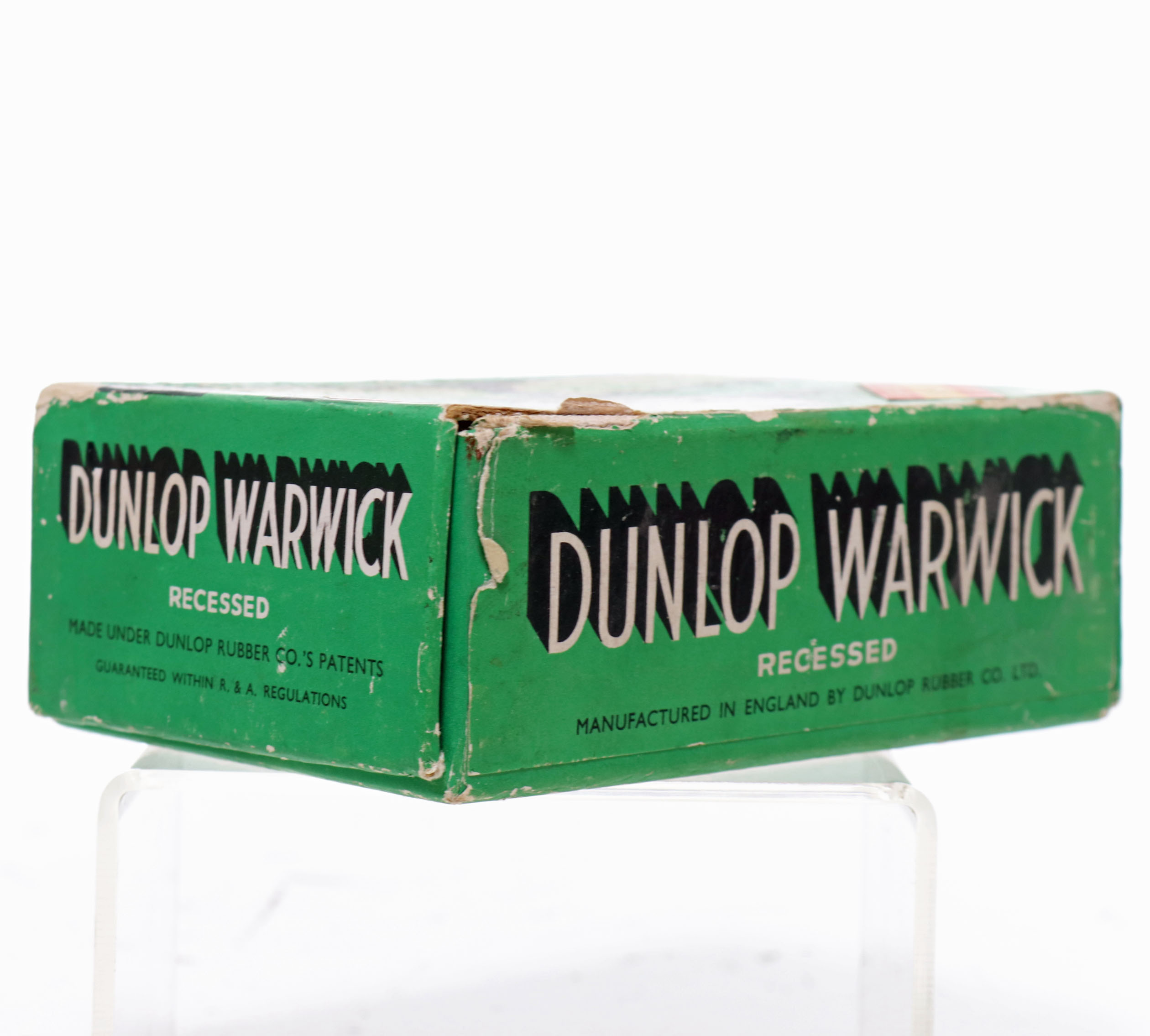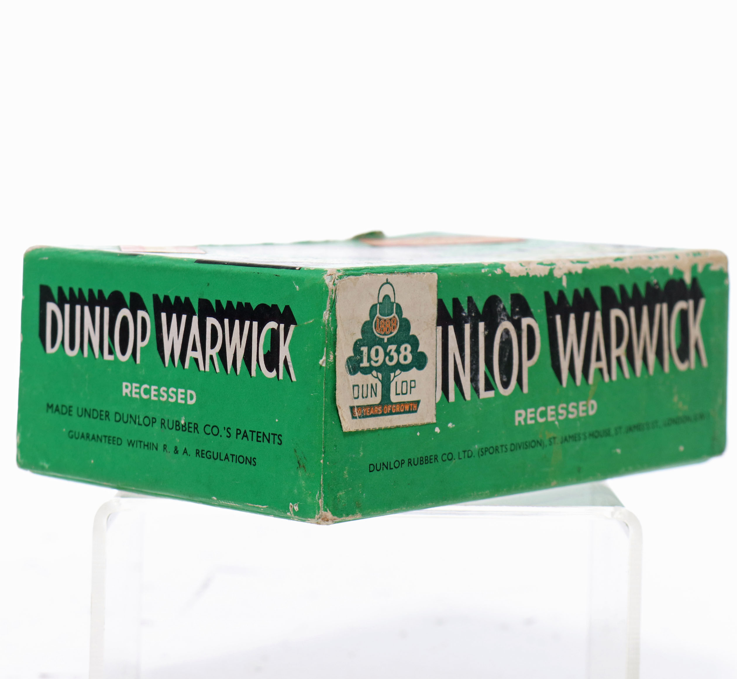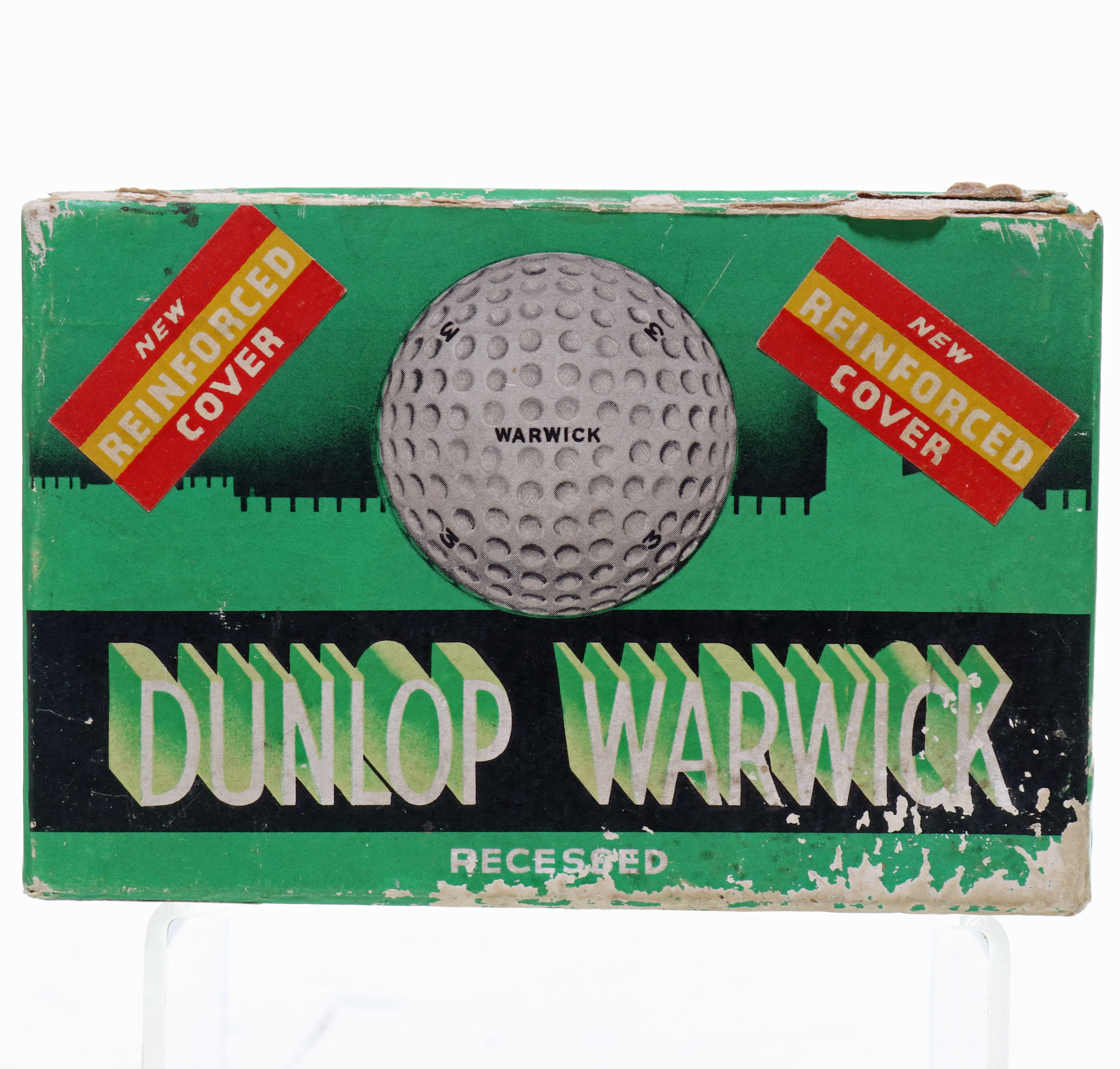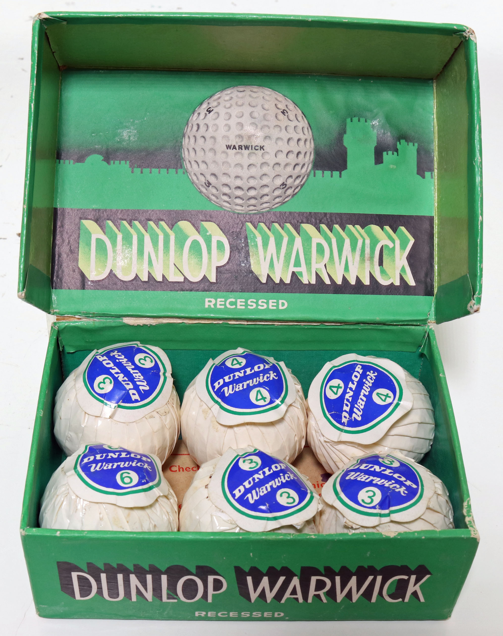 This is a complete small box of six British Dunlop Warwick Recessed golf balls. All six of the balls are present in their original white wrappers and labels. Inside, an original inspection label is still present as well. Please refer to the photos for exterior box condition.