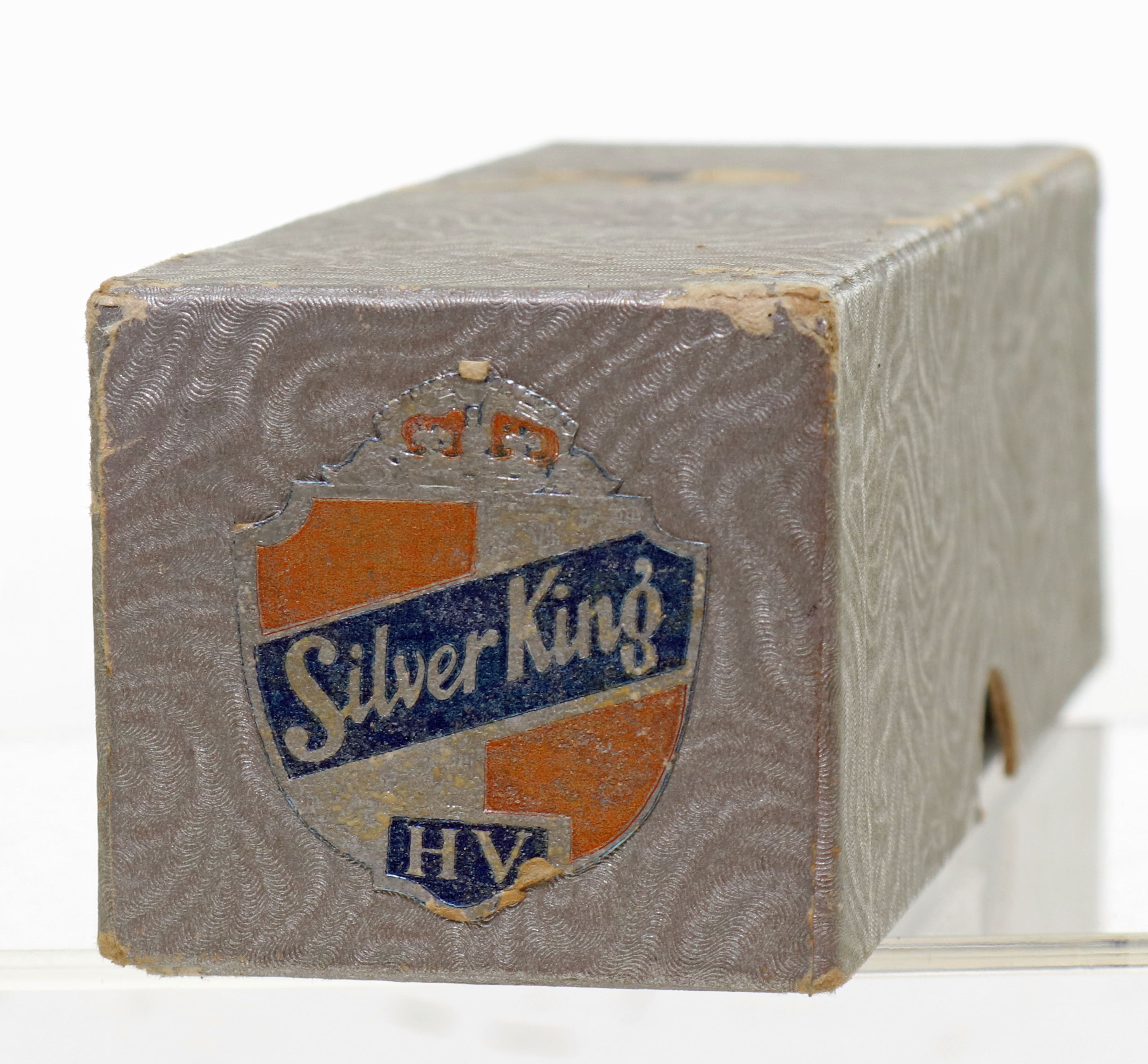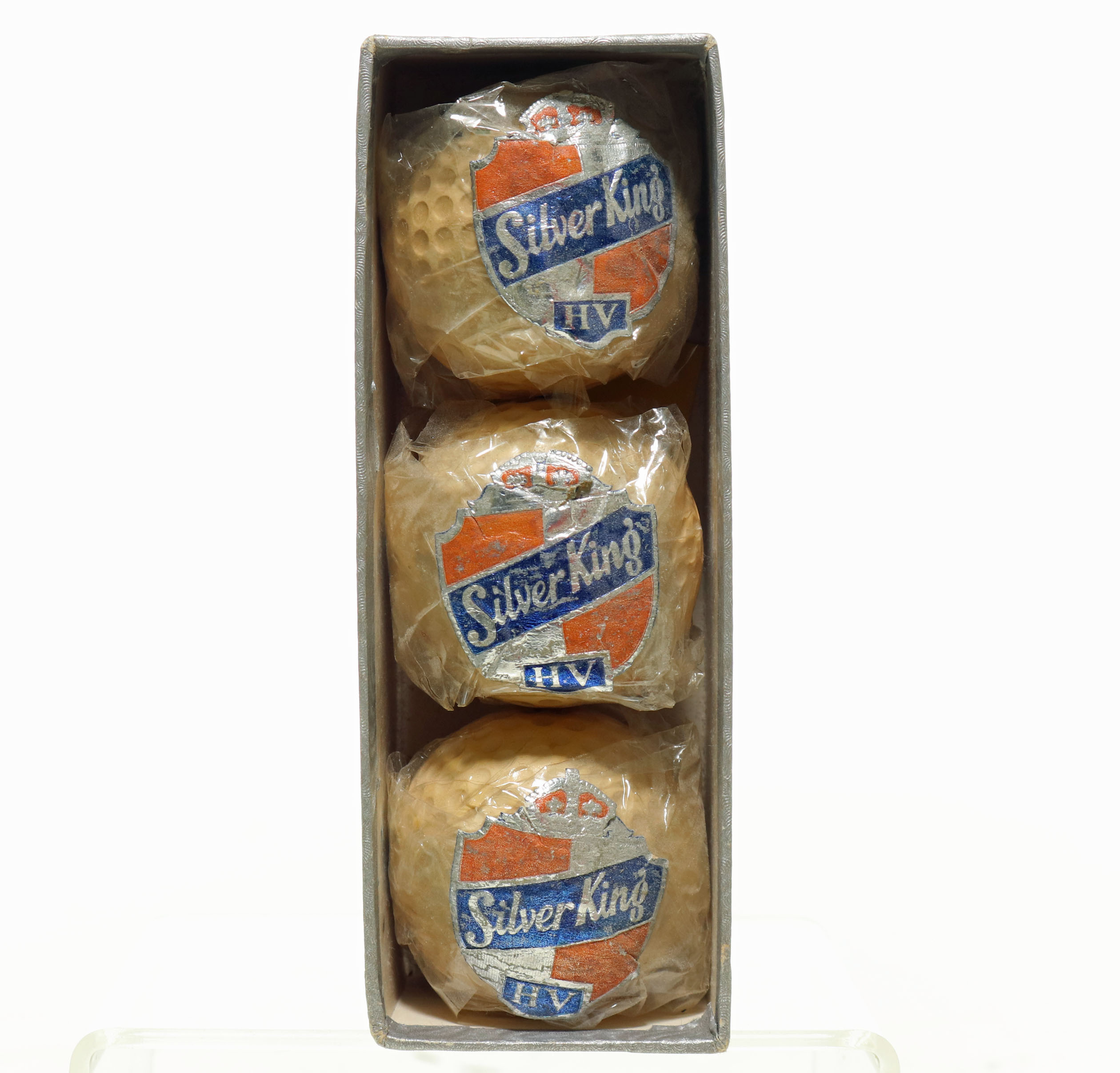 This is an original cardboard box or sleeve of three Silvertown Silver King HV golf balls. Three original balls in their clear wrappers with labels are still intact. The balls are in new old stock condition. Box is in very nice condition. Circa 1930’s.