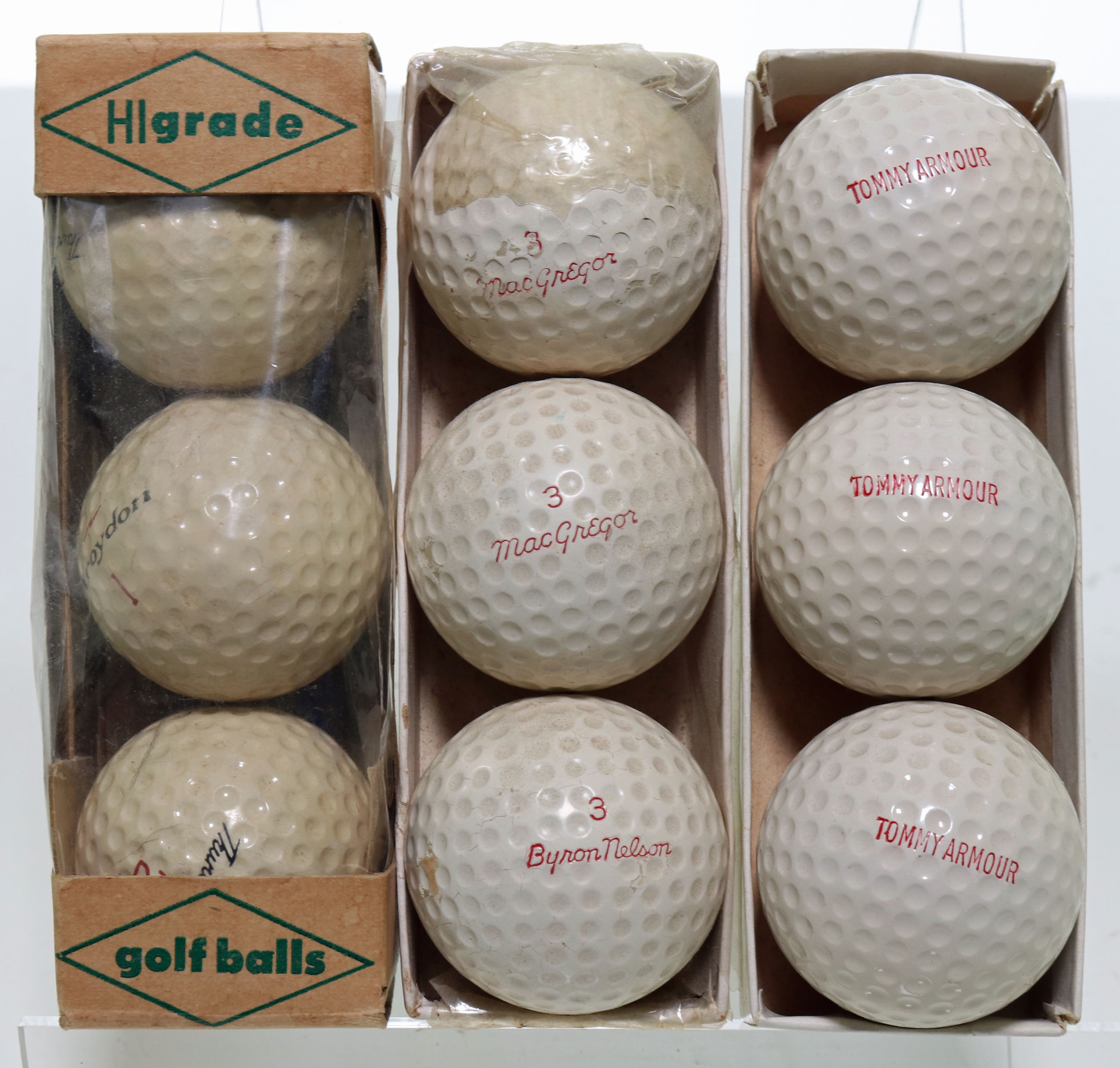 This is a lot of three individual sleeves of vintage new old stock golf balls. Each trio of balls is in its original packaging. This lot includes Hi Grade Kroydon Thunder Bolt balls, MacGregor Byton Nelson balls, and Tommy Armour balls. The balls are in new old stock condition.