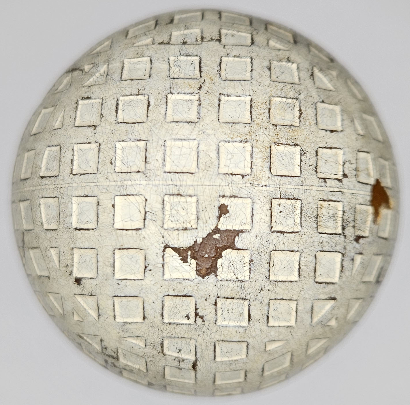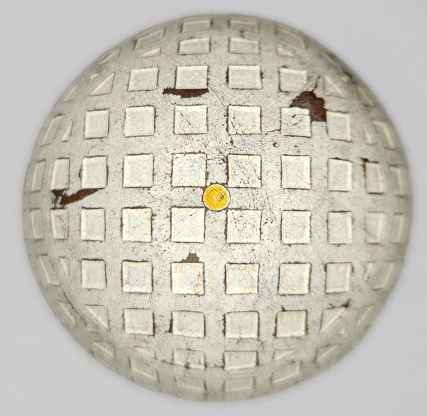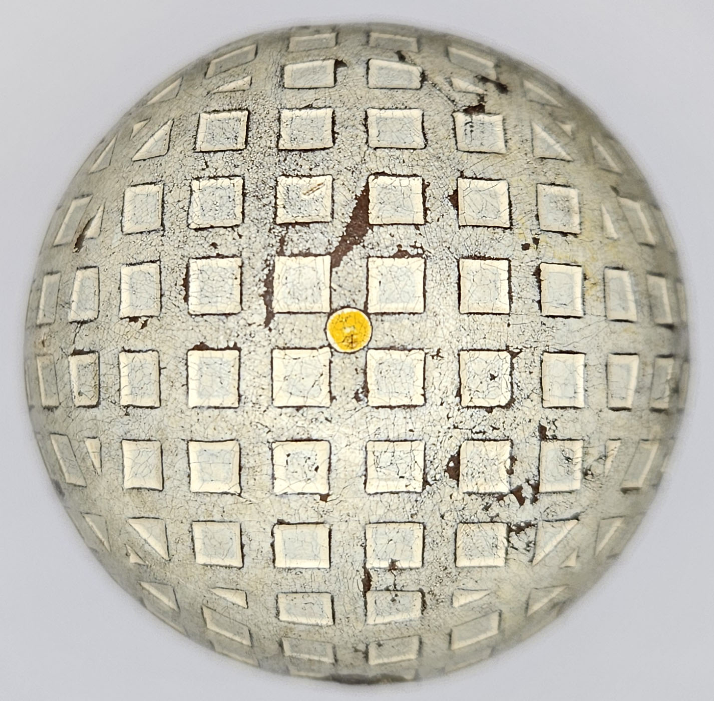 This is an antique mesh pattern golf ball orange dot model. This ball is circa 1920 and features a single orange dot on each pole. Some evidence of use, one very shallow cut, some surface wear. 1.68” diameter. Please refer to photos.