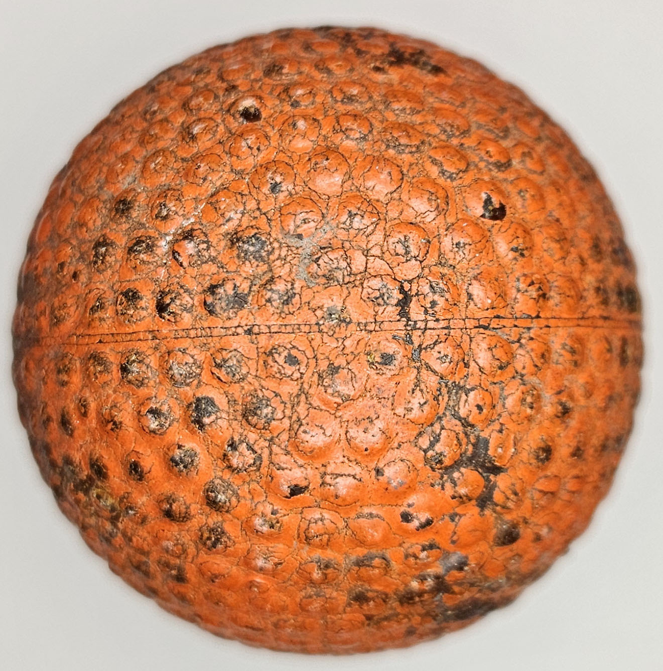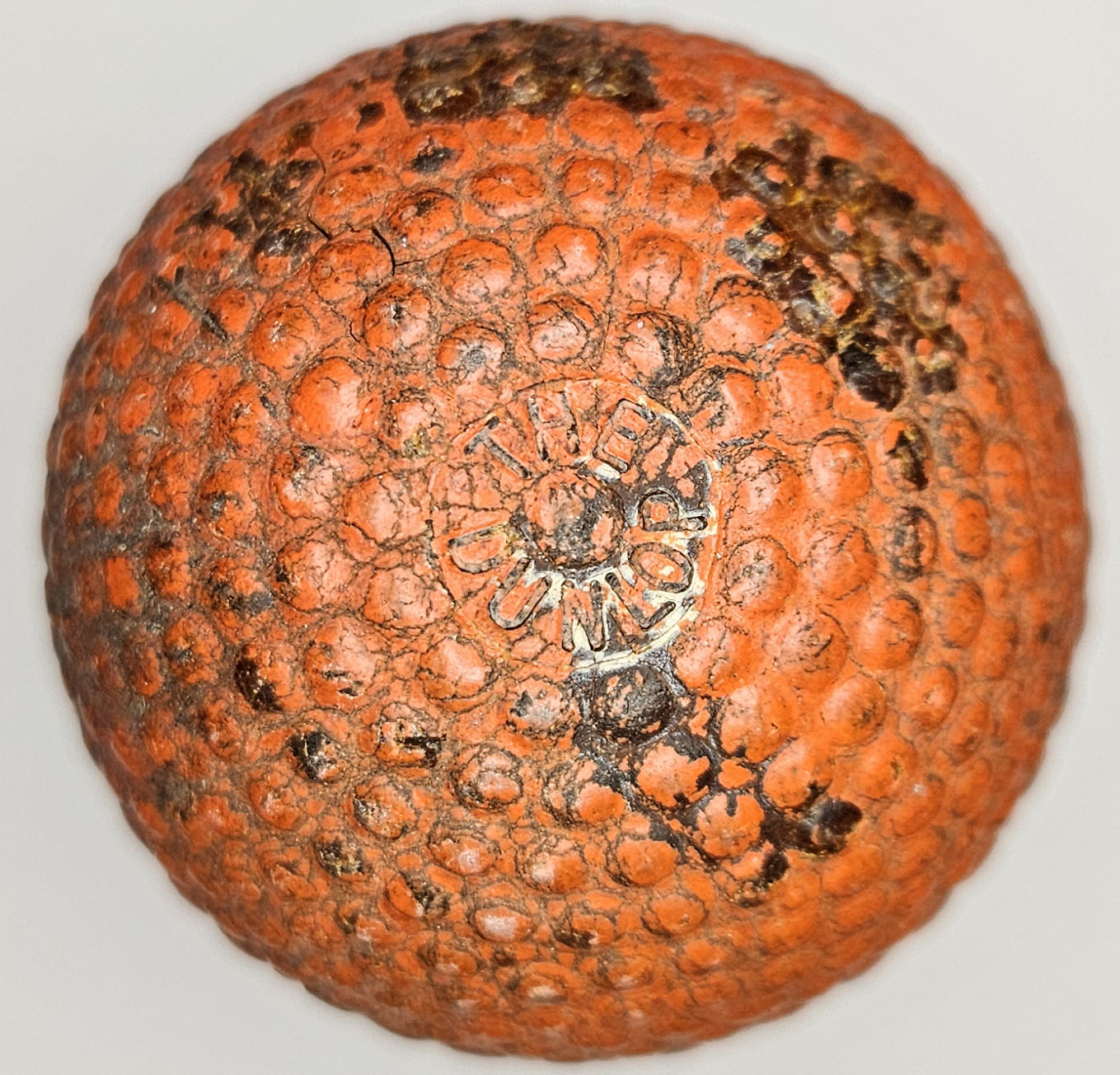 This is an antique bramble pattern golf ball made by Dunlop circa 1910’s. This red ball features The Dunlop on both poles. One crack measuring approximately 1” and another connected approximately .5” in length. Great patina to this ball. Please refer to photos.