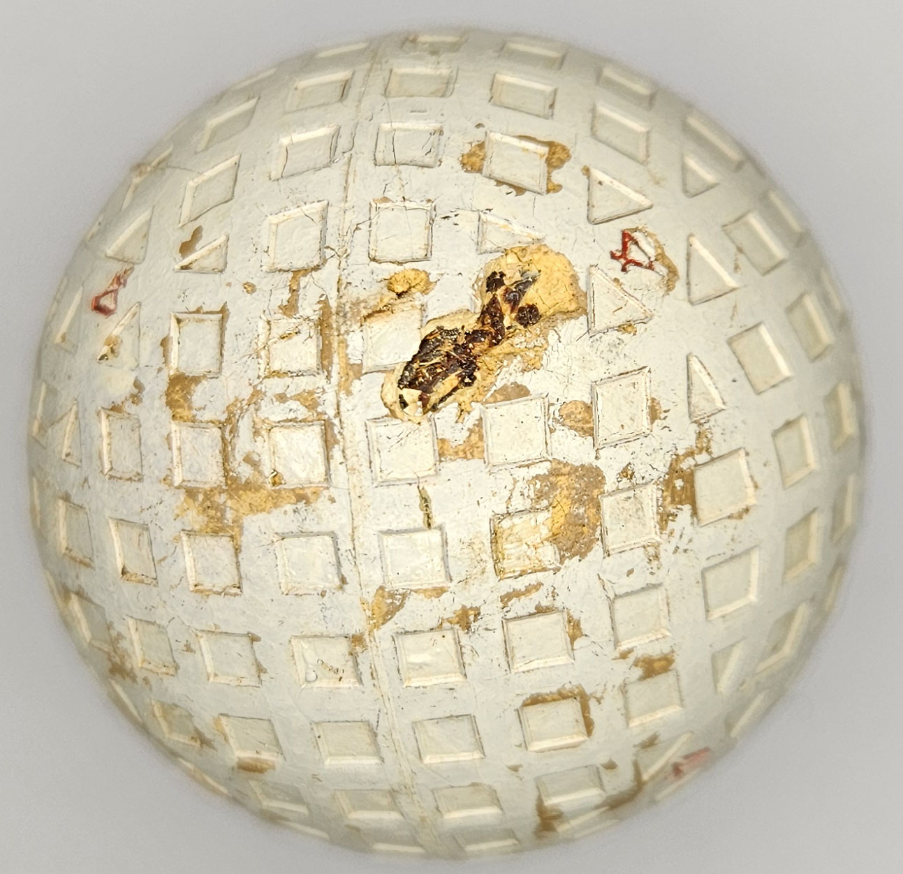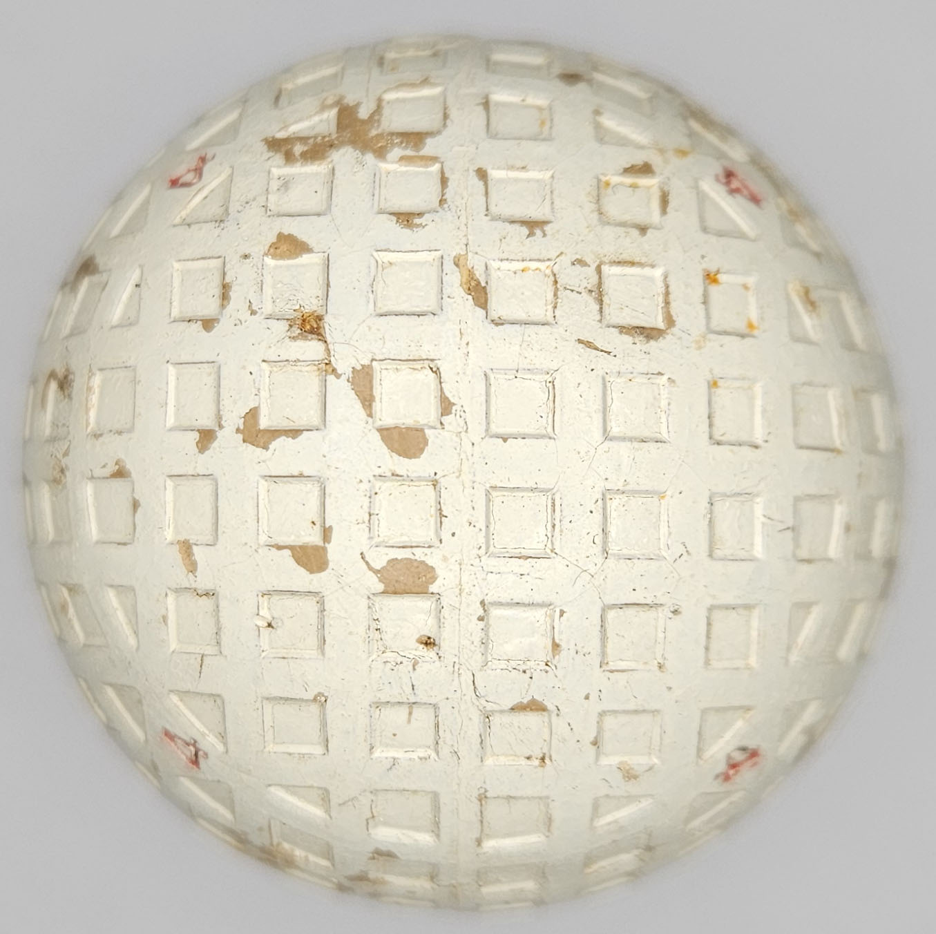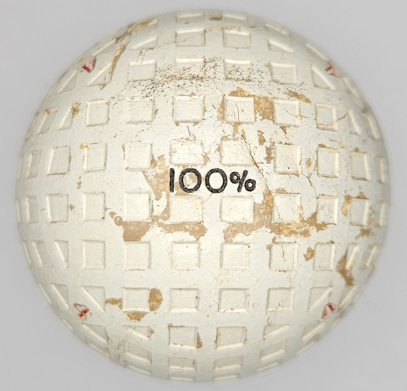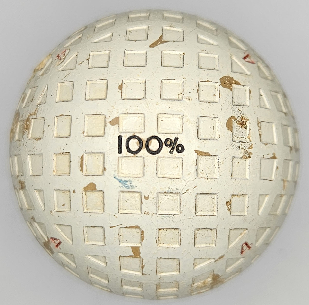 This is a vintage 100% model golf ball with a mesh or square pattern. Both poles feature the 100% stamping, this is a #4 ball. Some surface wear, one 3/8” shallow gash. Please refer to photos.