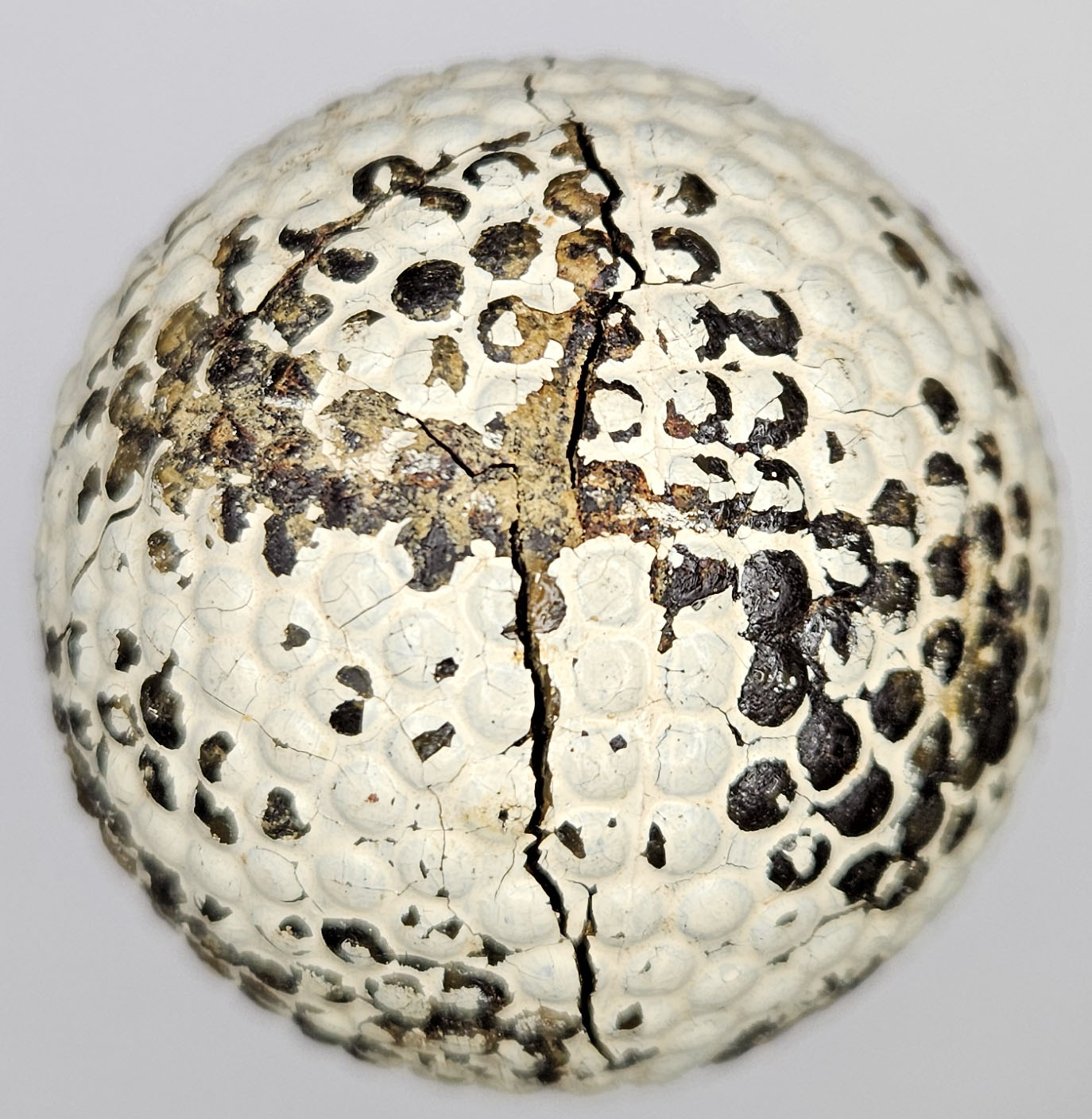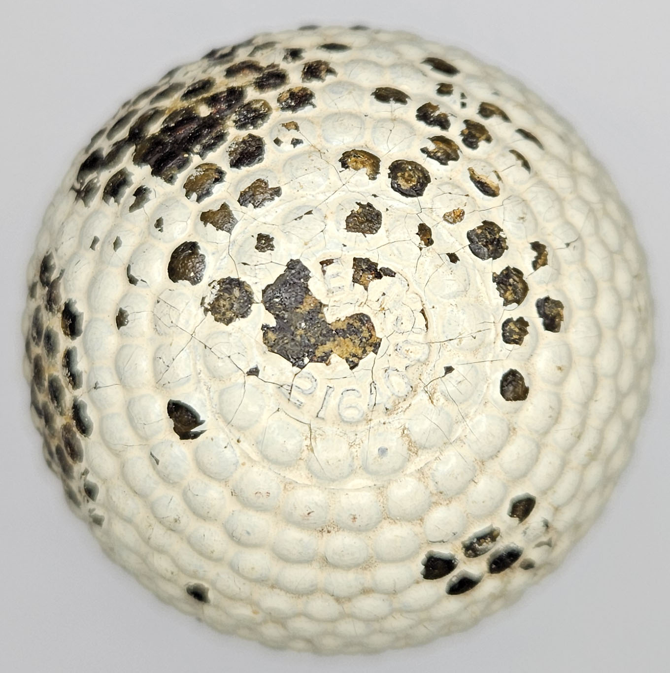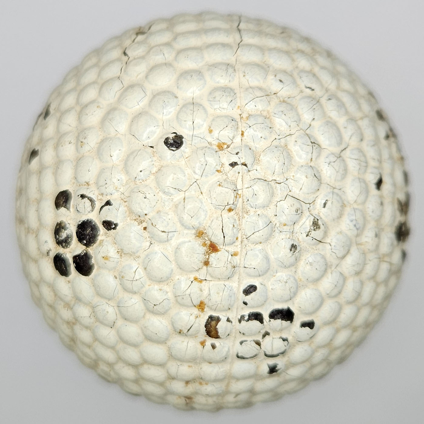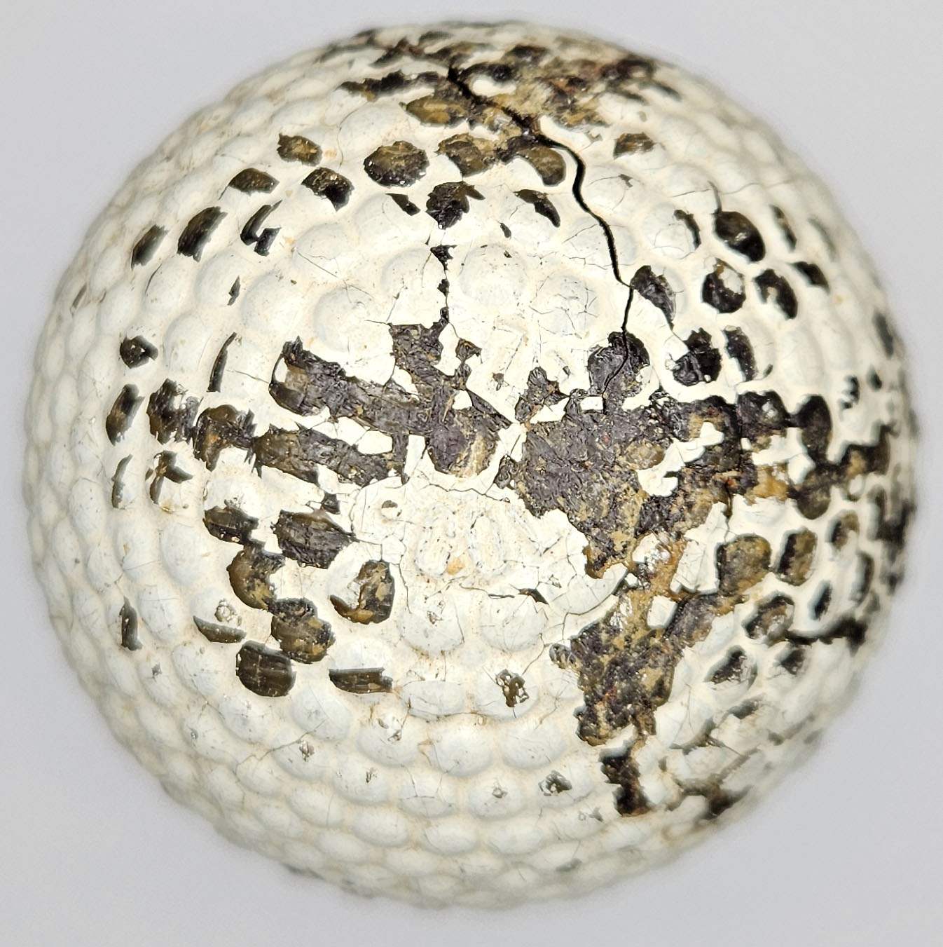 This is an antique bramble pattern golf ball called The Colonel made by St. Mungo Manufacturing Co in Newark, New Jersey, circa 1910’s. The model name is on one pole, the patent number is on the other pole. The ball has numerous cracks, still solid and a nice display piece. Please refer to photos.