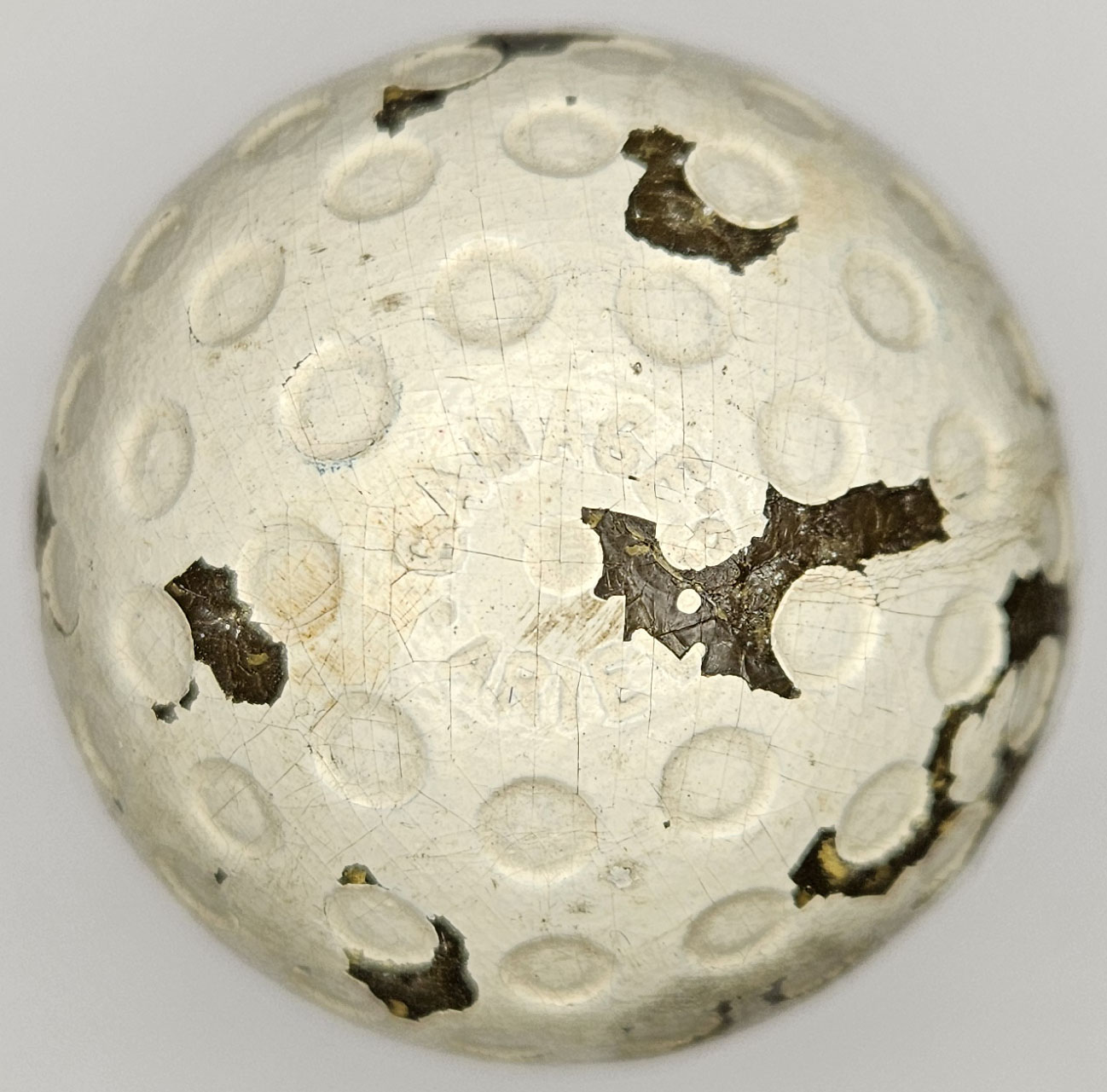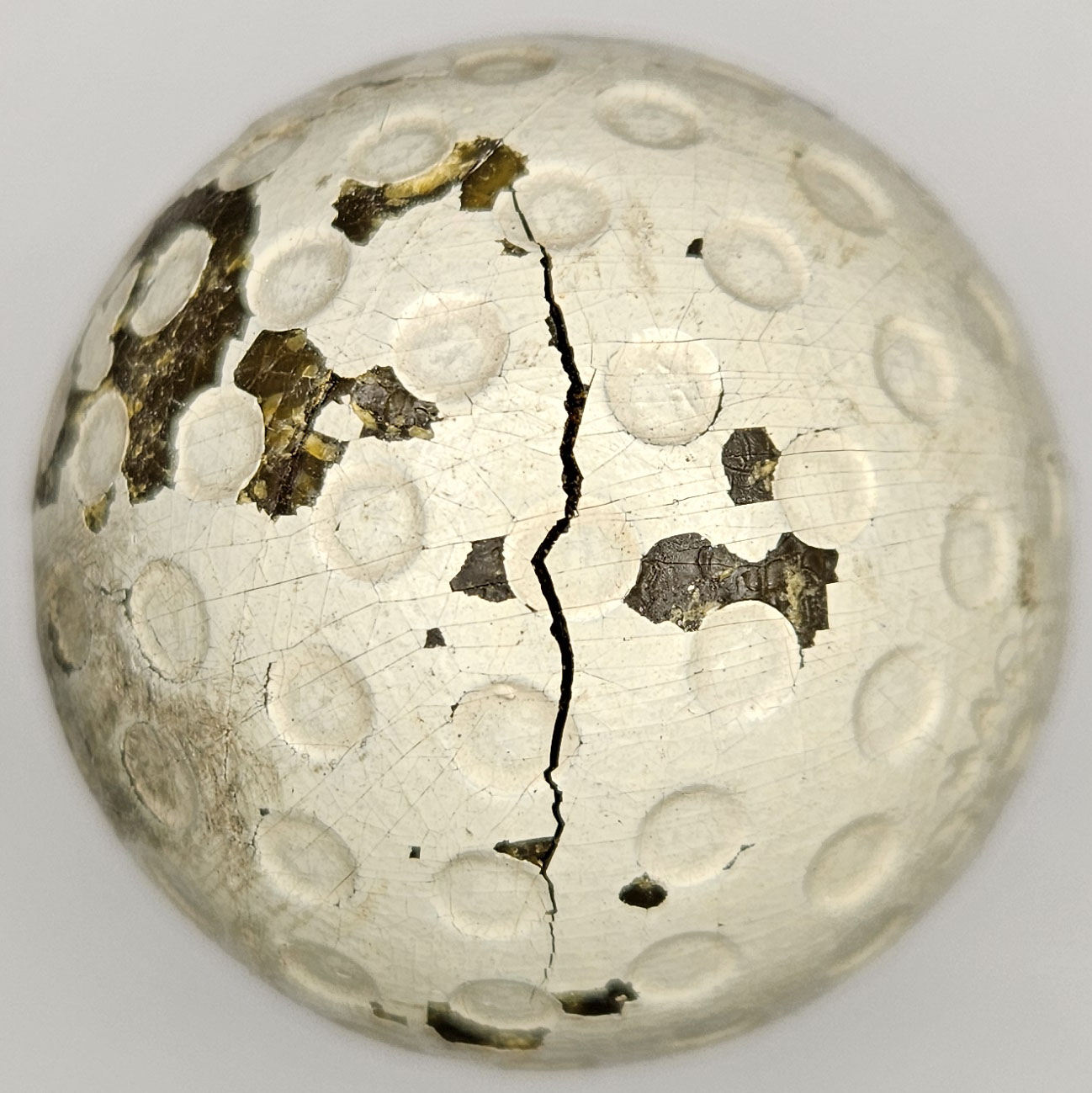 This is a unique antique round disk pattern golf ball made by Gamage’s called the Ariel, circa 1920’s. Gameges Ariel is on both poles. Some white paint loss, one crack. Please refer to photos.