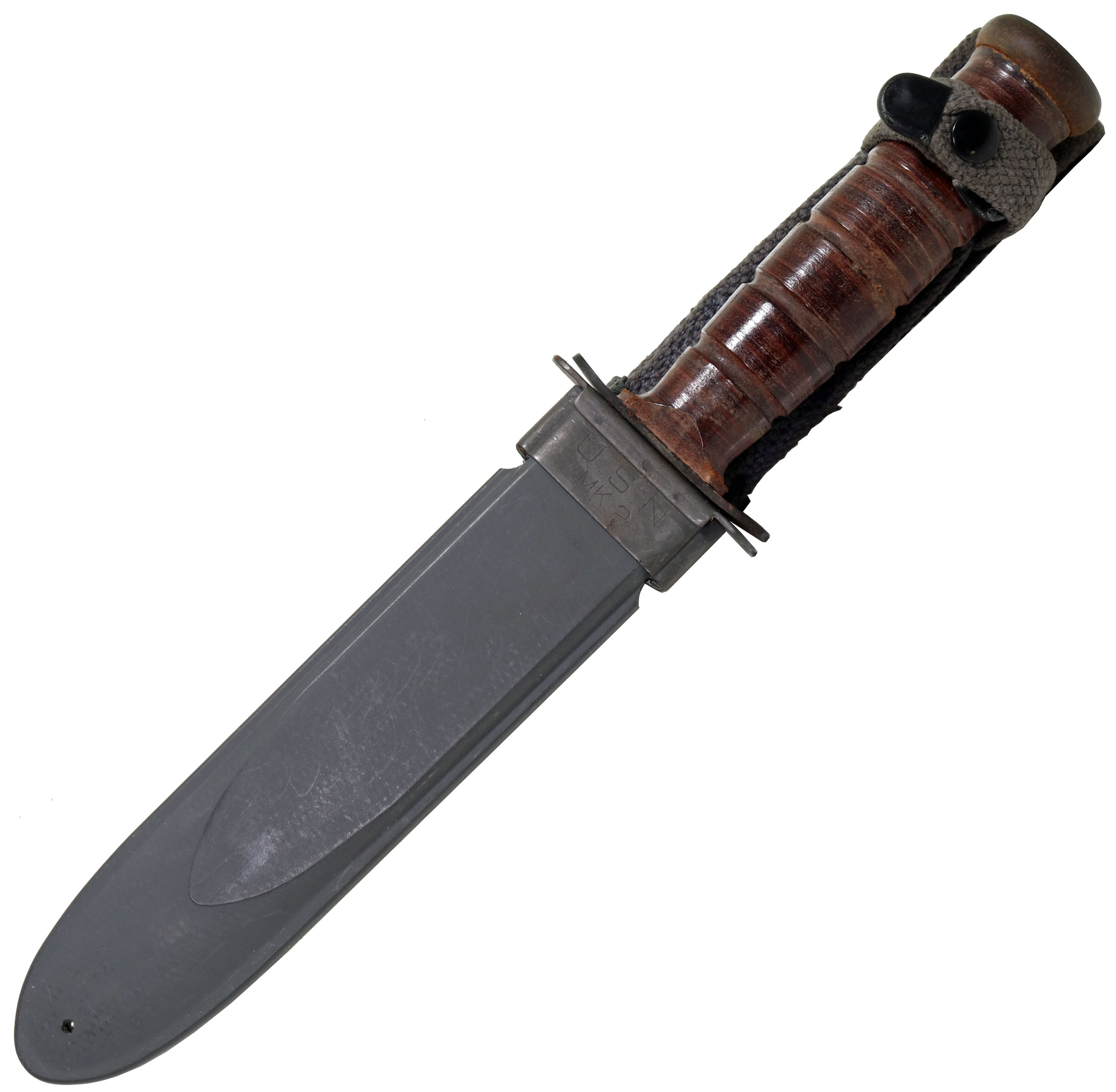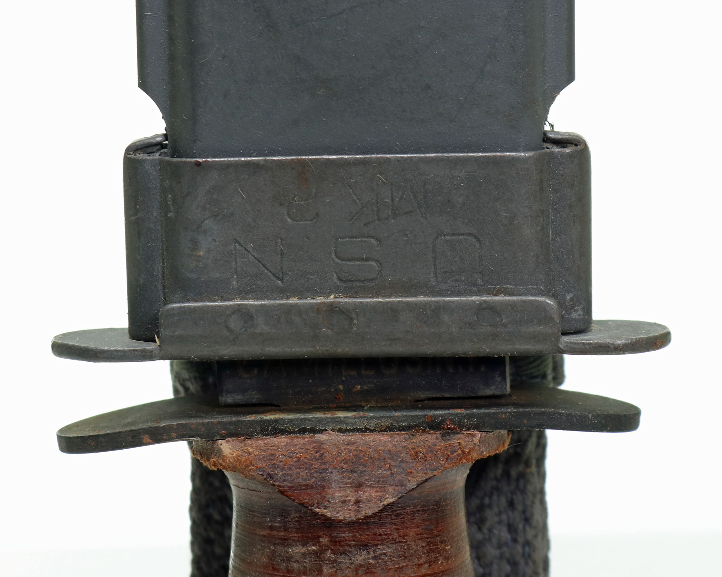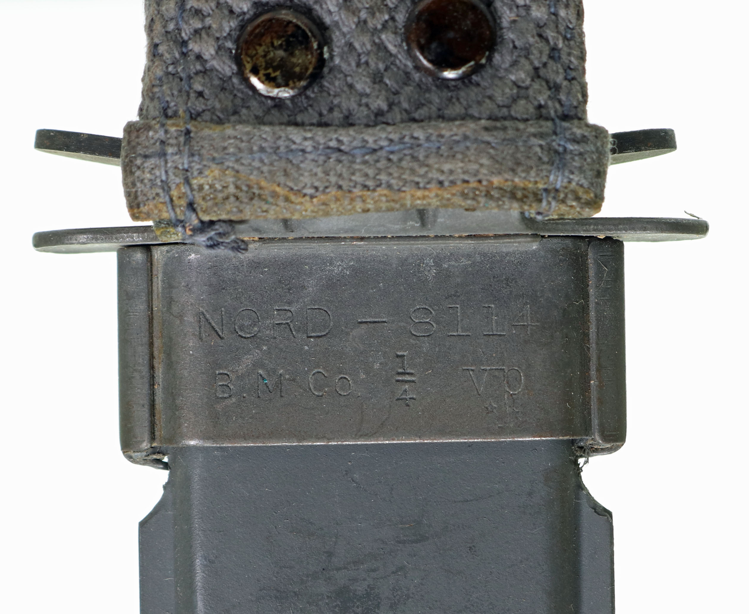 This is a very nice example of a Navy Mark 2 combat knife. The sheath is stamped USN MK2 on one side, the other side NORD – 8114 B.M. Co 1/4 vp. The knife is stamped Camillus N.Y. USN, meaning it was made for the US Navy. The blade shows mostly signs of taking it in and out of the sheath, otherwise very nice. Please refer to the photos for additional details.