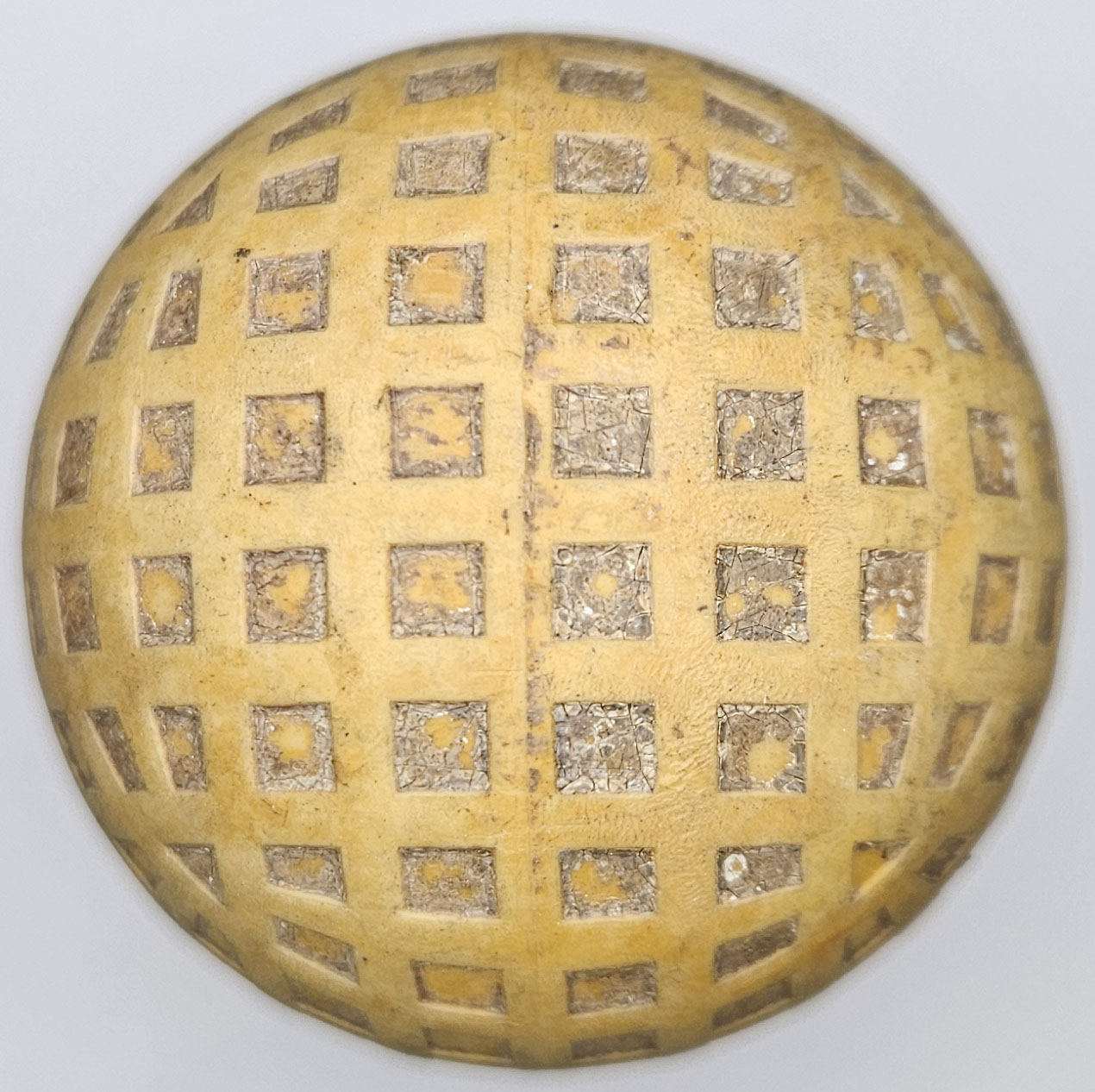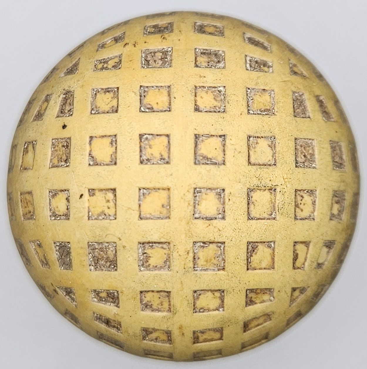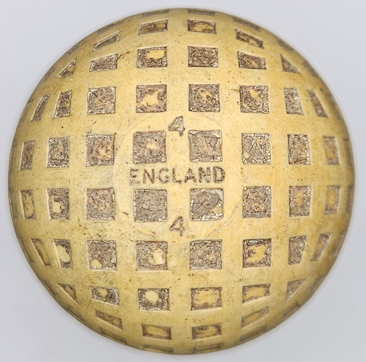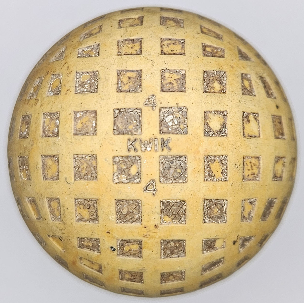 This is an antique mesh pattern golf ball called Kwik, circa 1930’s. The model name is on one pole and England on the other pole. Each pole also features the number 4 twice. Nice, consistent patina on the surface. Please refer to the photos.