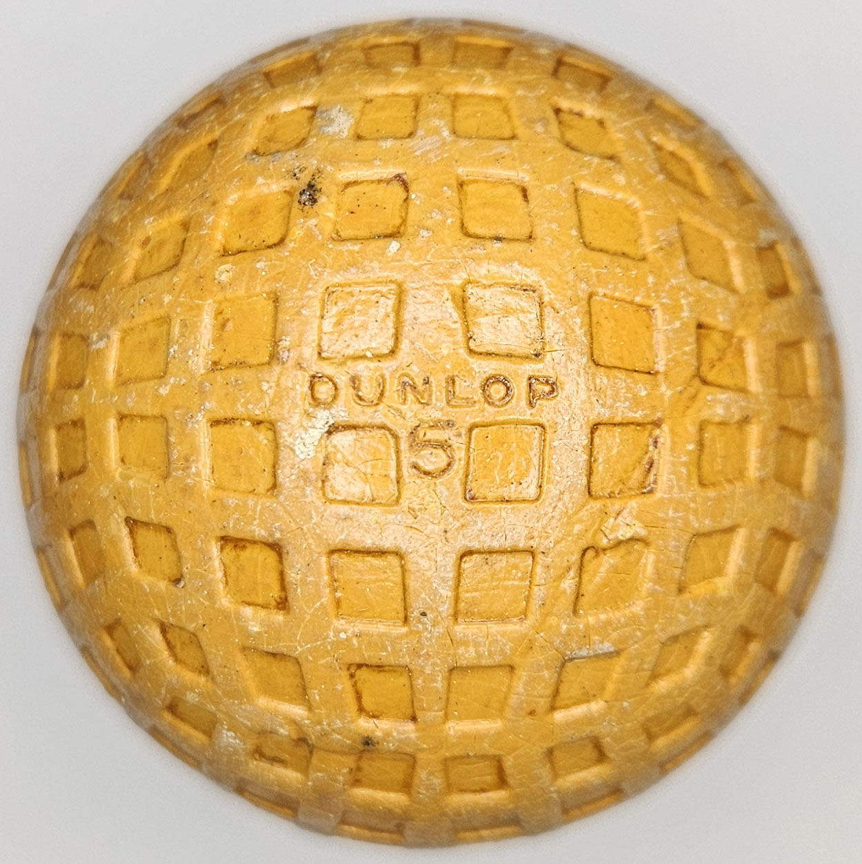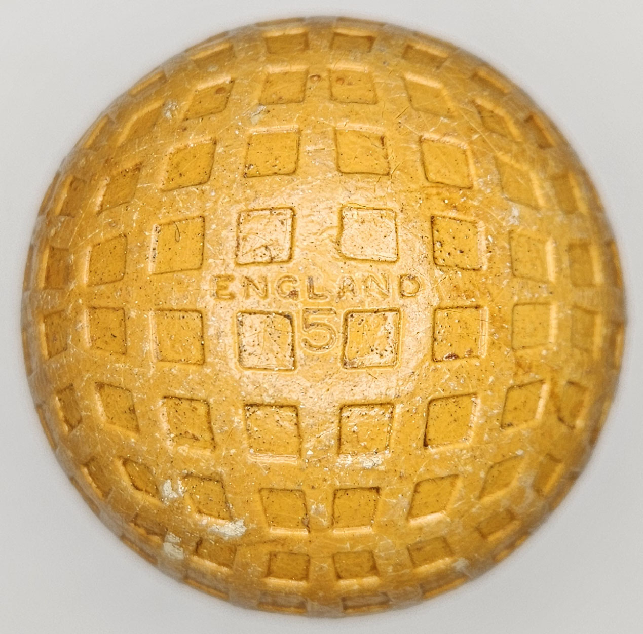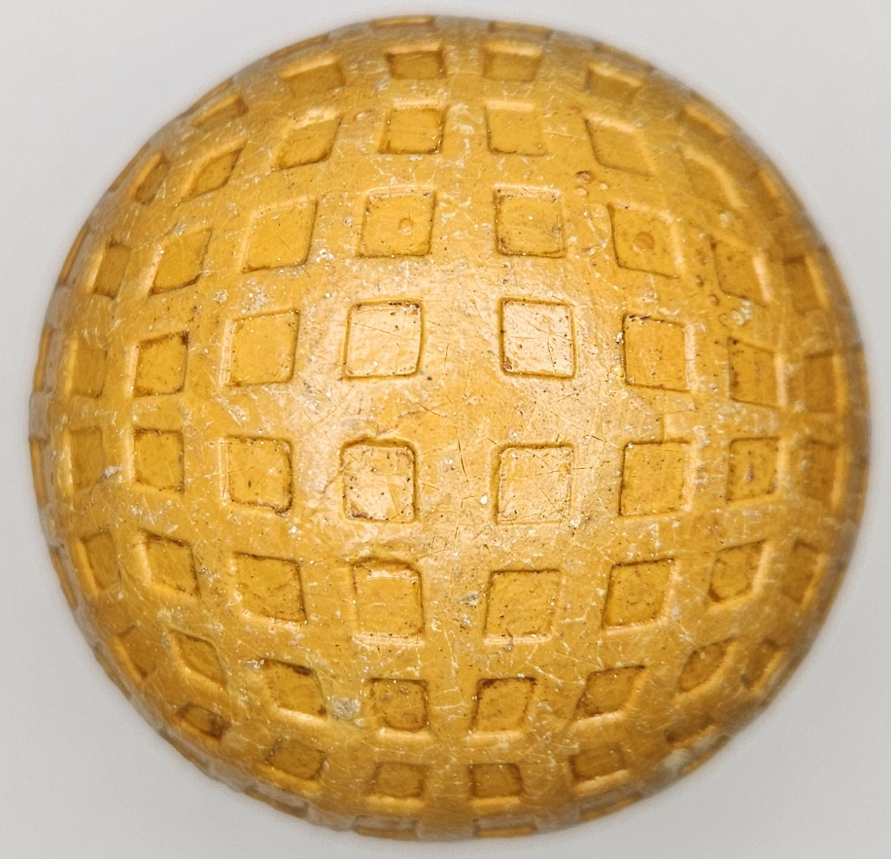 This is an antique mesh pattern golf ball made by Dunlop, circa 1930’s. Dunlop is on one pole and England on the other pole with the number 5 below each. This ball features a unique mesh pattern with varying sizes of squares and rectangles. Only a few spots of chipping to the white; otherwise, it has a nice, consistent patina on the surface. Please refer to the photos.