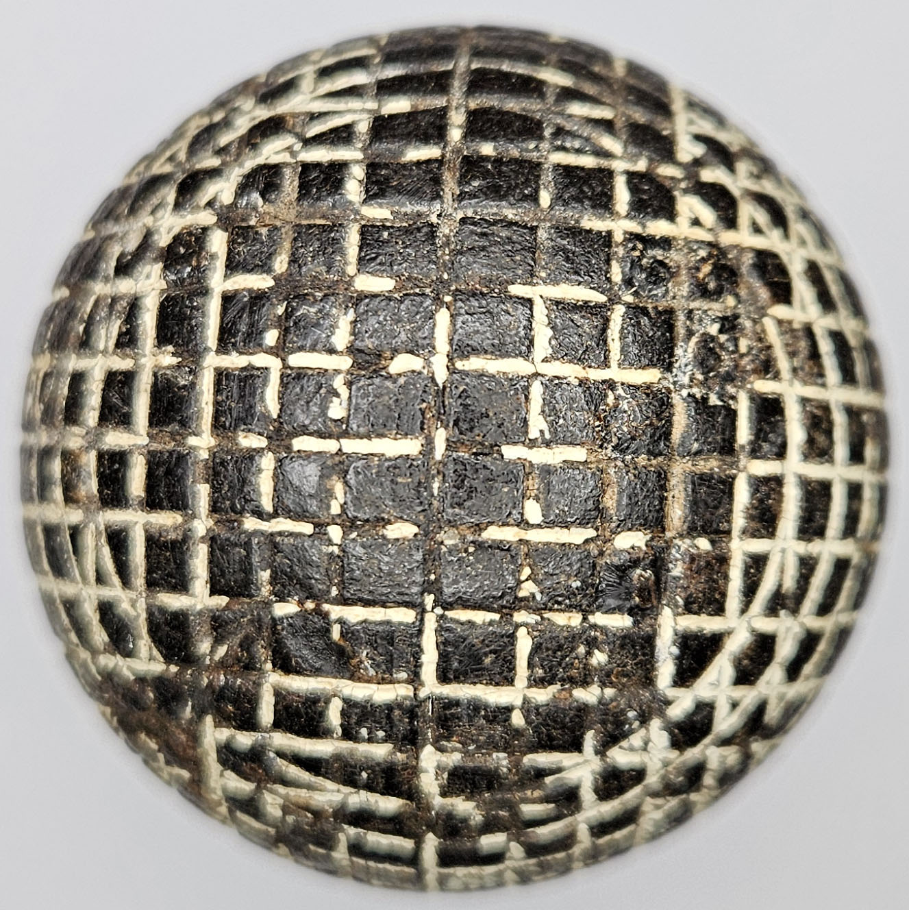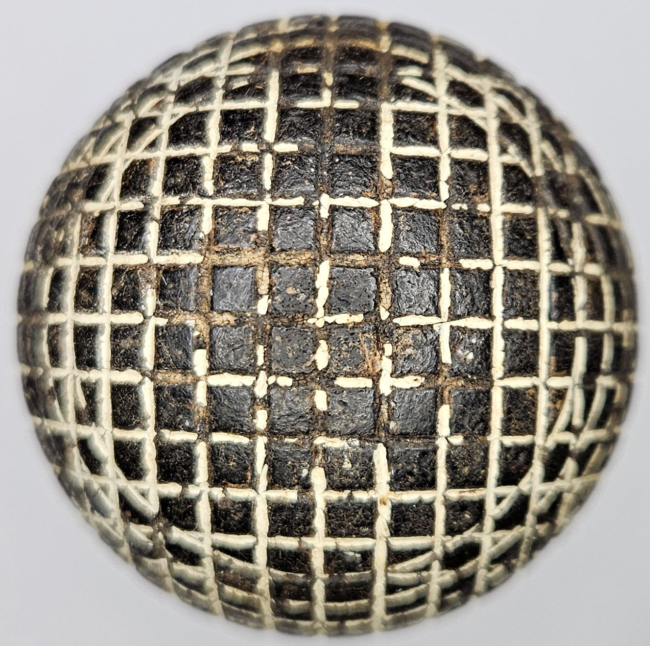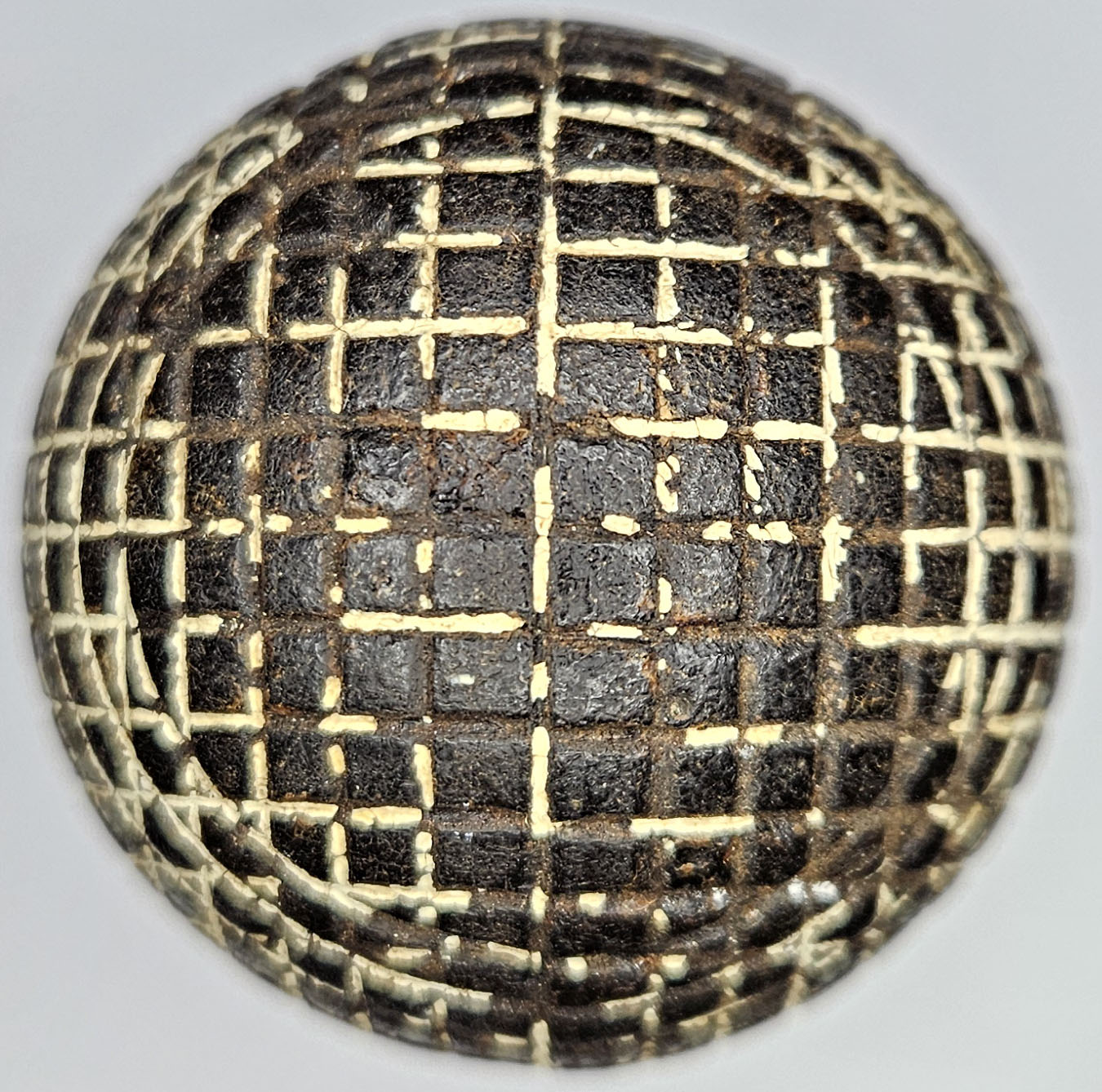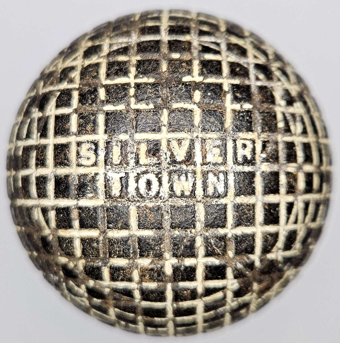 This is an antique mesh pattern gutty golf ball made by Silvertown, circa 1890’s. Silver Town is on one pole. This gutta percha ball was made by Gutta Percha Co in London. There are a few shallow imperfections, otherwise nice. Please refer to the photos.