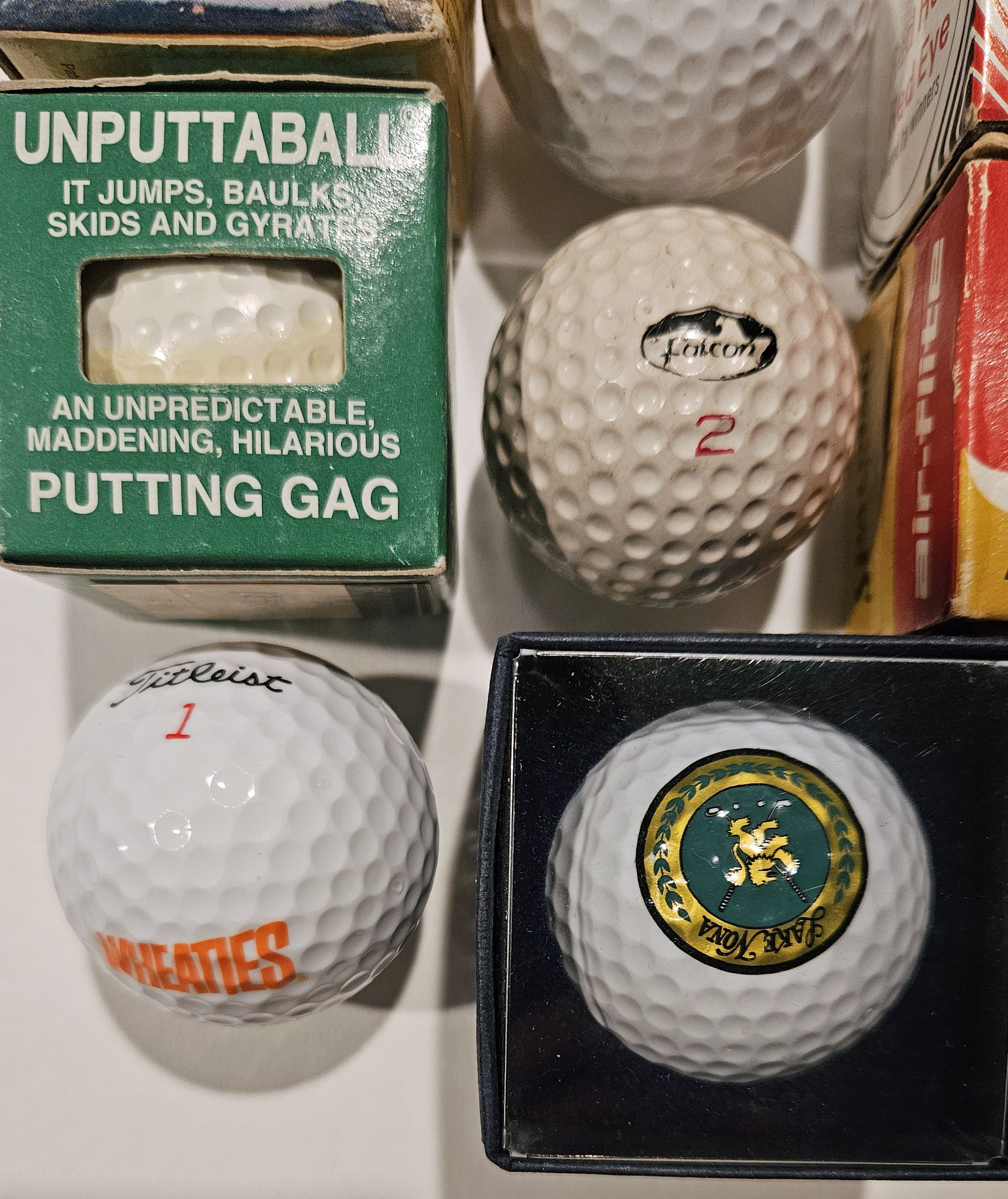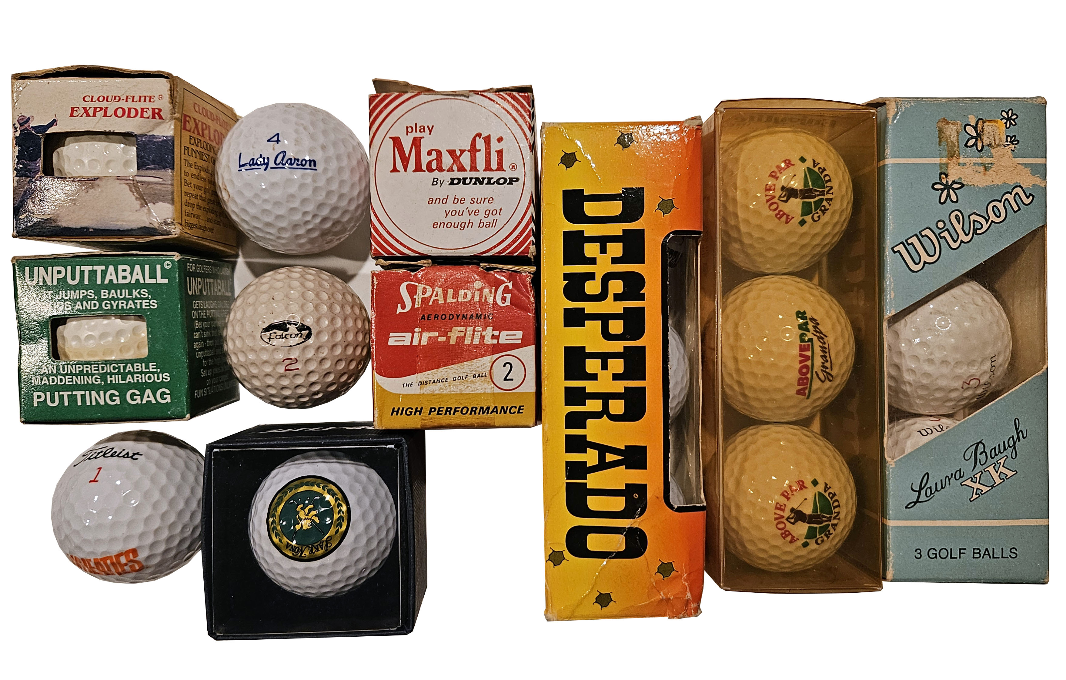 This lot features seventeen golf balls, all in excellent like new condition. The lot includes 3 Special Occasion Above Par Grandpa, 3 Desperado, 3 Wilson Laura Baugh XK, 1 Unputtaball, 1 Cloud-Flite Exploder, 1 Spalding Air-Flite, 1 Maxfli, 1 Top-Flite with Lake Nona logo, 1 Lady Aaron Surlyn, 1 Falcon, 1 Titleist Wheaties logo. Please refer to the photos.