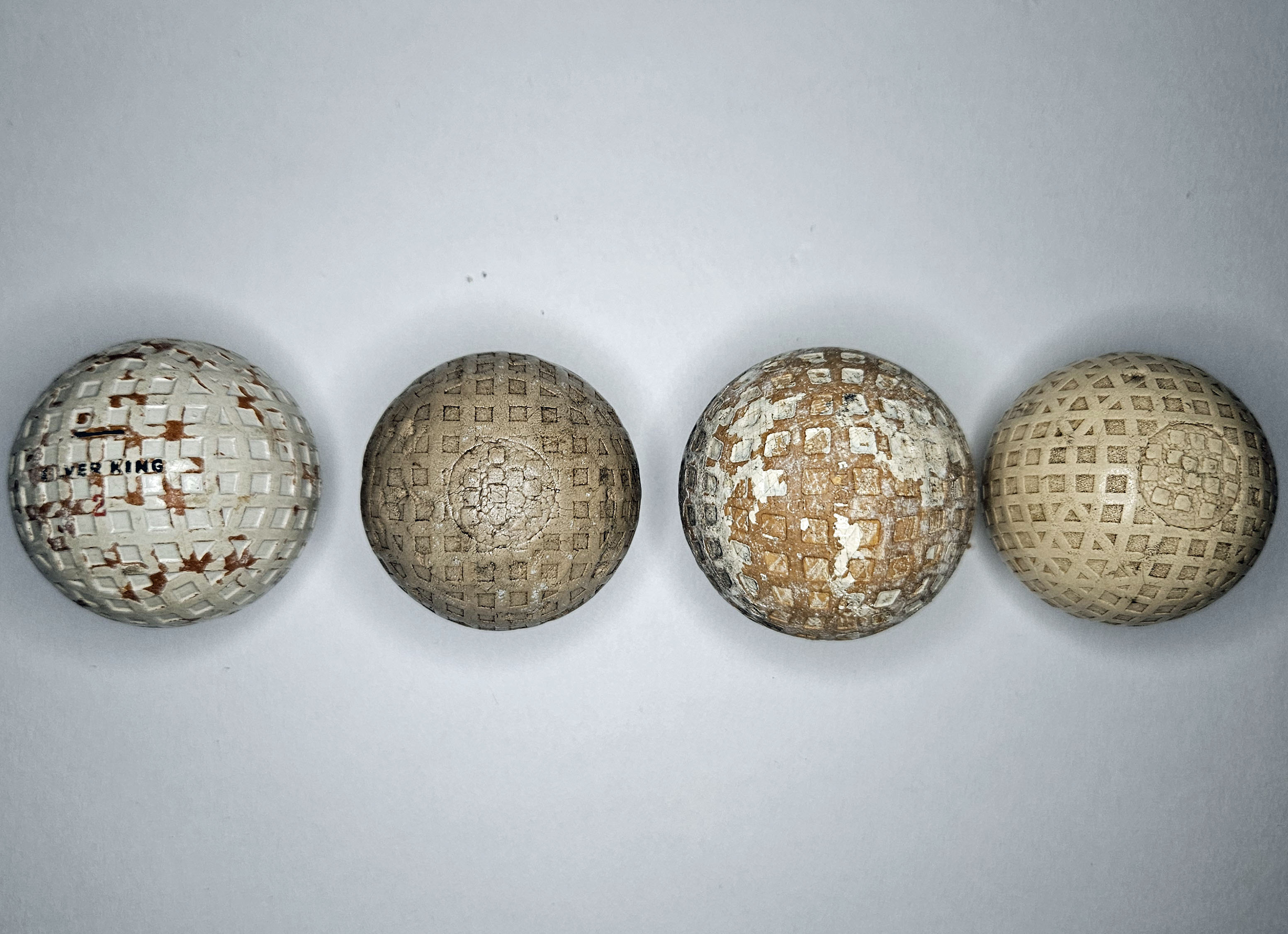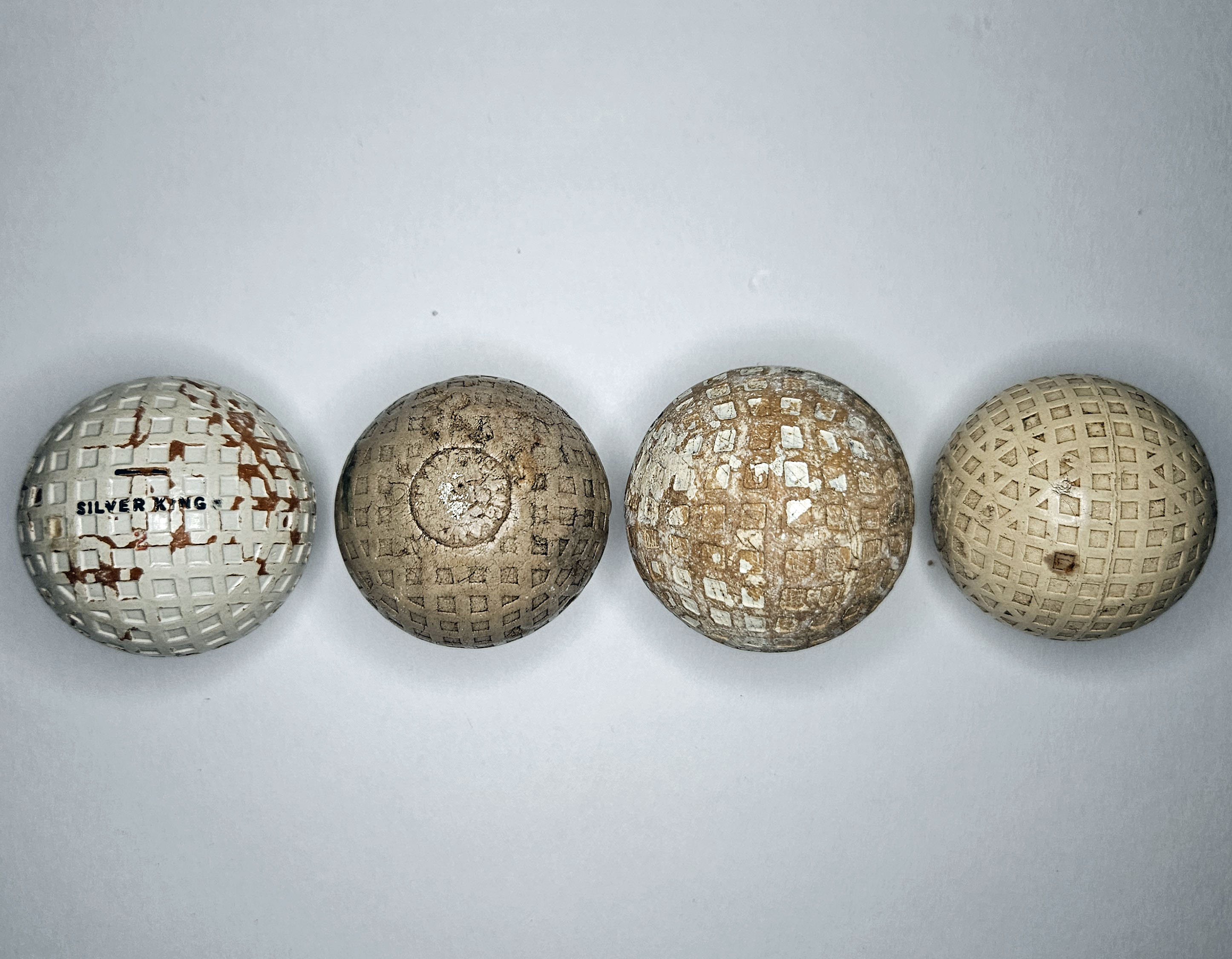 This is a grouping of four antique mesh pattern golf balls circa 1920’s to 1930’s. The collection includes a Silverking, a Made In England stamped ball, Dunlop, and mesh with a mix of square and triangle patterns. Please refer to the photos.