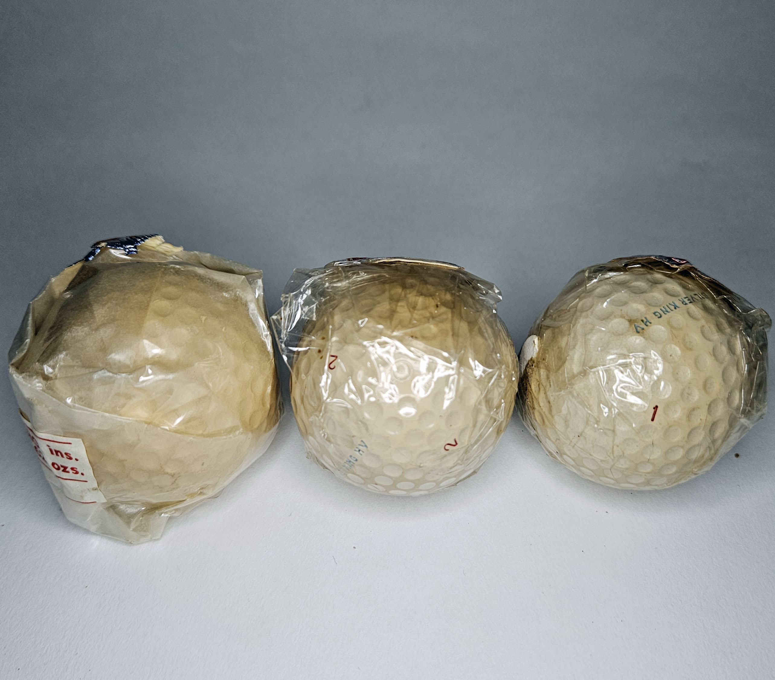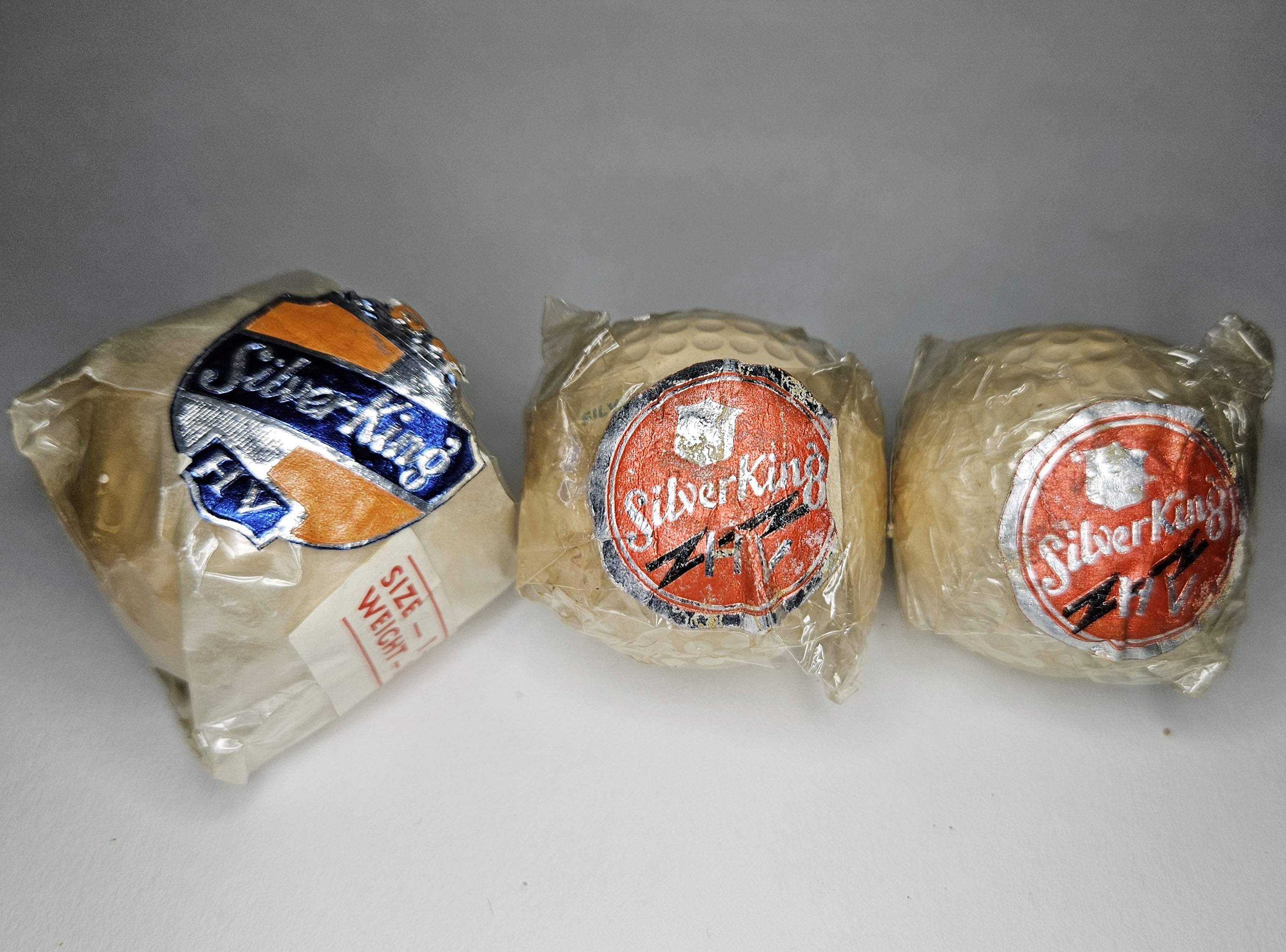This is a grouping of three unopened vintage Silver King HV balls. Each one retains its original wrapper and label. These balls are the round dimple style. Please refer to the photos.