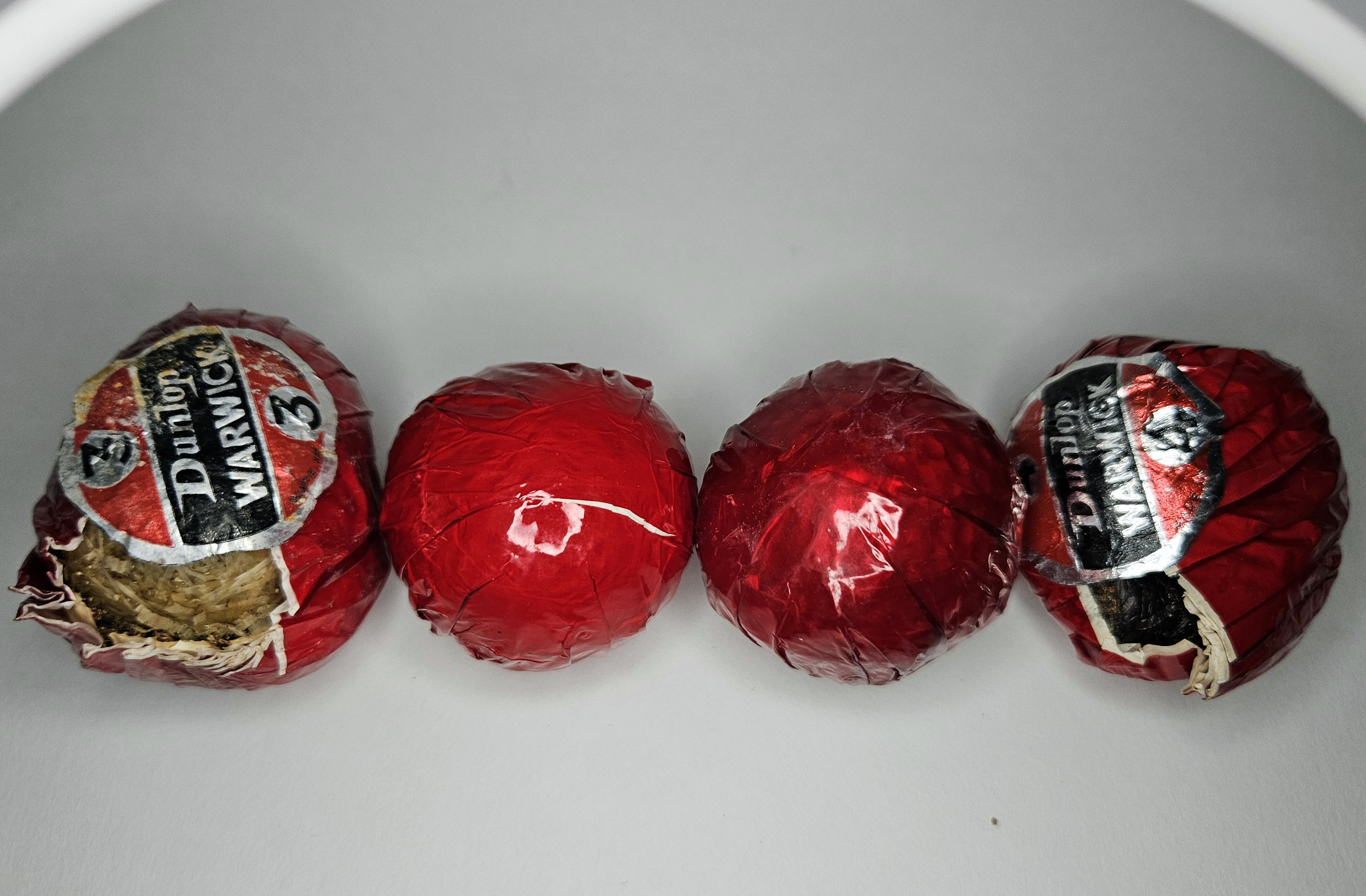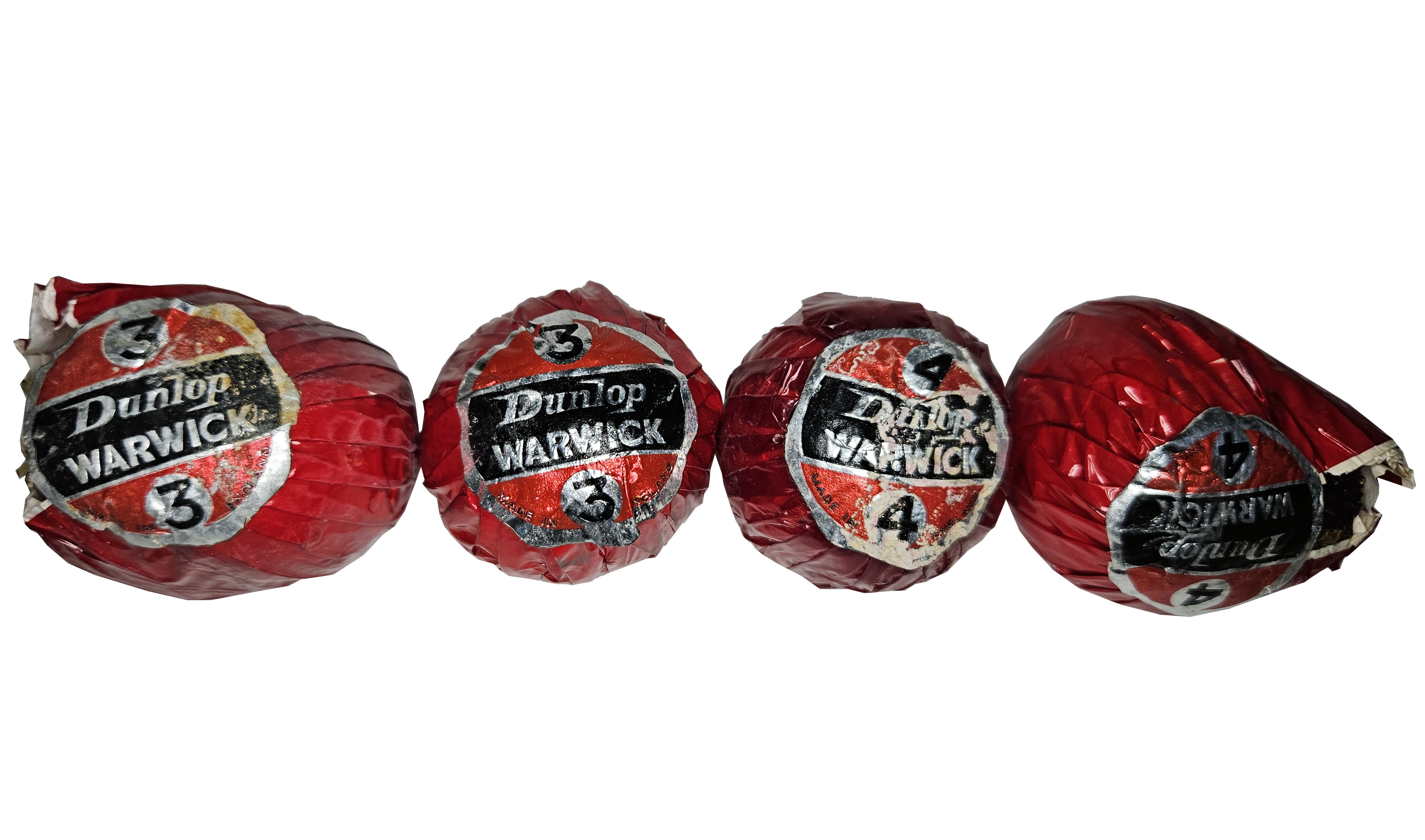 This is a grouping of four vintage Dunlop Warwick golf balls. Each one is in its original red wrapper with label. Two of the balls have deformed. Please refer to the photos.