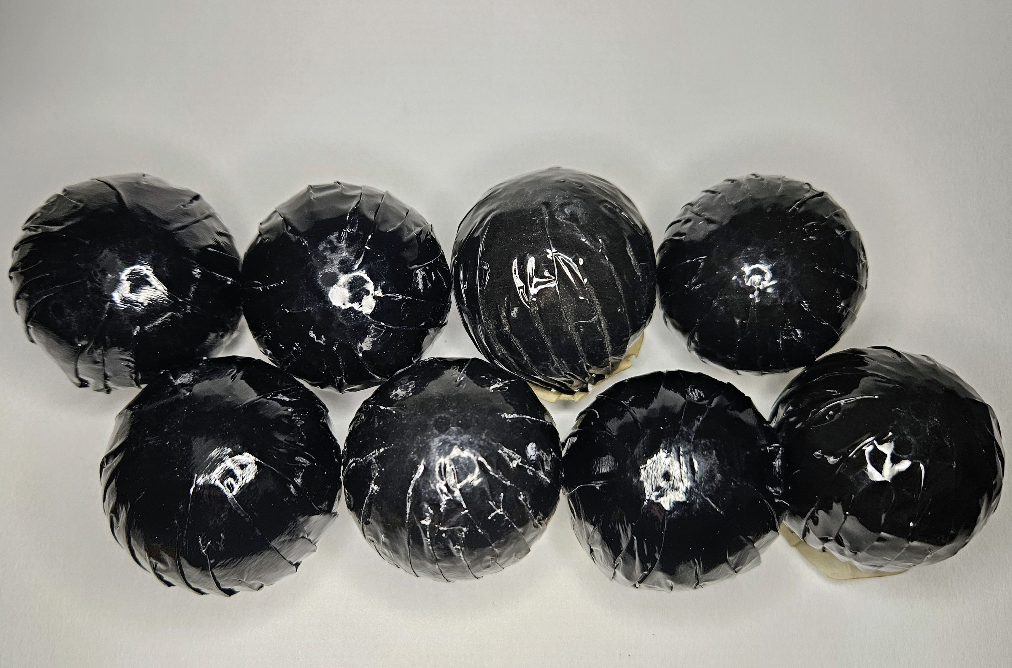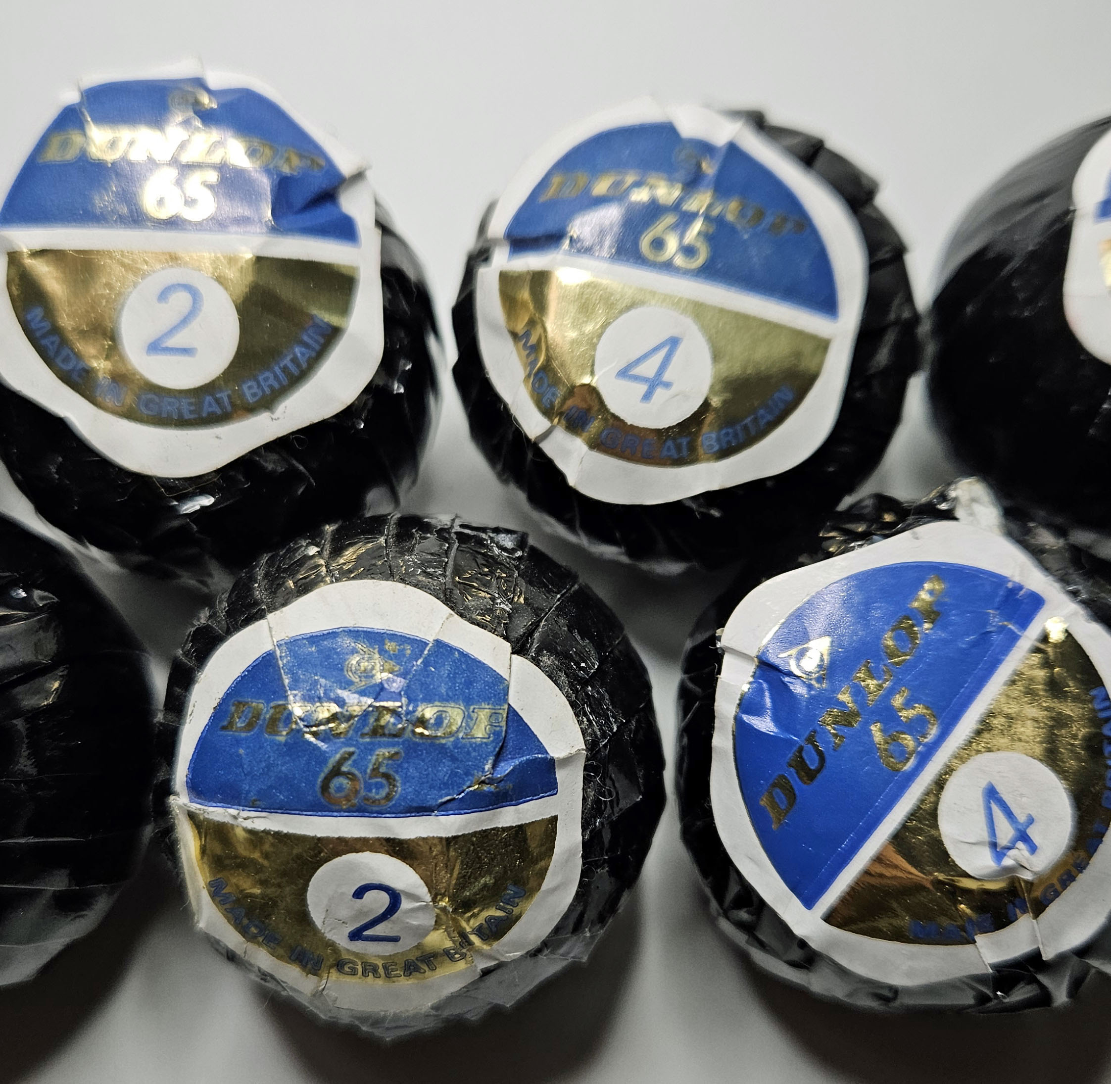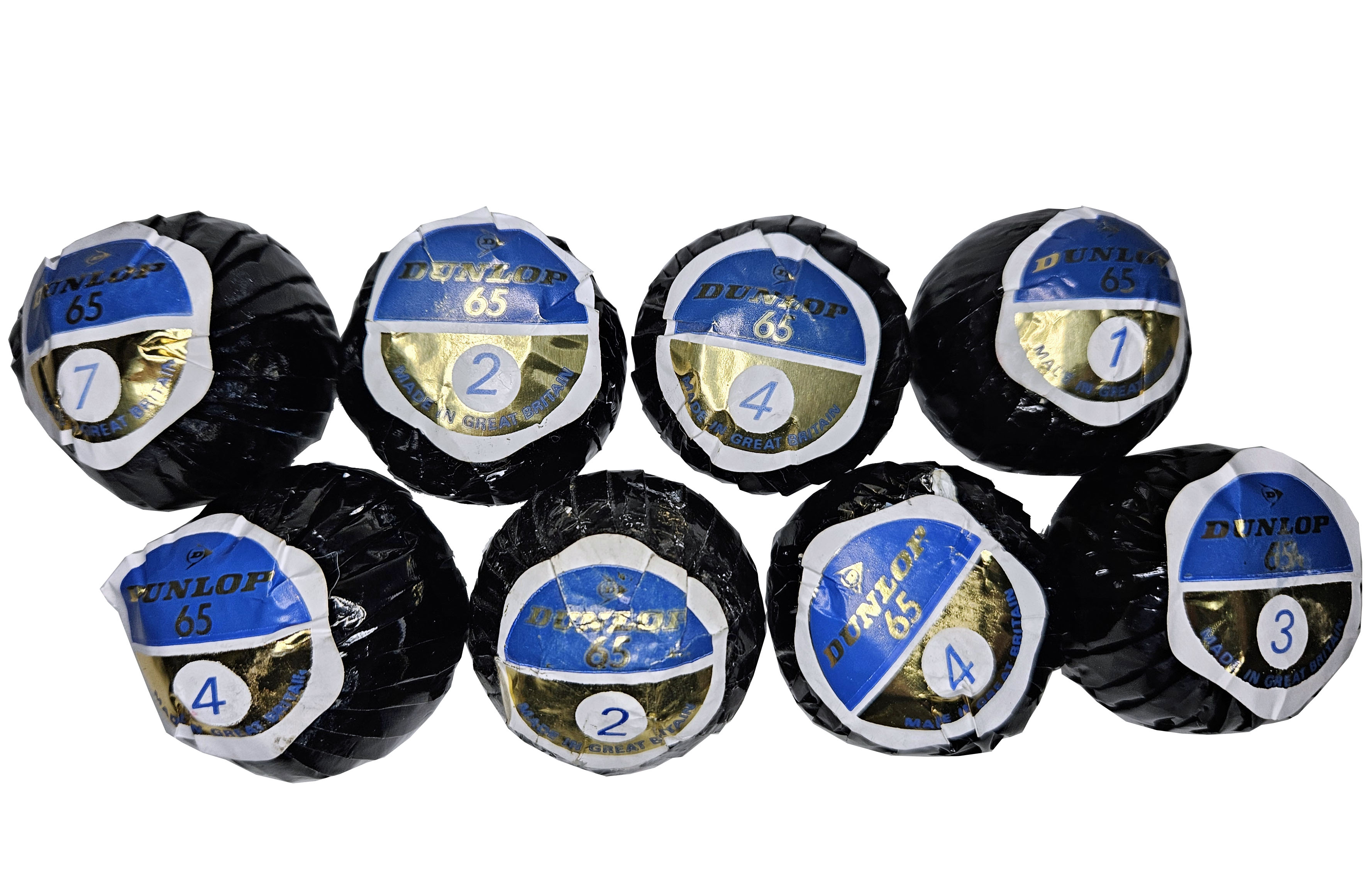 This is a grouping of eight vintage Dunlop 65 golf balls. Each one is in its original black wrapper with label. Balls have obviously not been inspected outside of their wrappers, so condition is unknown. Please refer to the photos.