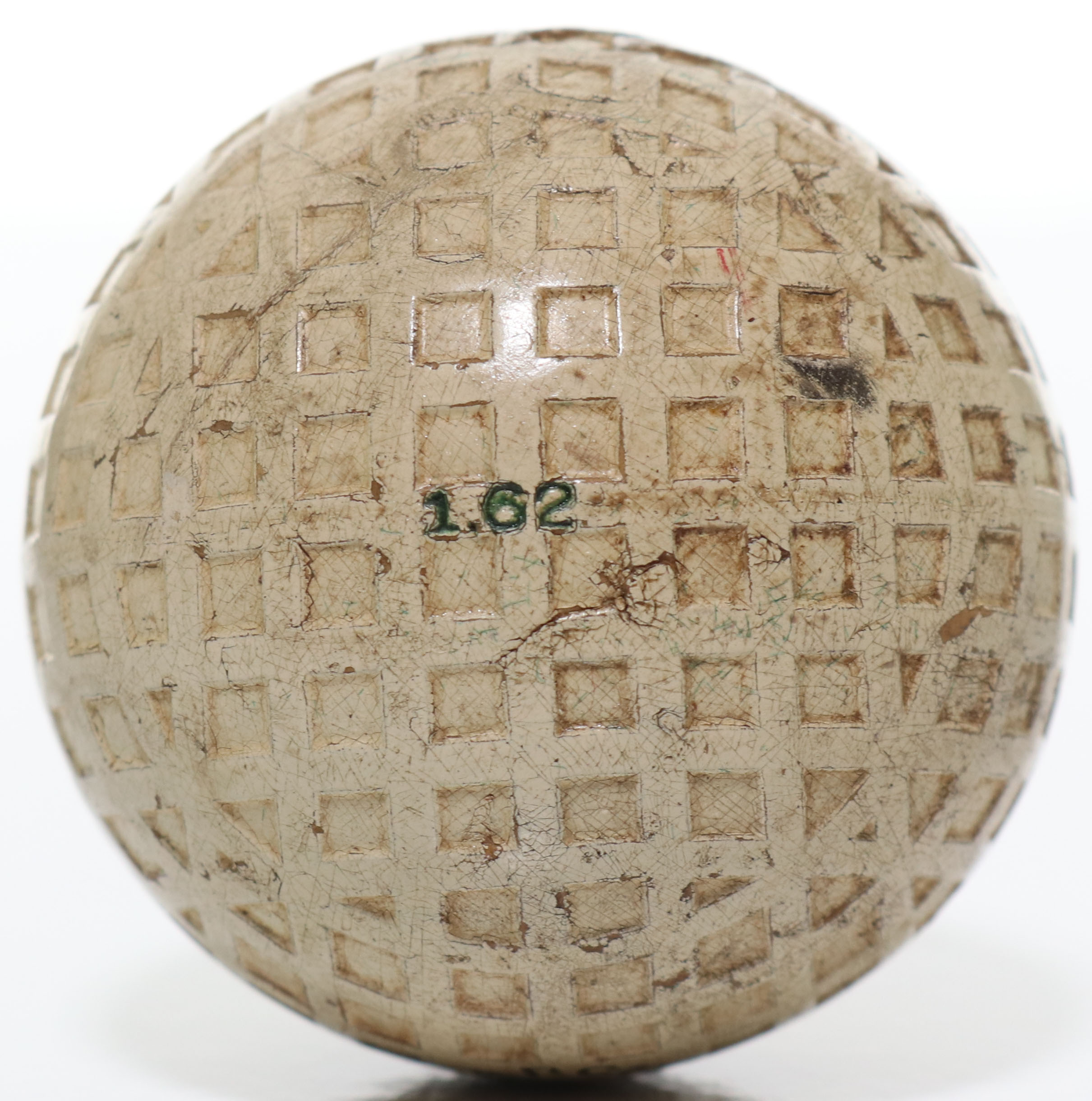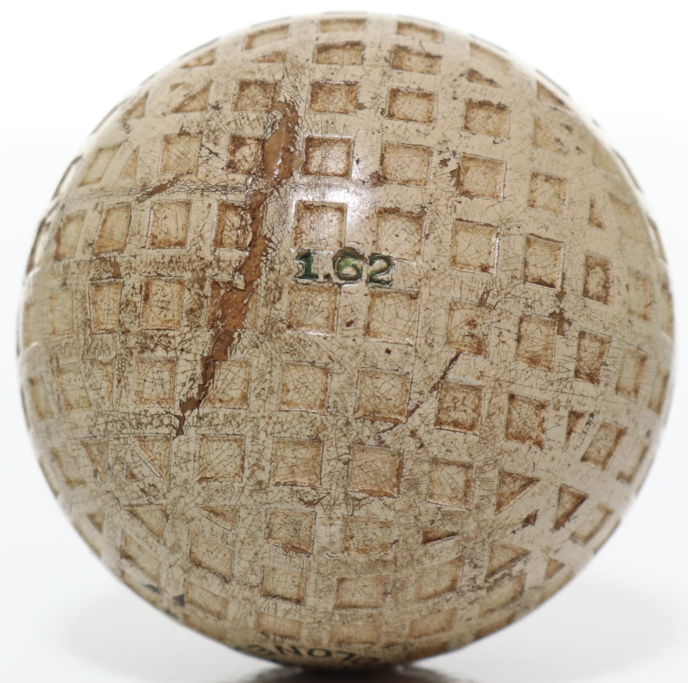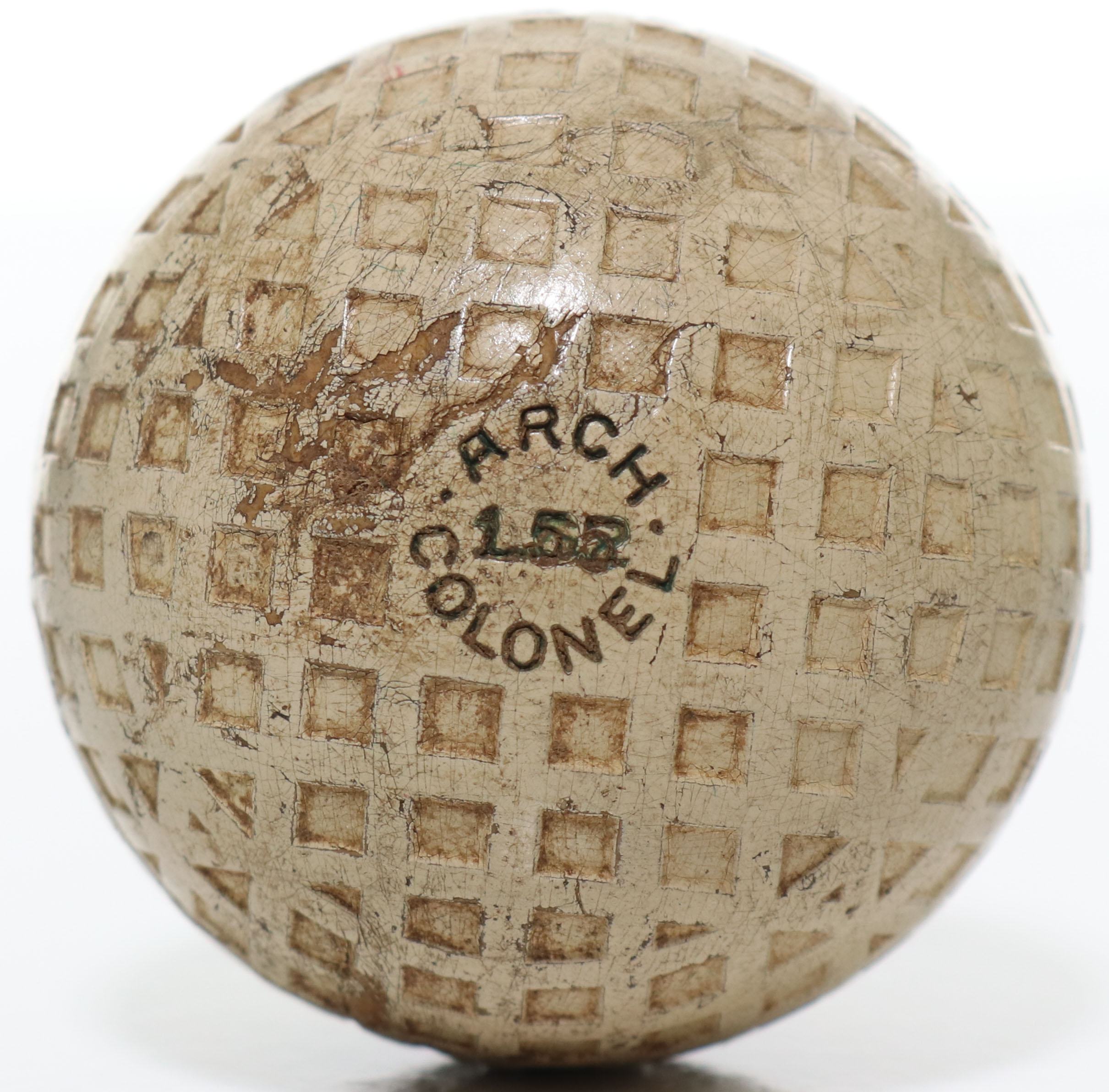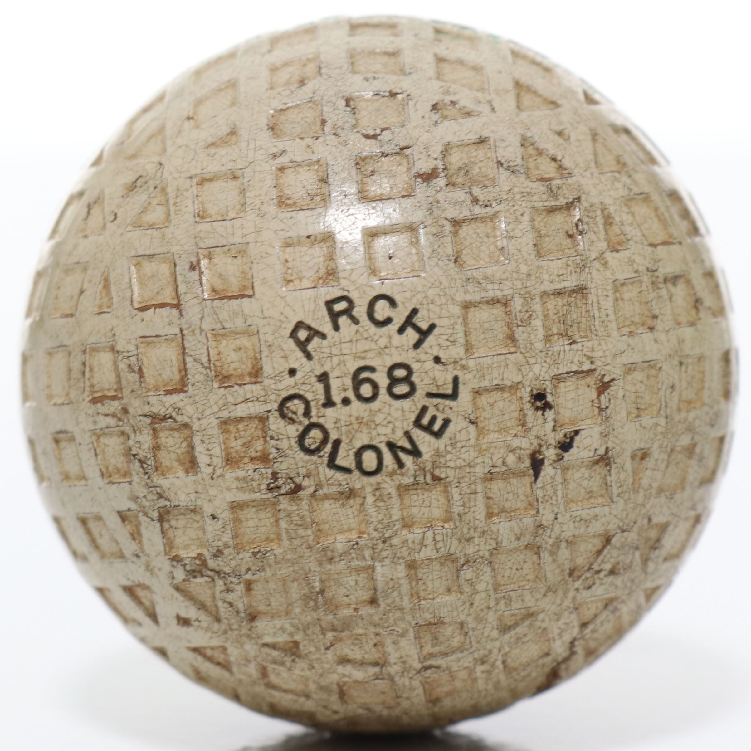 This is an antique mesh pattern golf ball made, model Colonel Arch. It has a 1.68 within the stamped logo and 1.62 on the sides. Please refer to photos for overall condition.