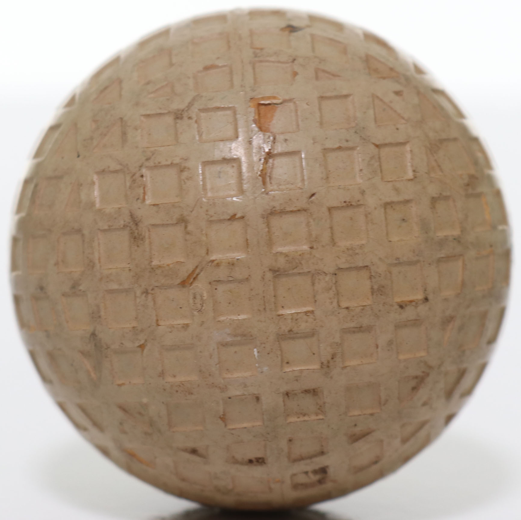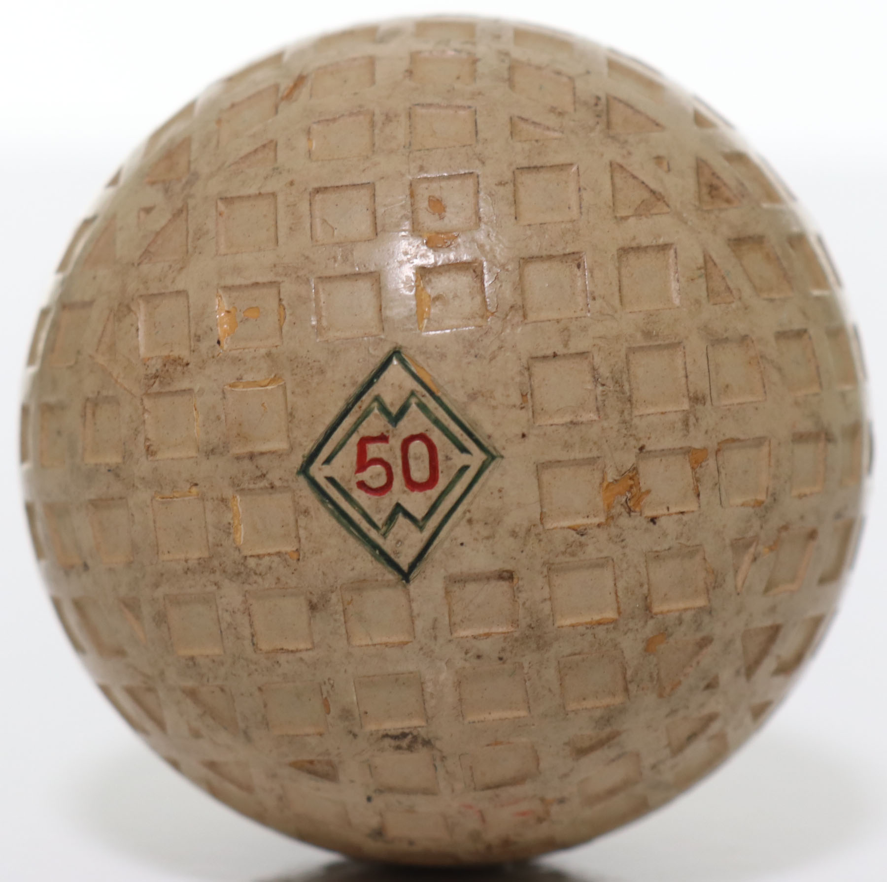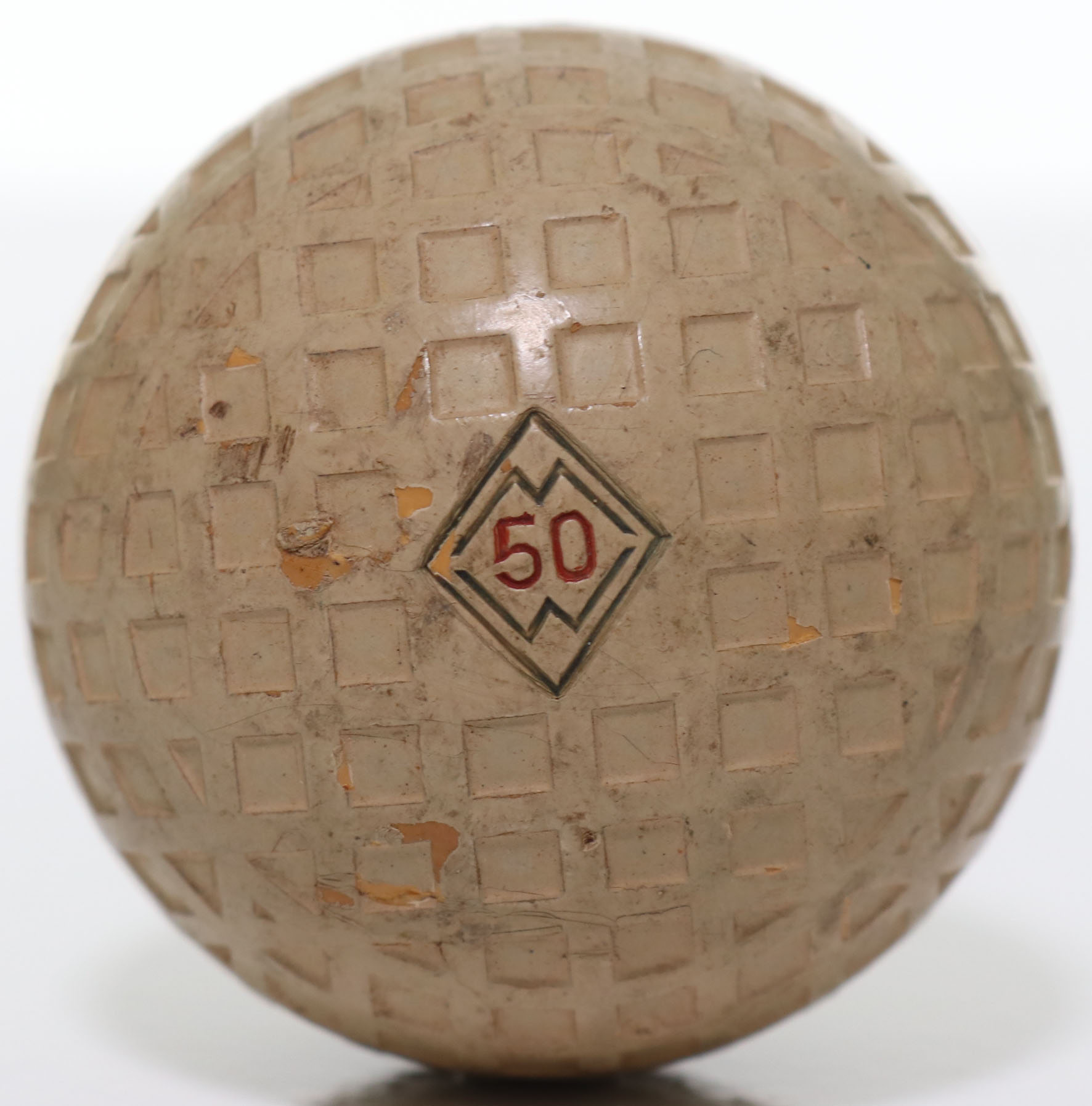 This is an antique mesh pattern golf ball, model 50. Please refer to photos for overall condition.