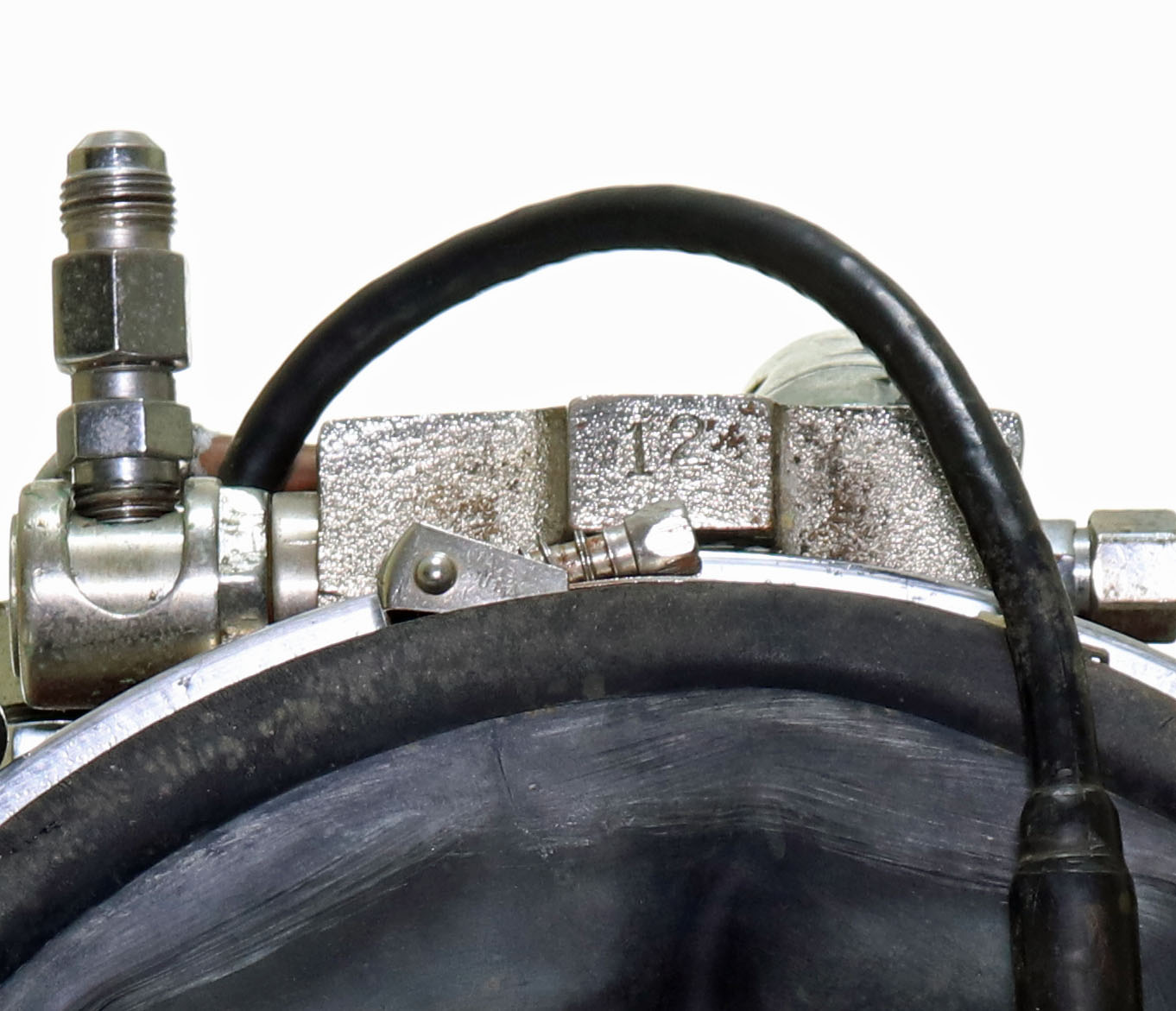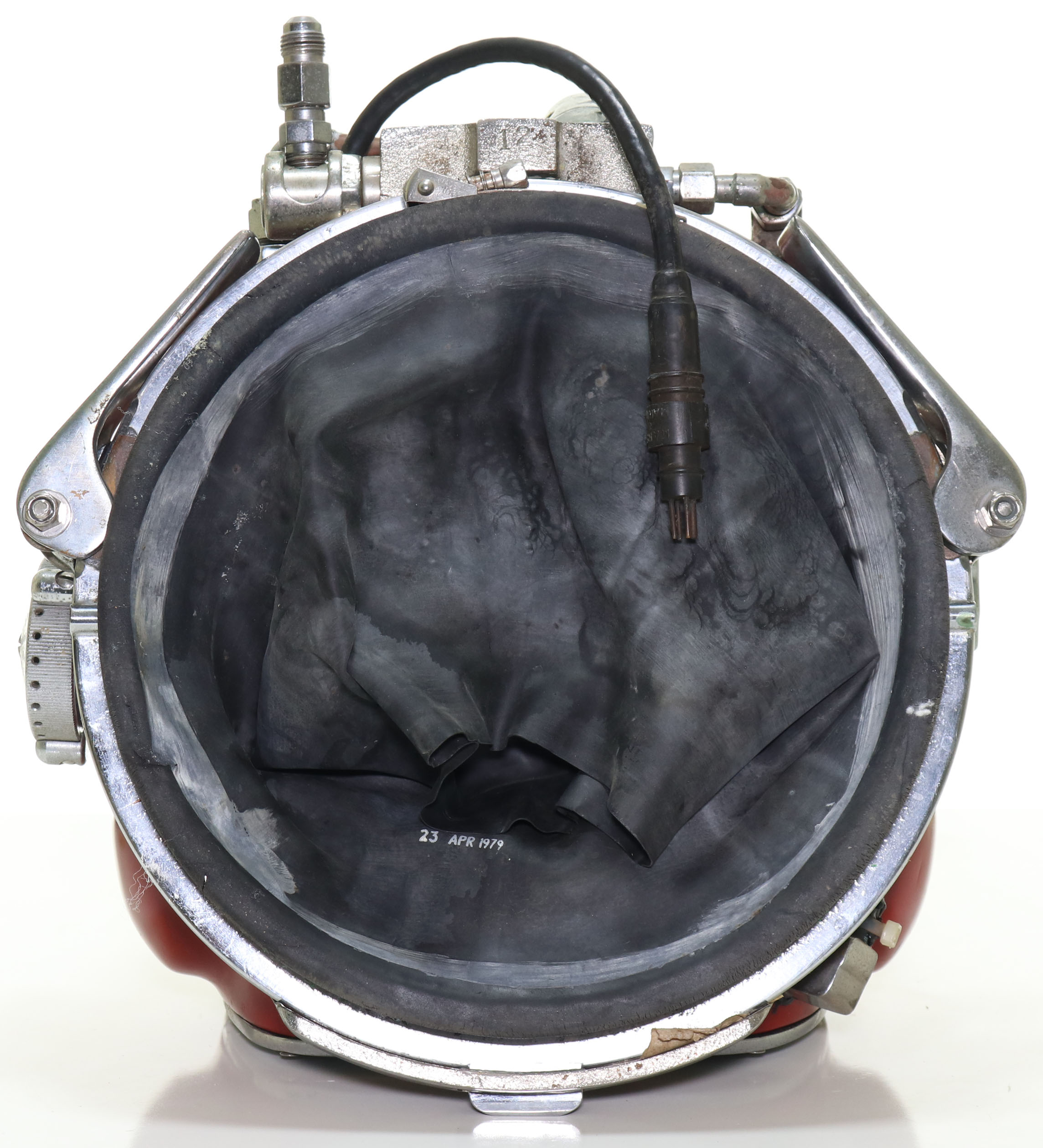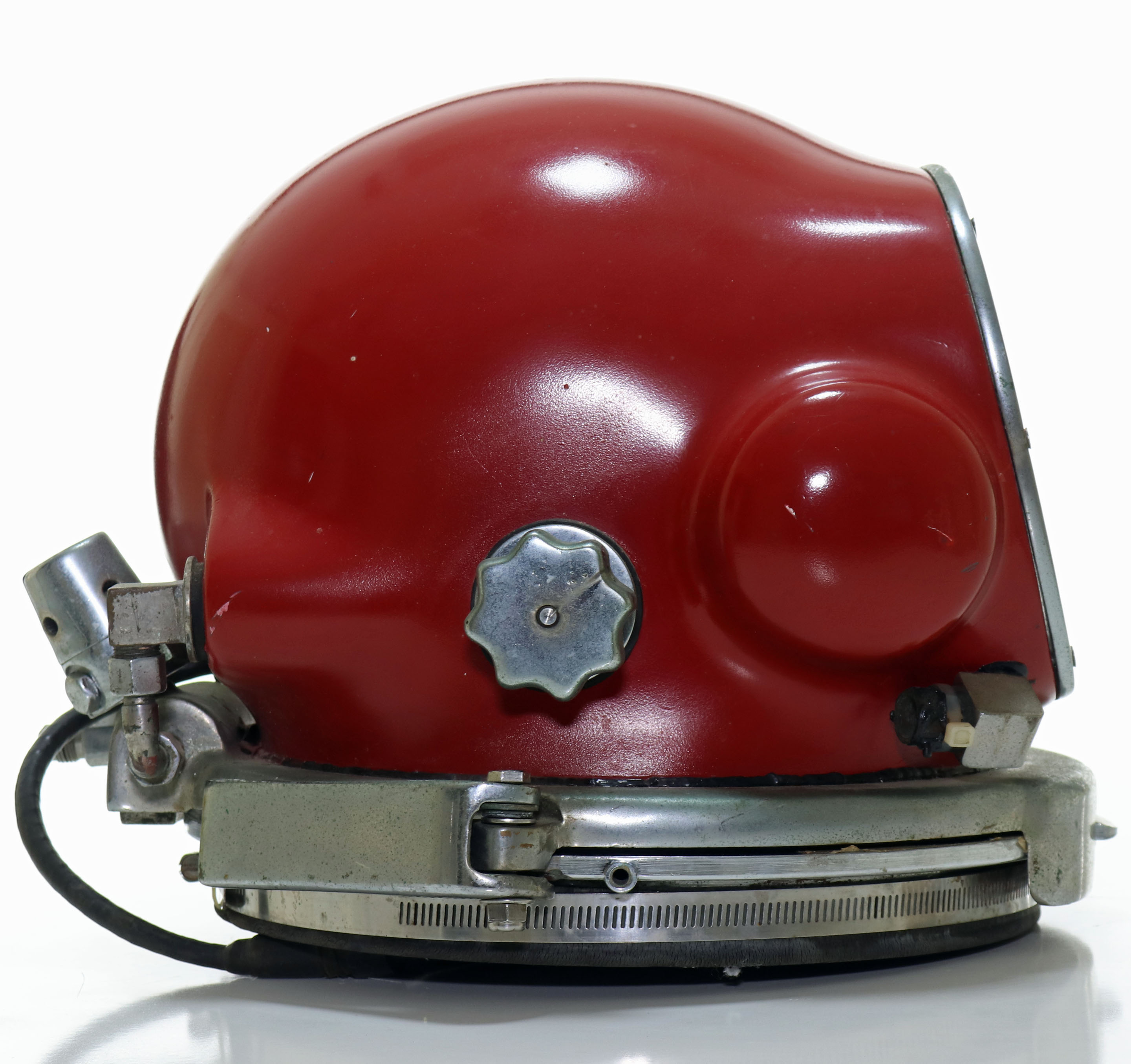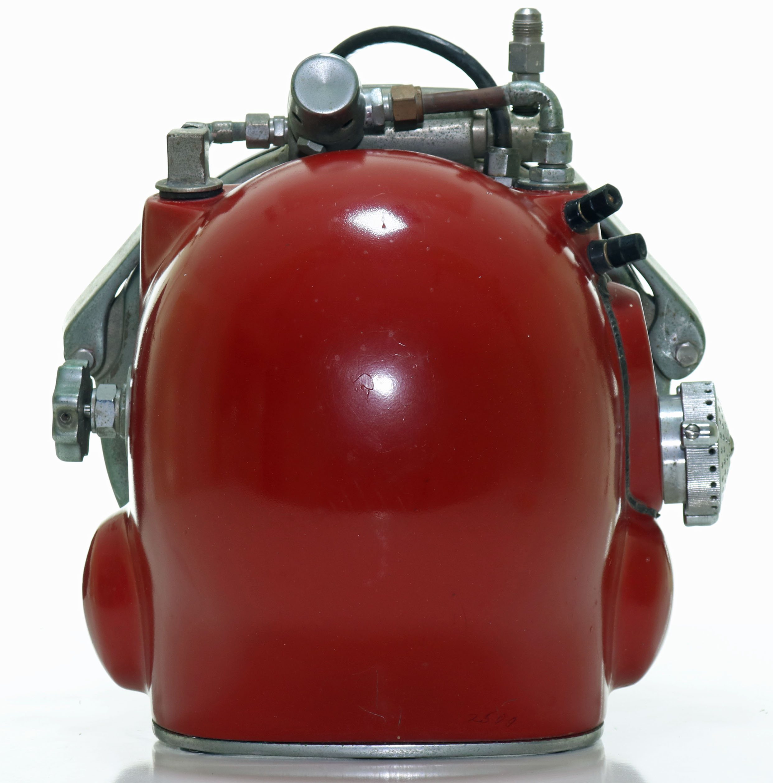 This specific example is in restored condition with a professionally applied red paint job. This example is also a rarely seen early configuration without a carry handle incorporated into it. Of even greater significance, this helmet is serial #12, one of the lowest serial number we have ever handled. This chromed hardware is all in excellent condition with only the most minor signs of age. The neck damn ring may not be the original, but fits nicely. Internal hardware is intact as shown in the photos. This helmet will also come with an original Rat Hat decal and business card. Such an iconic helmet in this condition is worthy of any collection or museum.